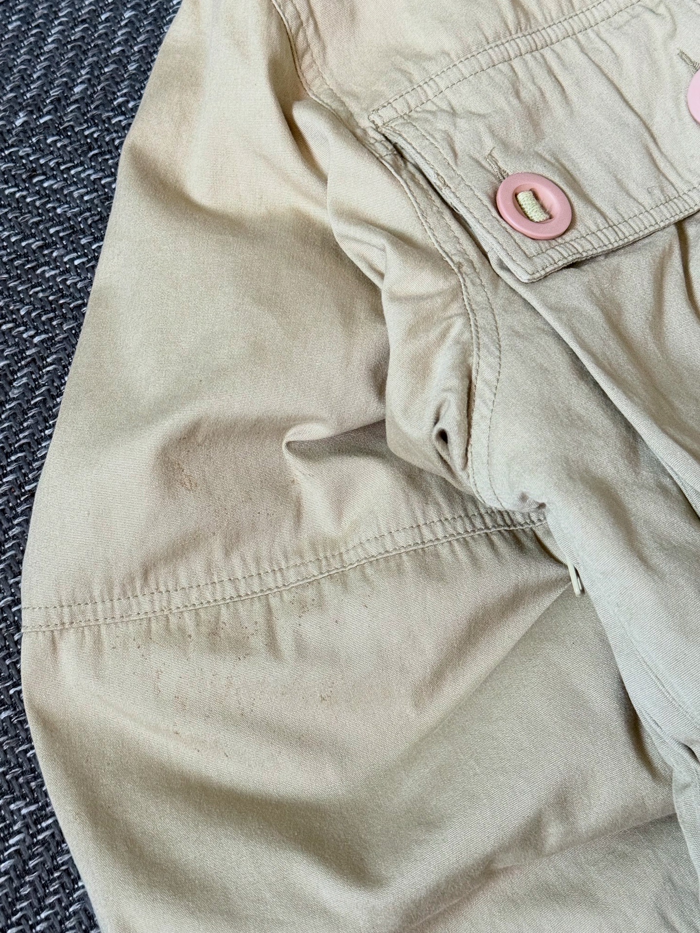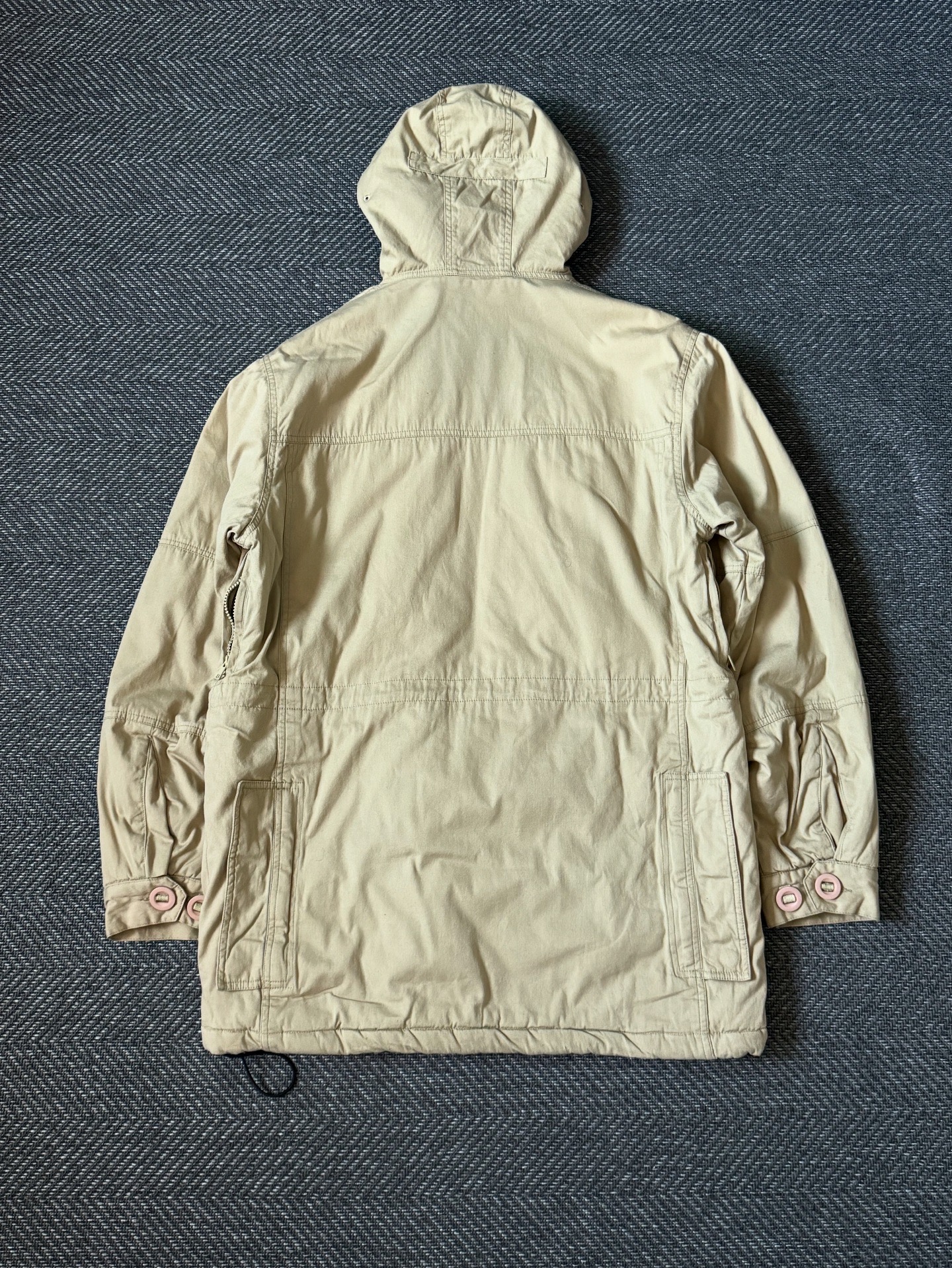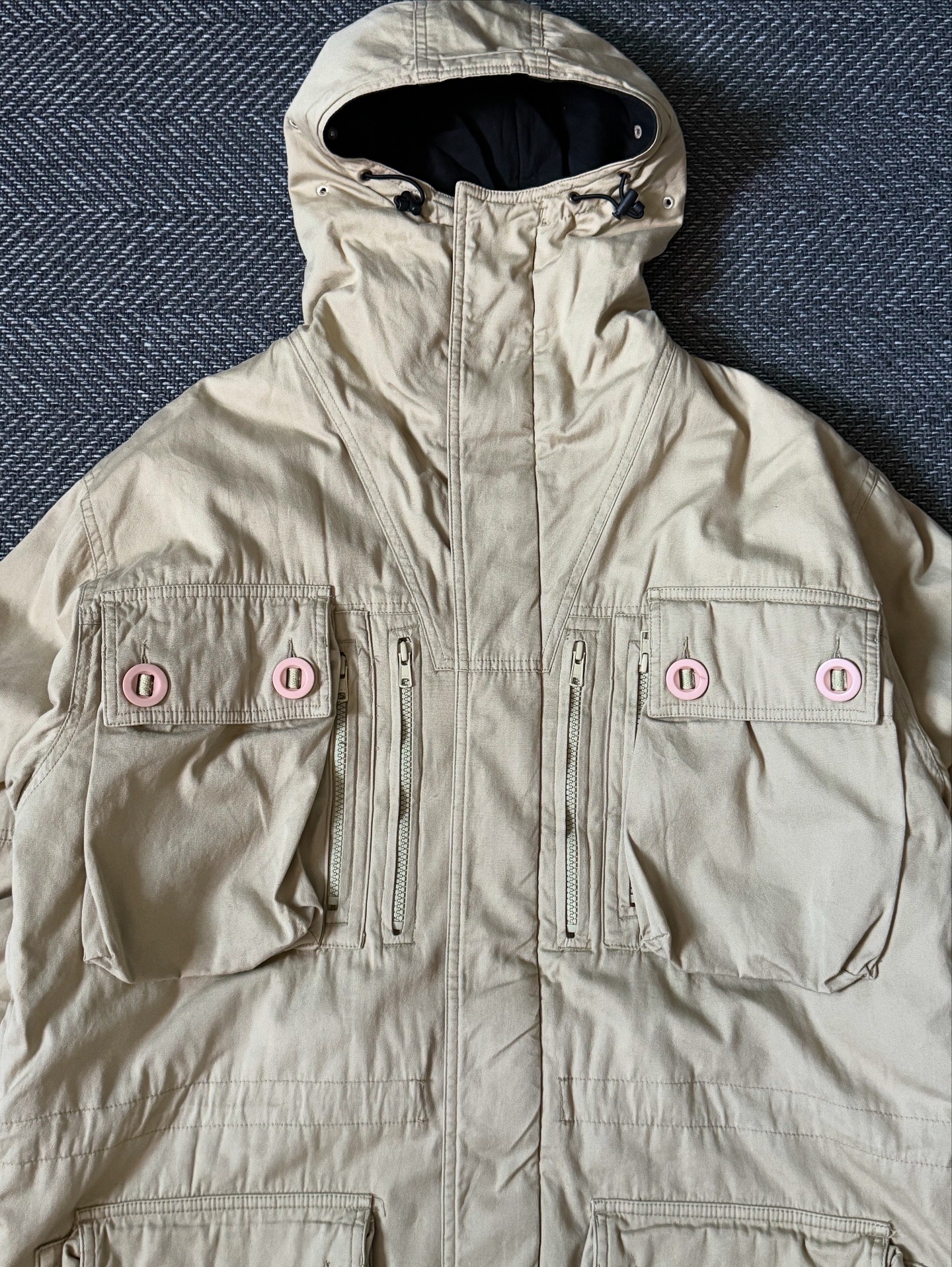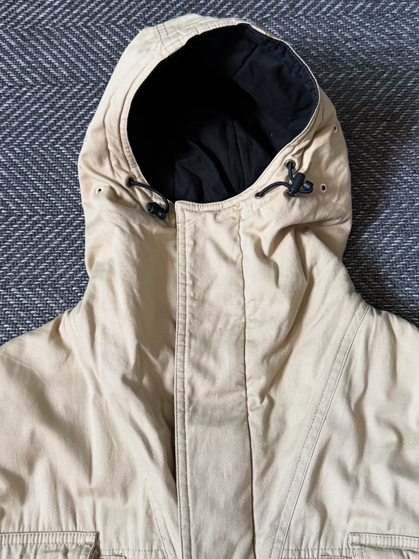 겉감은 100% 코튼 소재로 제작되어 내추럴한 질감을 가지고 있으며, 내부에는 DuPont Thermolite Plus 충전재가 사용되어 가볍지만 뛰어난 보온성을 제공합니다. 후드 일체형 디자인과 4포켓 디테일, 그리고 스냅 버튼 여밈 구조는 밀리터리 필드 자켓에서 영감을 받은 실용적인 구성을 보여줍니다. 베이지 컬러의 바디에 핑크 버튼 포인트가 더해져스투시 특유의 감각적인 컬러 밸런스를 완성하고 있습니다. 전체적으로 형태의 틀어짐 없이 좋은 상태를 유지하고 있으며, 사진상 보이듯 미세한 오염이 존재하지만, 전반적으로 양호한 제품입니다.