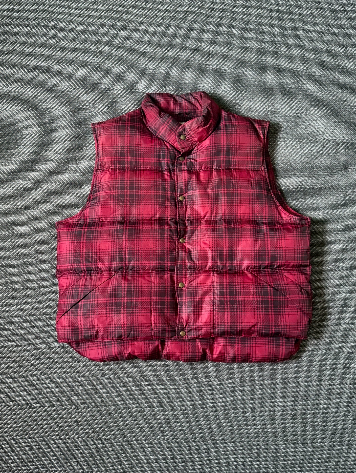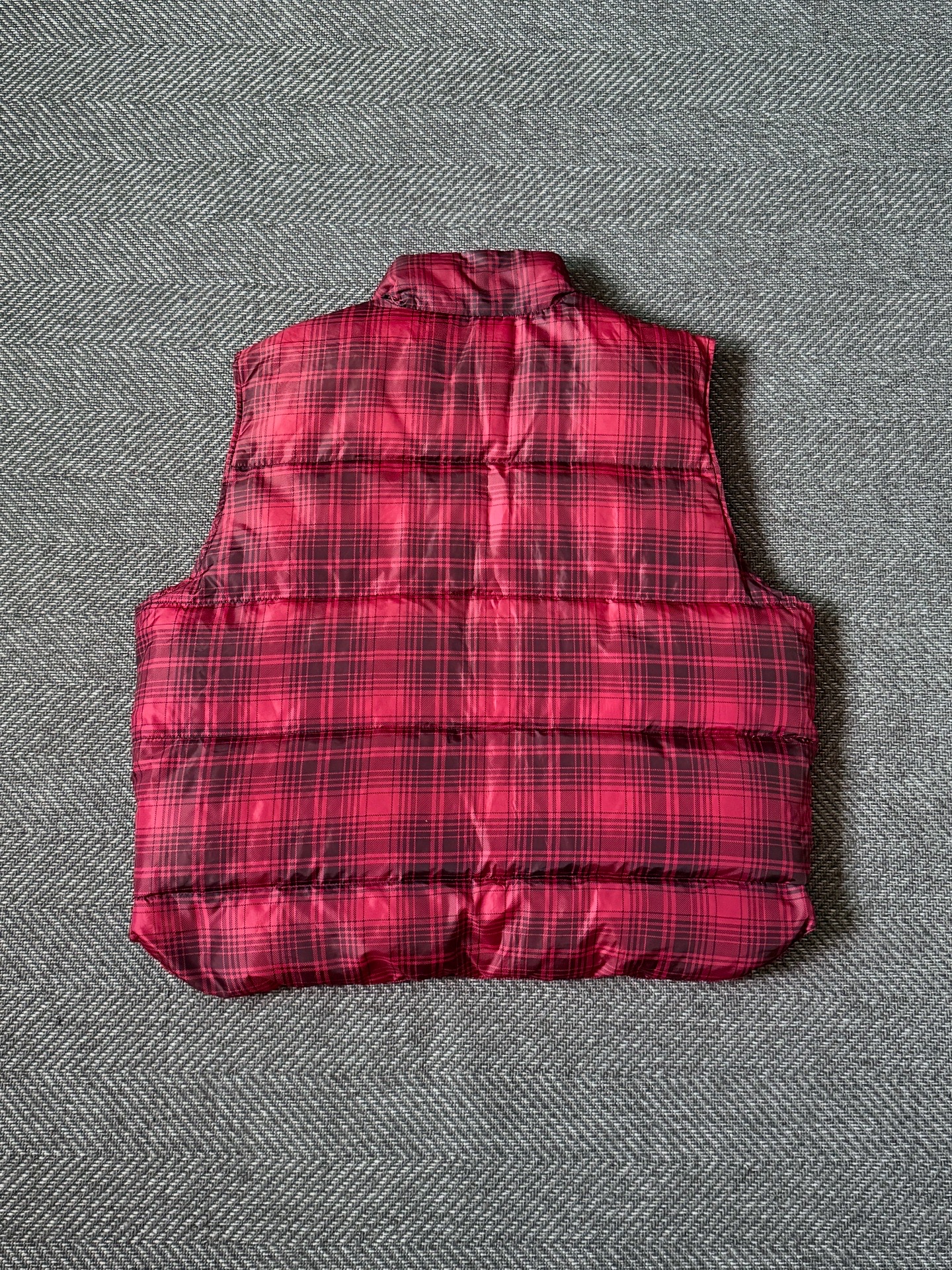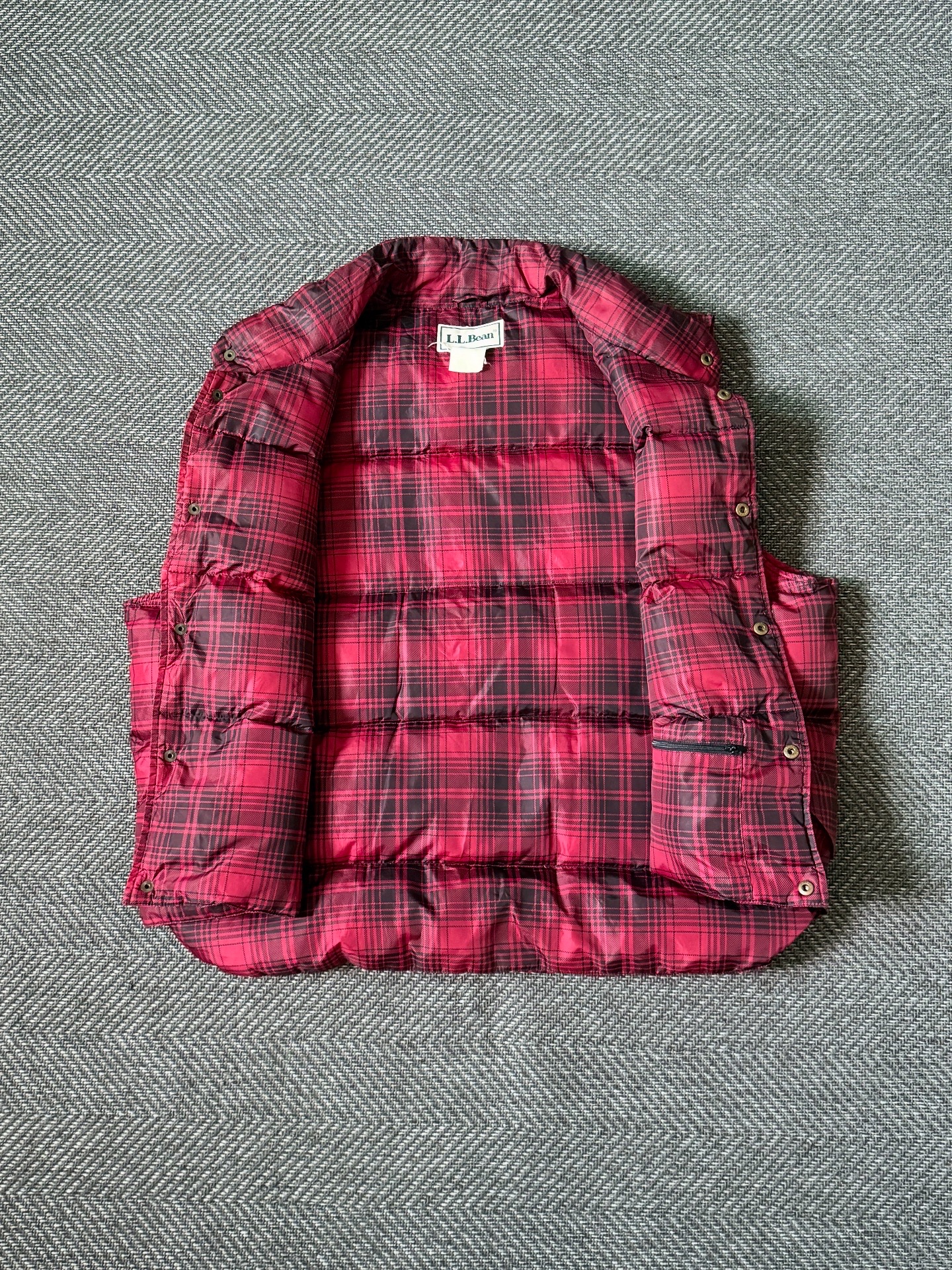 L.L.Bean에서 1980년대 후반에 제작된 Red Tartan Goose Down Vest입니다. 클래식한 레드 타탄 체크 패턴이 돋보이는 모델로, 당시 L.L.Bean의 헤리티지 감성을 잘 보여주는 빈티지 아이템입니다.