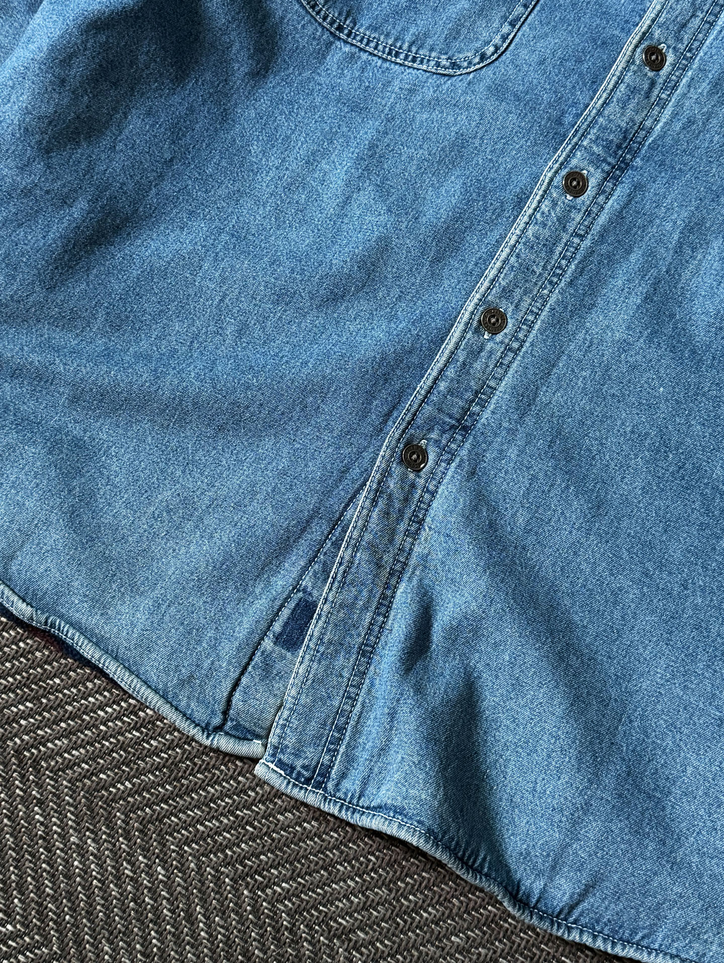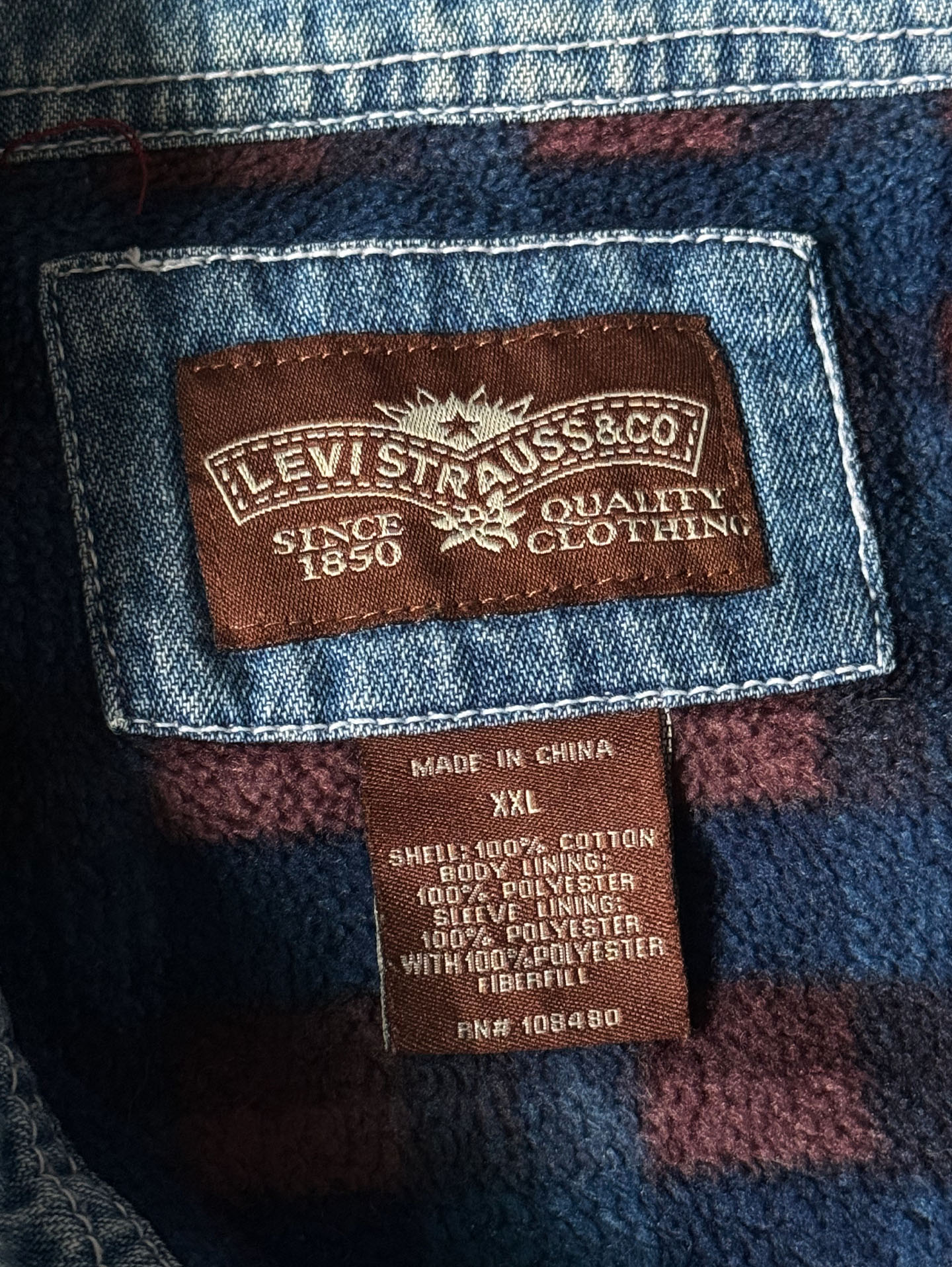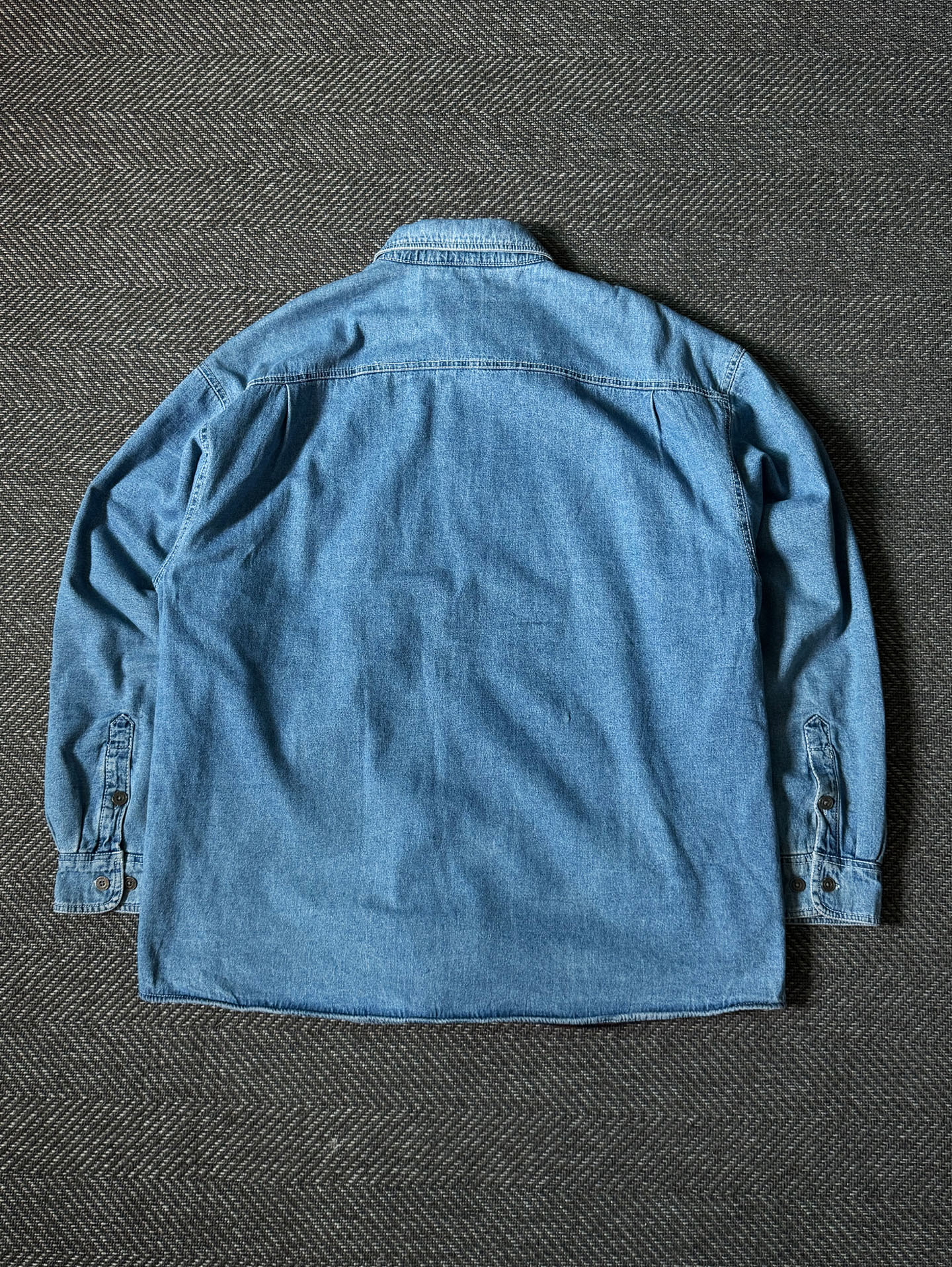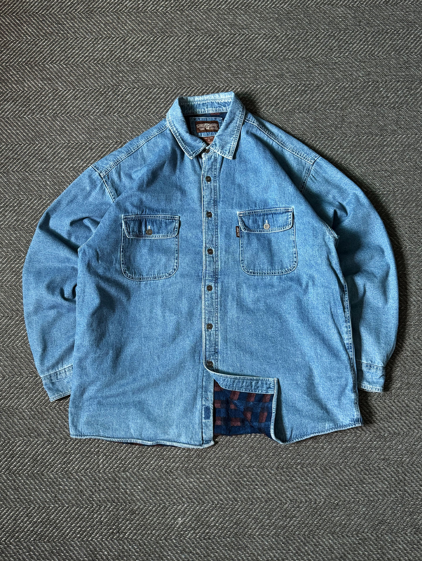 90년대 제작된 Levi’s Strauss & Co. Fleece-Lined Denim Shirt Jacket입니다. 클래식한 중청 데님 셔츠 실루엣에, 내부에는 체크 패턴의 폴리 플리스 안감이 더해져 셔츠처럼 가볍지만 자켓처럼 따뜻하게 착용할 수 있는 실용적인 아이템입니다. 겉감은 코튼 100% 데님 원단, 안감은 보온성이 우수한 플리스 소재로 구성되어 간절기와 초겨울까지 착용하기 좋습니다.