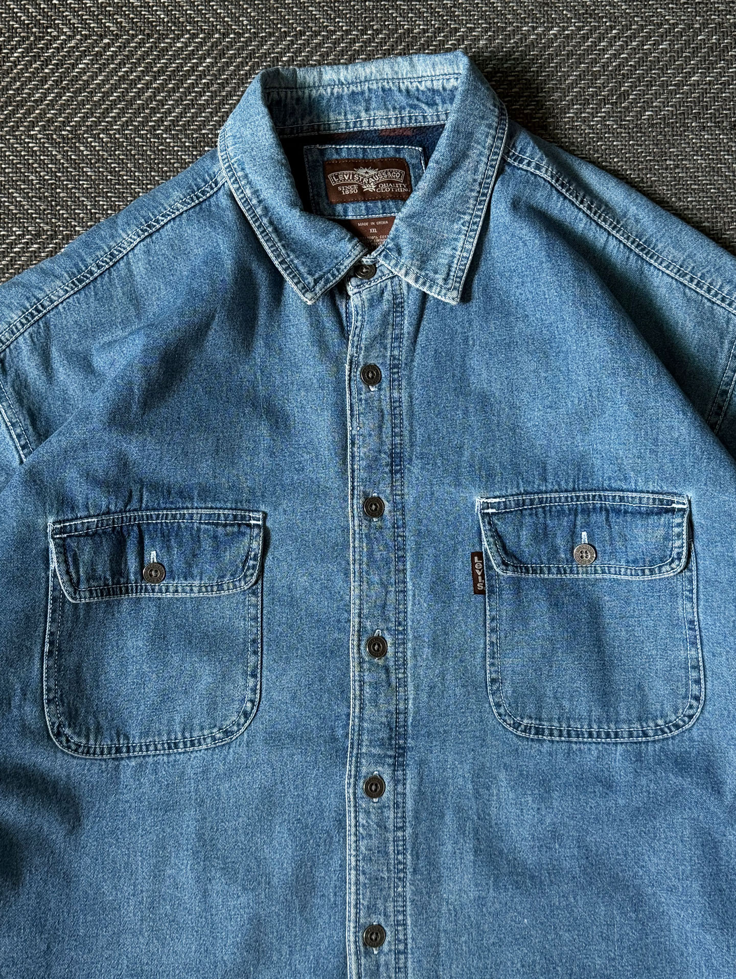 양쪽 가슴에는 플랩 포켓이 배치되어 있으며, Levi’s 특유의 레드 탭 디테일이 포인트로 들어가 있습니다. 전반적으로 양호한 컨디션을 유지하고 있으며, 빈티지 데님 특유의 자연스러운 색감과 워싱감이 매력적으로 드러납니다. 실측 110정도 되는 사이즈입니다.
