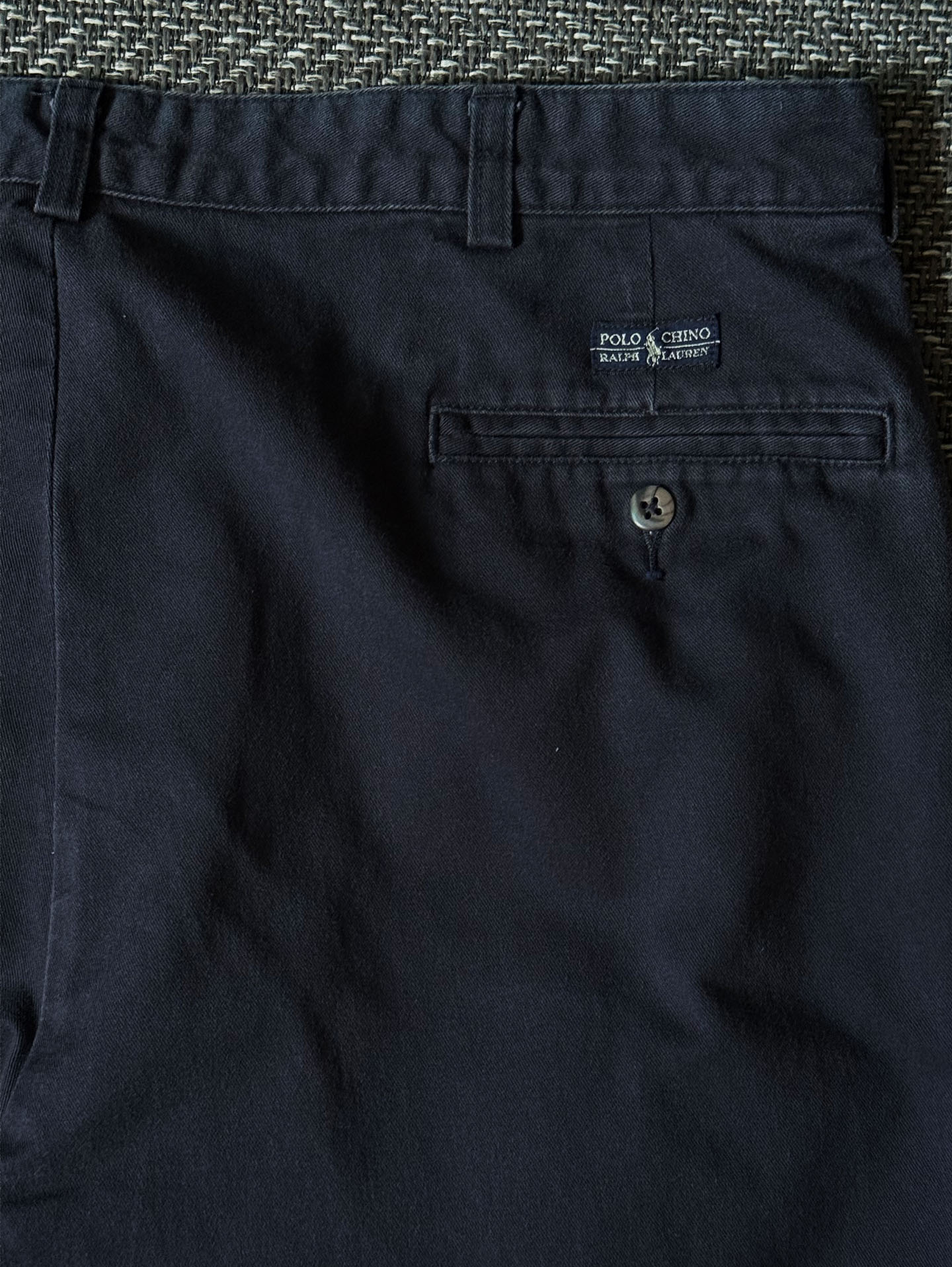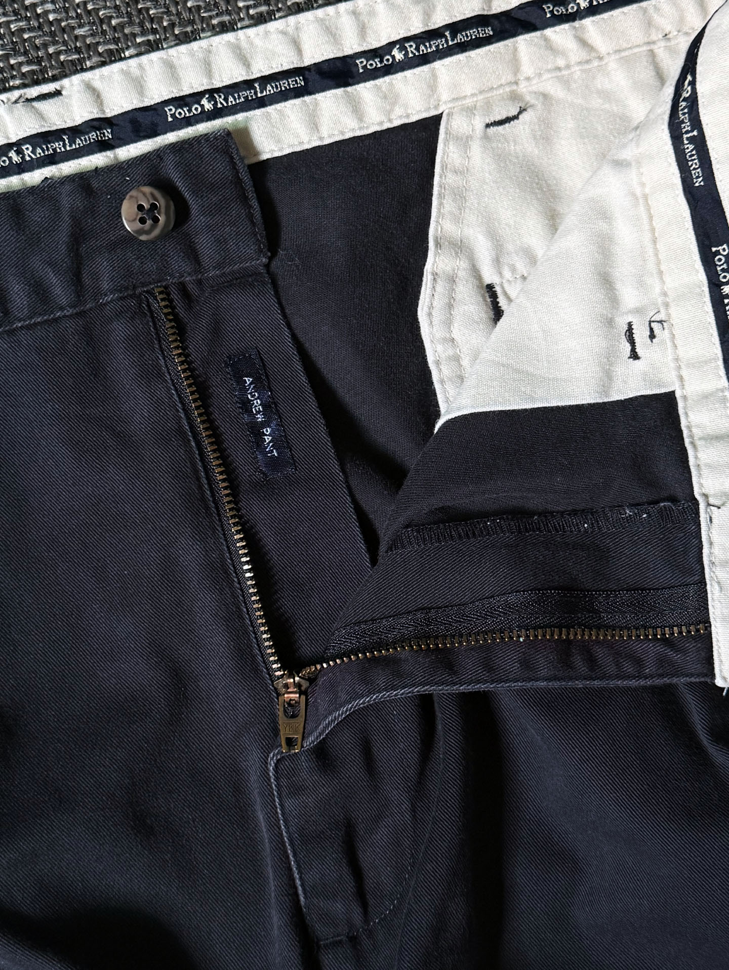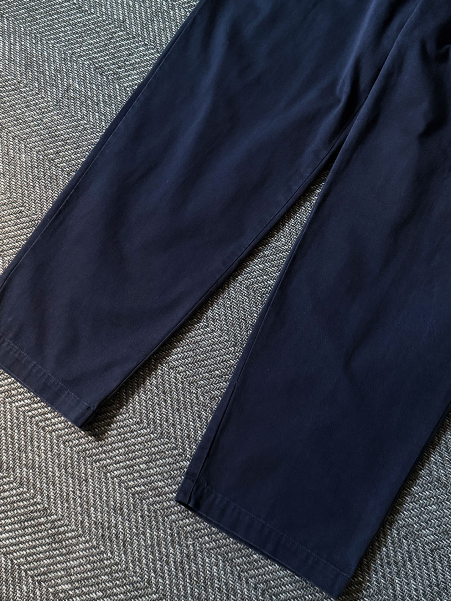 100% 코튼 트윌 소재로 제작되어 탄탄하면서도 유연한 터치감을 지니며, 딥 네이비 컬러의 고급스러운 색감이 특징입니다. 허리 안쪽에는 Polo Ralph Lauren 로고 테이프가 둘러져 있으며, 후면에는 시그니처 ‘Polo Chino Ralph Lauren’ 라벨이 부착되어 있습니다. YKK 지퍼가 사용된 프론트 플라이 구성으로 완성도를 높였습니다. 전반적으로 하자 없는 양호한 컨디션으로 보존되어 있으며, 폴로 특유의 클래식한 아메리칸 트래디셔널 무드를 잘 보여주는 아이템입니다. 실측 38정도 되는 사이즈입니다.