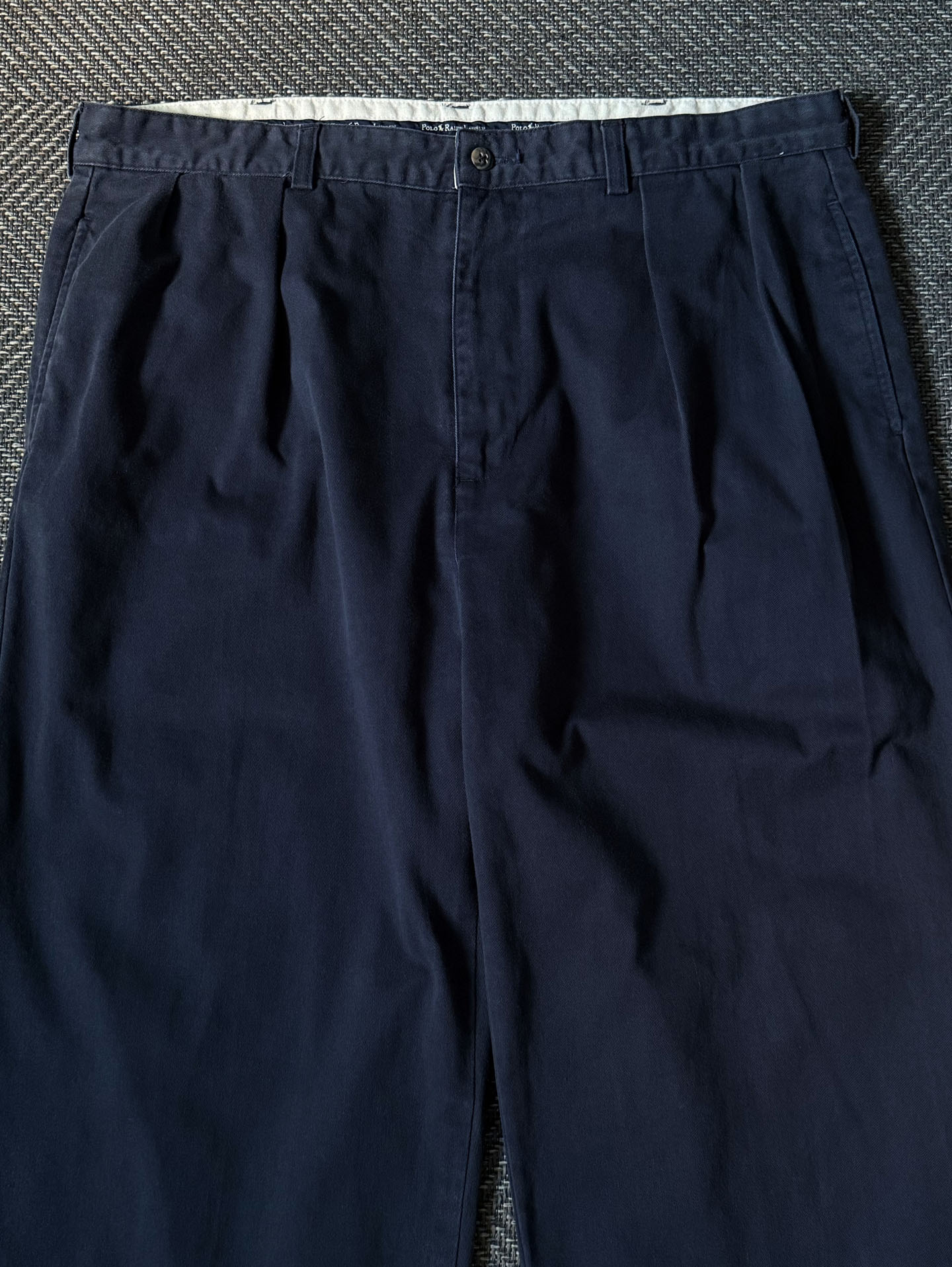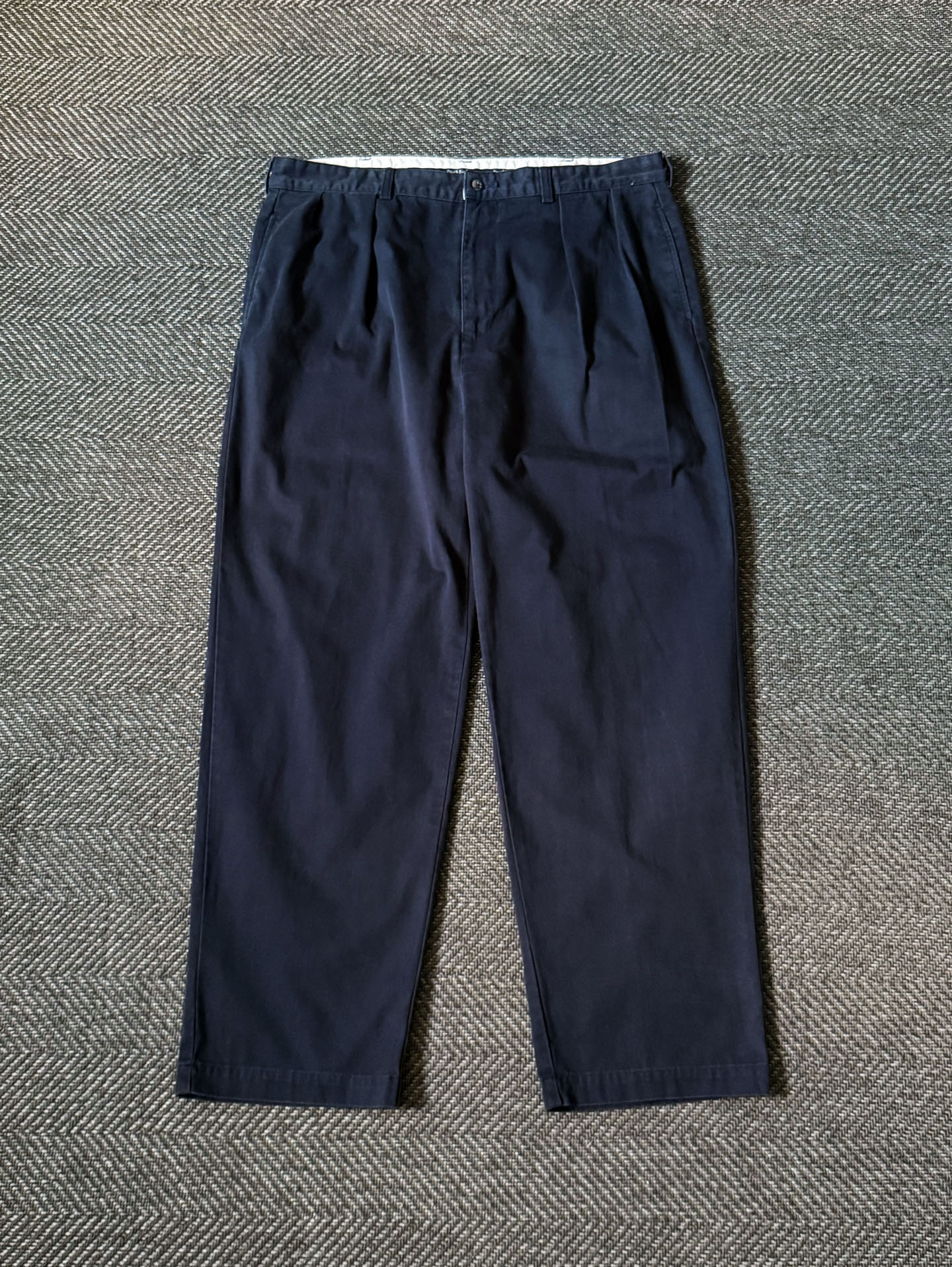 90년대 생산된 Polo by Ralph Lauren ‘Polo Chino’ 라인의 플리츠 팬츠입니다. 당시 폴로의 클래식 치노 라인 중에서도 포멀과 캐주얼을 모두 아우르는 모델로, 투턱 디테일을 더해 여유로운 실루엣과 자연스러운 드레이프감을 연출합니다.
