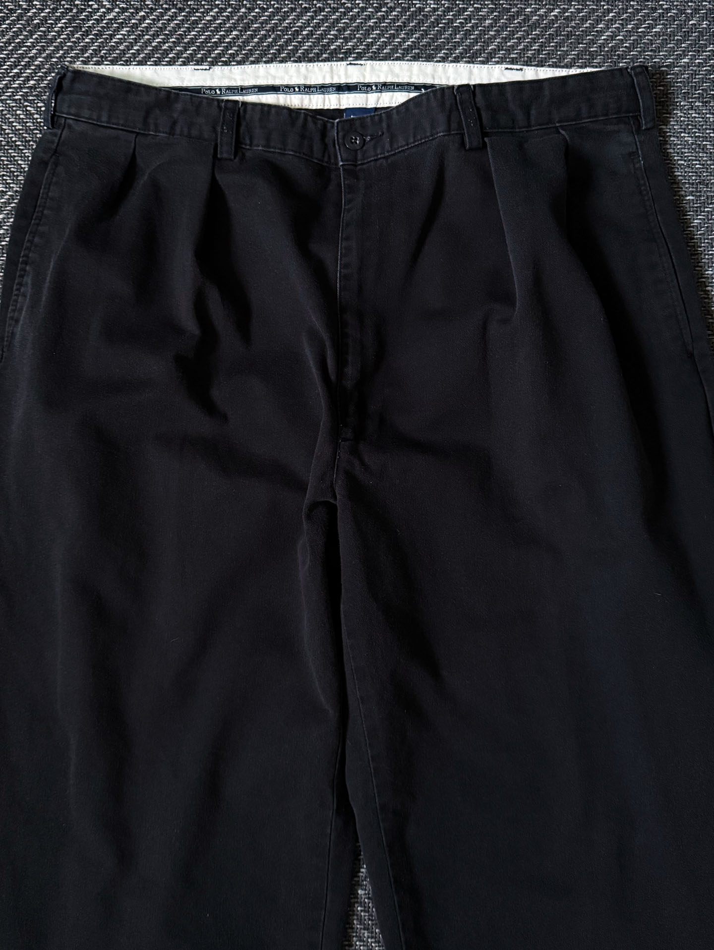 90년대 생산된 Polo by Ralph Lauren ‘Andrew Pant’ 모델로, 폴로 치노 라인의 대표적인 클래식 실루엣을 보여주는 아이템입니다. 와이드하면서도 자연스럽게 떨어지는 투턱 디자인으로, 허리부터 밑단까지 흐르는 드레이프가 안정감 있고 세련된 인상을 줍니다.