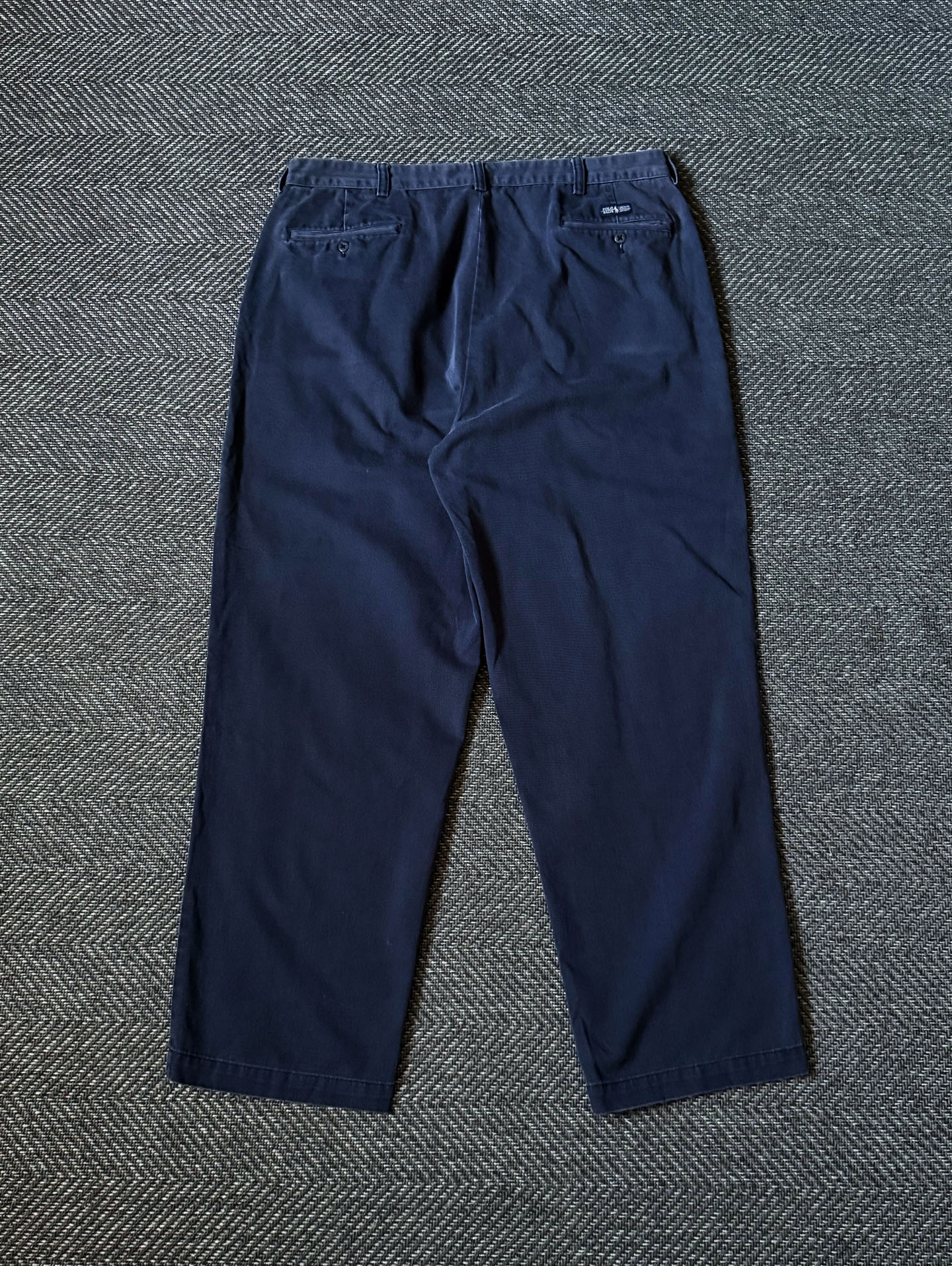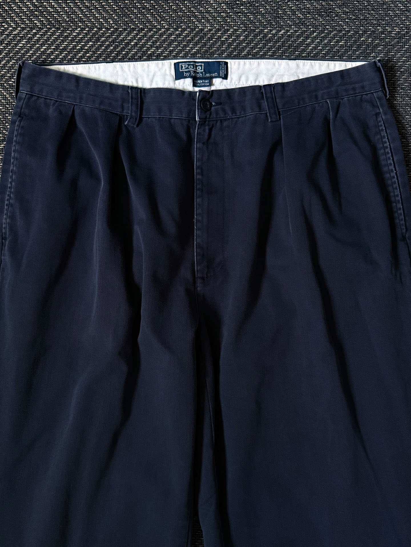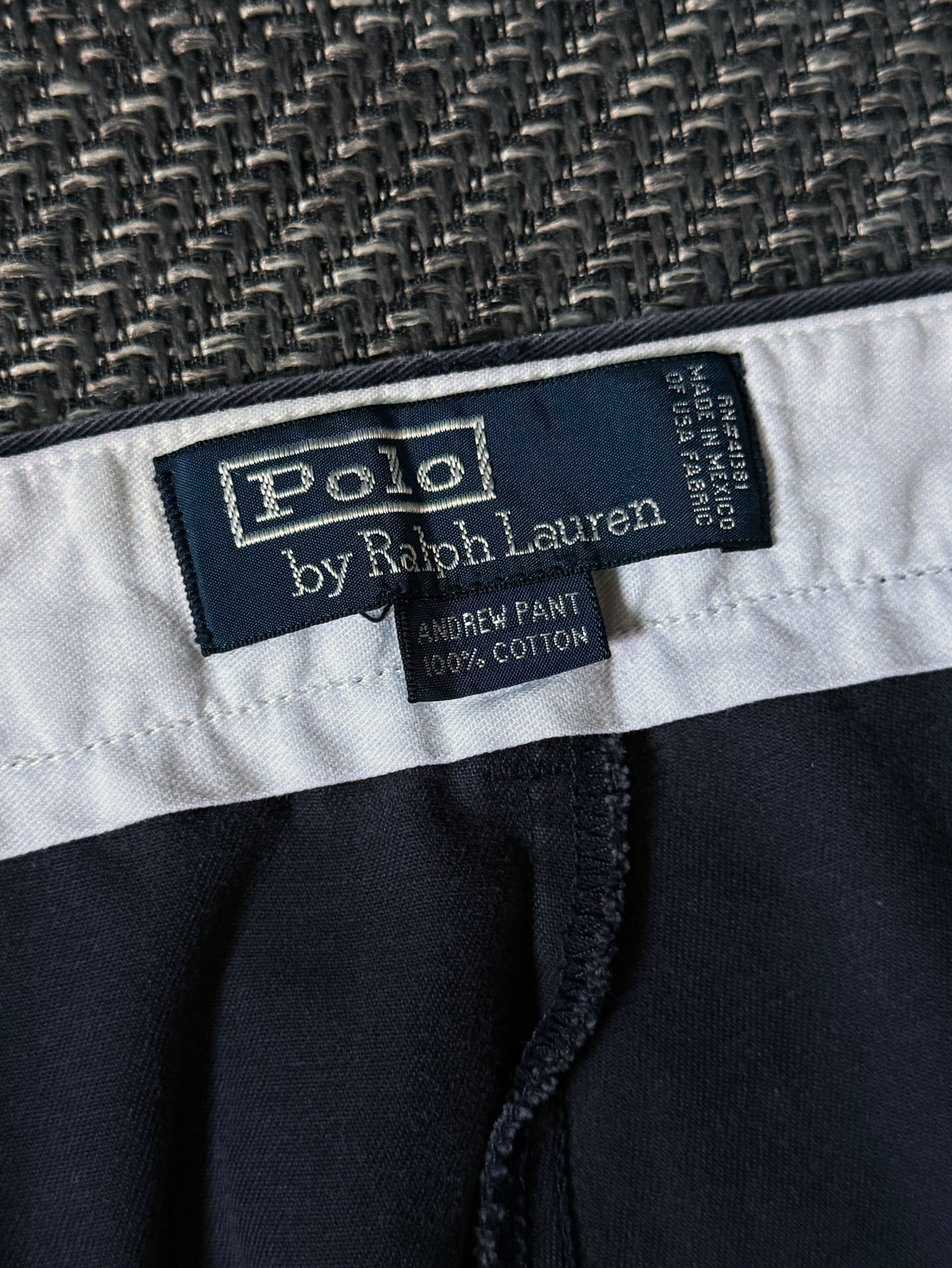 90년대 중후반 생산된 Polo by Ralph Lauren “Andrew Pant”, 브랜드의 대표 치노 라인인 Classic Polo Chino 라인의 네이비 컬러 모델입니다. 투턱 디테일과 여유로운 실루엣으로 클래식하면서도 자연스러운 착용감을 제공합니다.