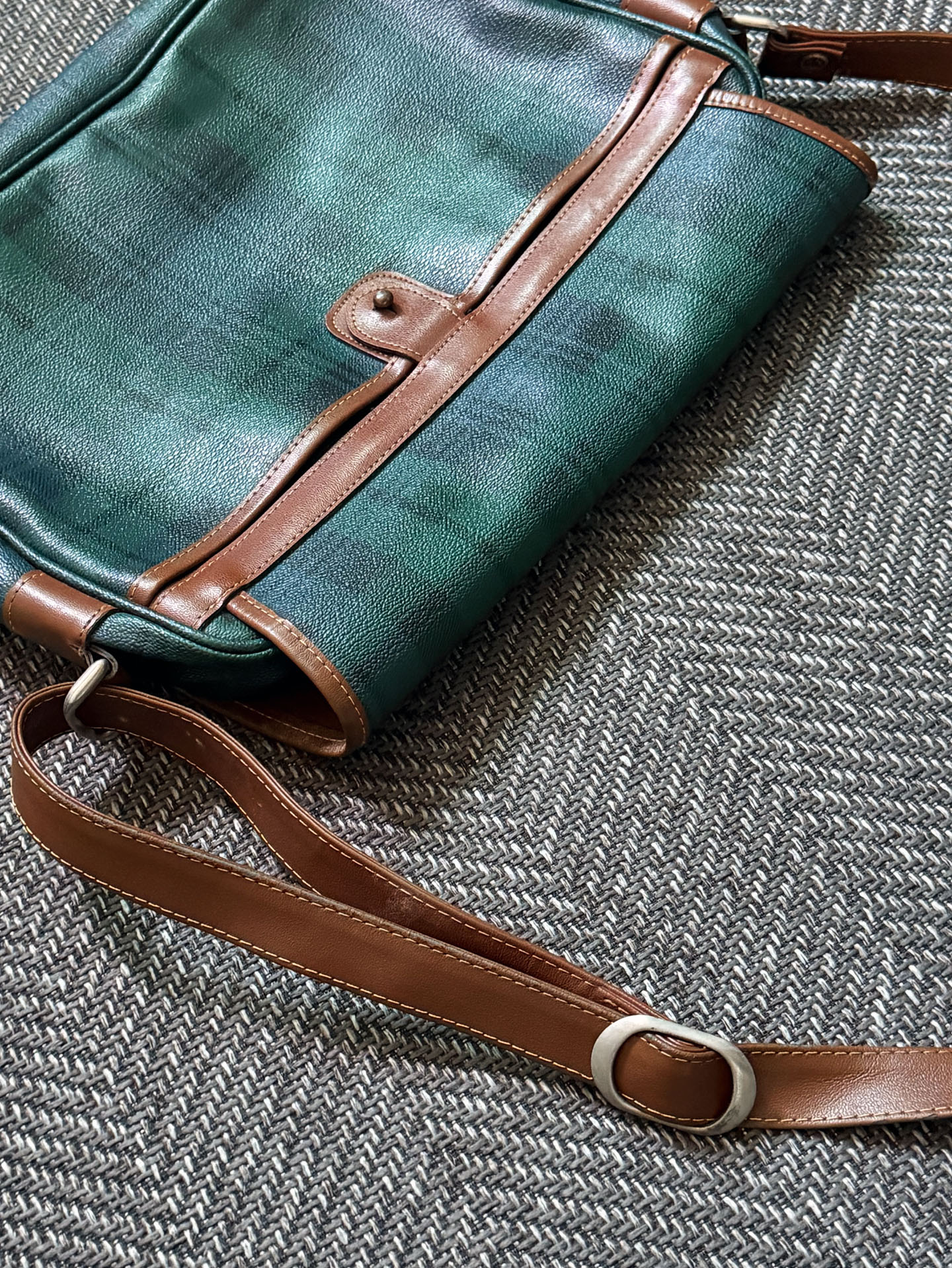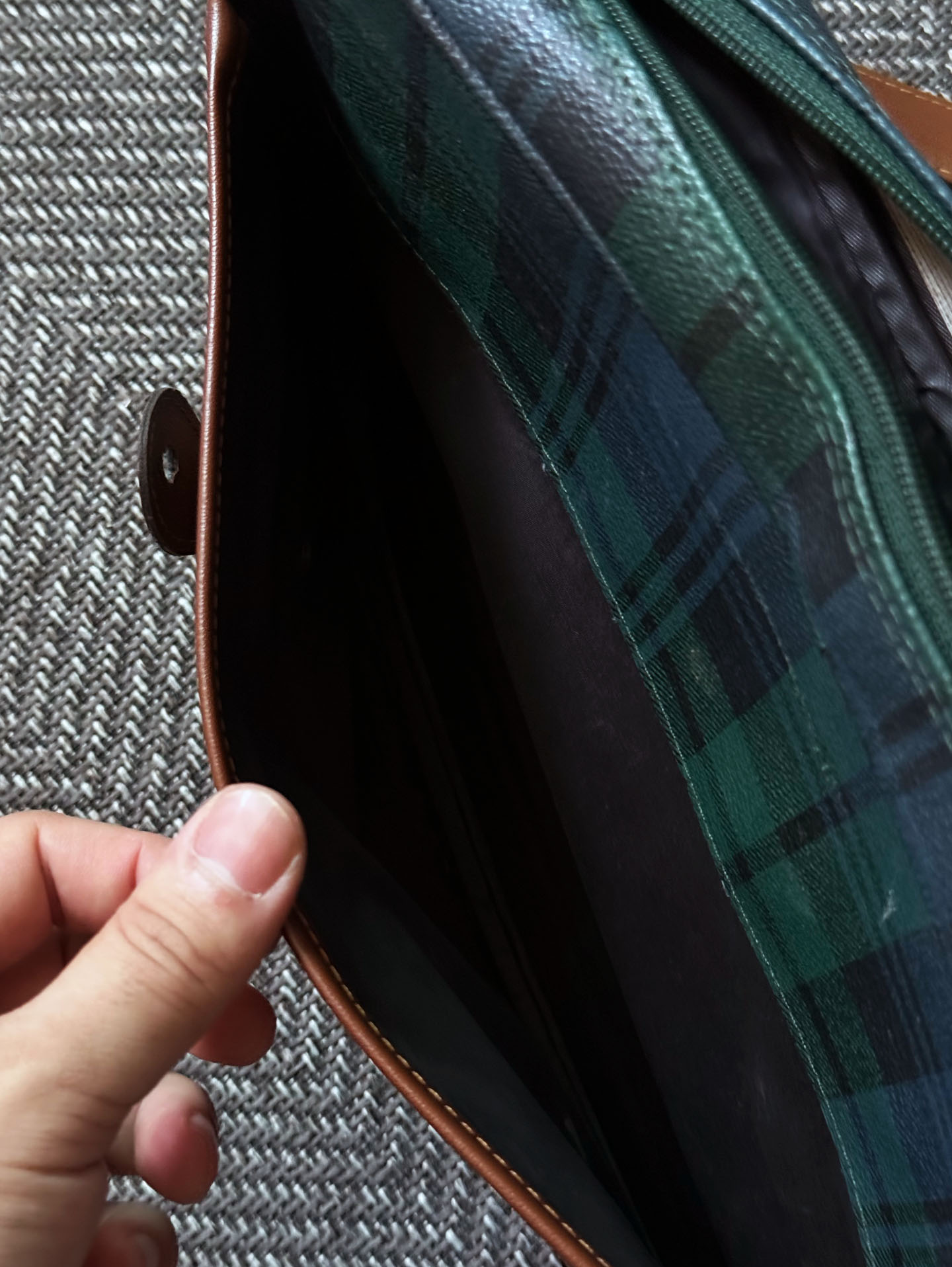 클래식한 Polo Ralph Lauren의 빈티지 숄더백으로, 브랜드의 전통적인 Blackwatch Tartan 체크 패턴이 돋보이는 아이템입니다. 그린과 네이비가 조화를 이루는 코팅 캔버스 소재에 브라운 가죽 트리밍과 벨트 스트랩 디테일이 더해져 고급스러운 무드를 연출합니다.