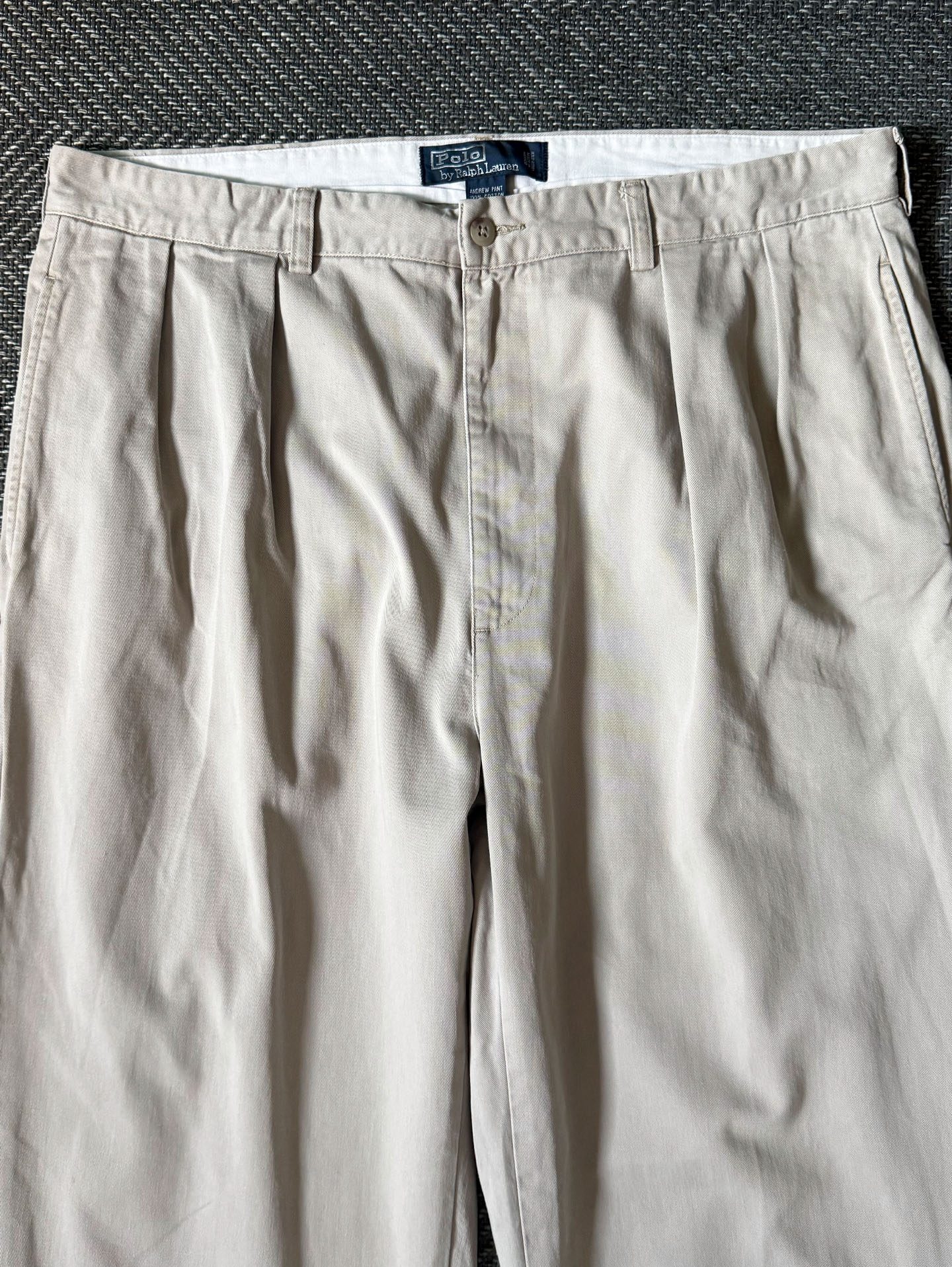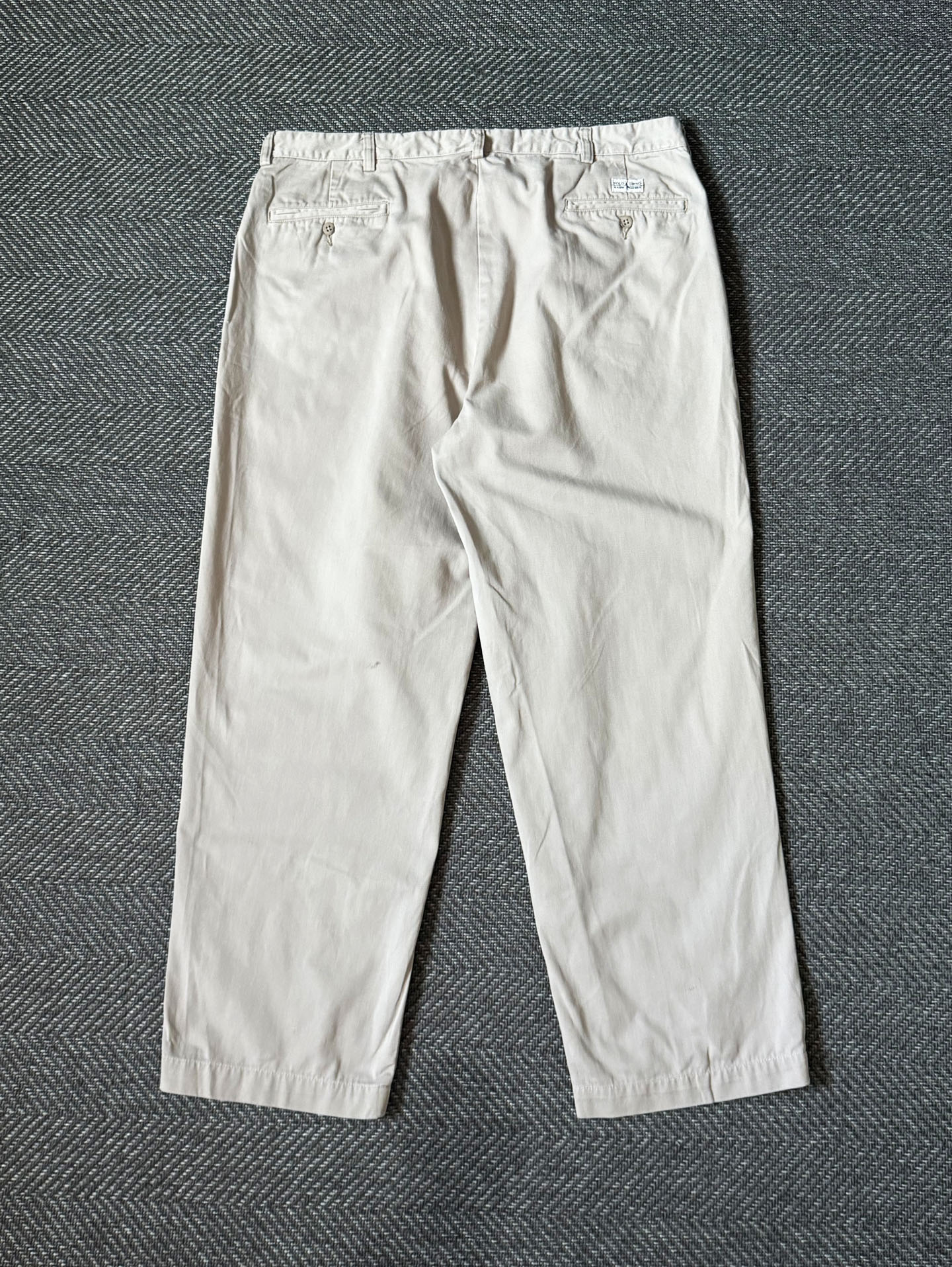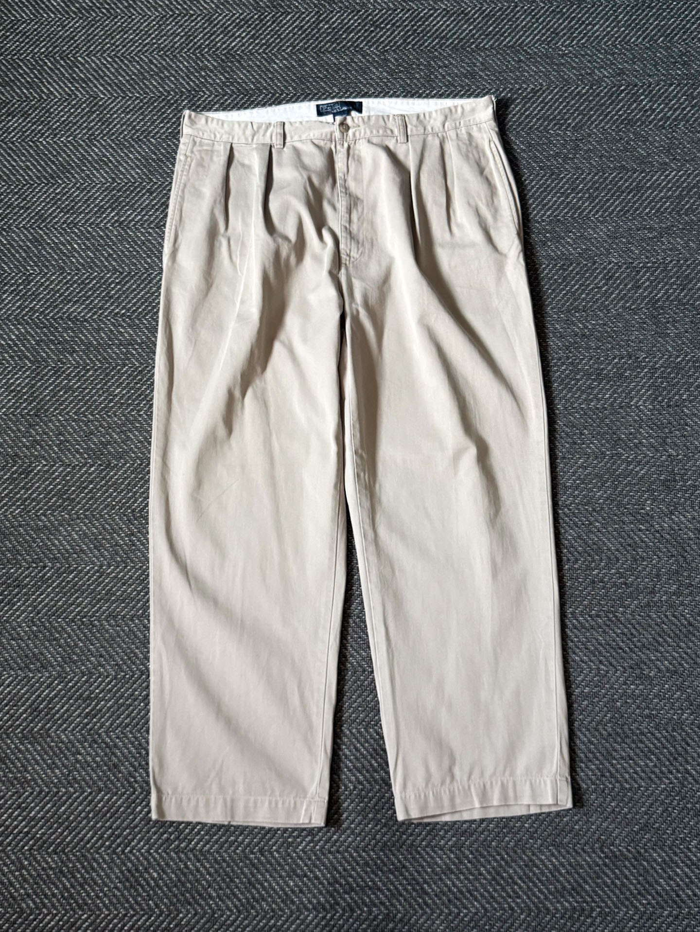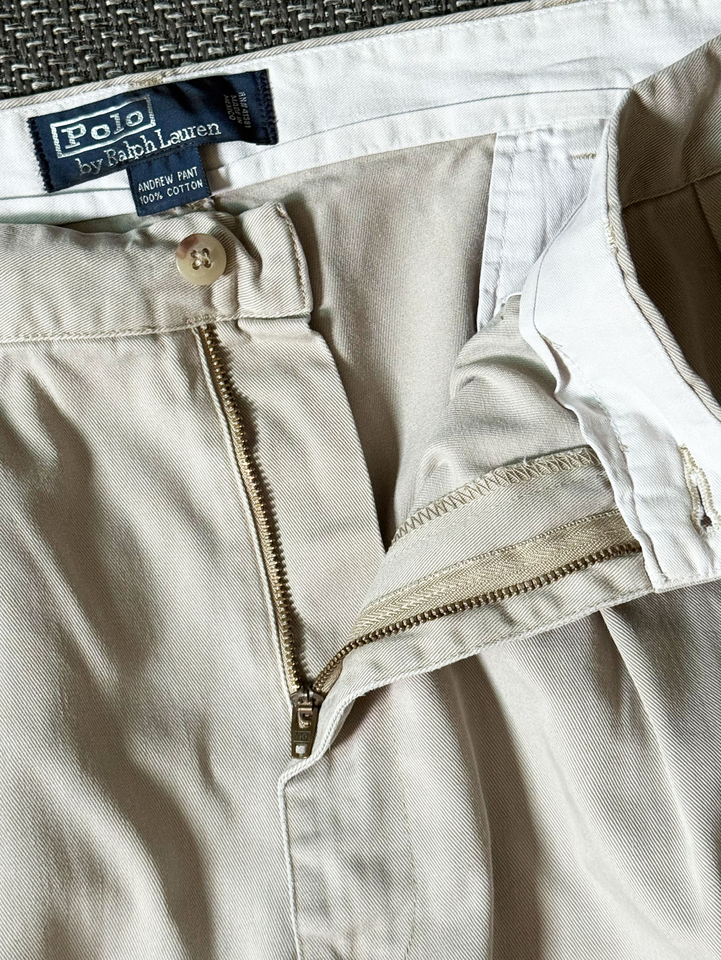 90년대 후반에서 2000년대 초반 사이 제작된 Polo Ralph Lauren의 빈티지 치노 팬츠입니다. 브랜드의 클래식 치노 라인인 Andrew Pant 모델로, 투플리츠 디자인과 여유로운 실루엣이 특징입니다.