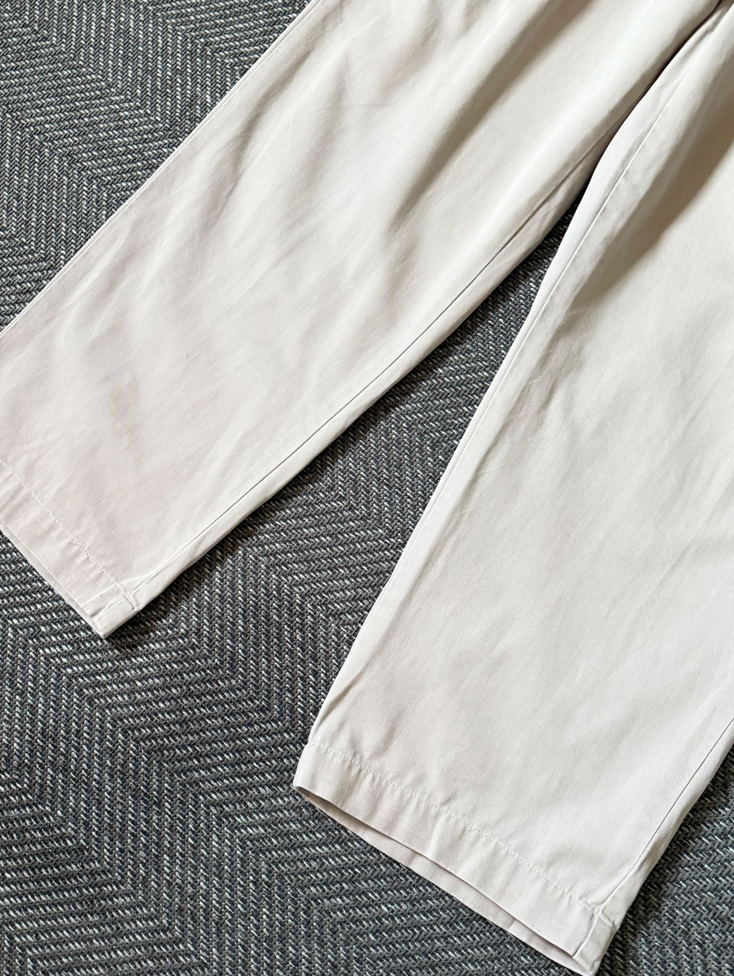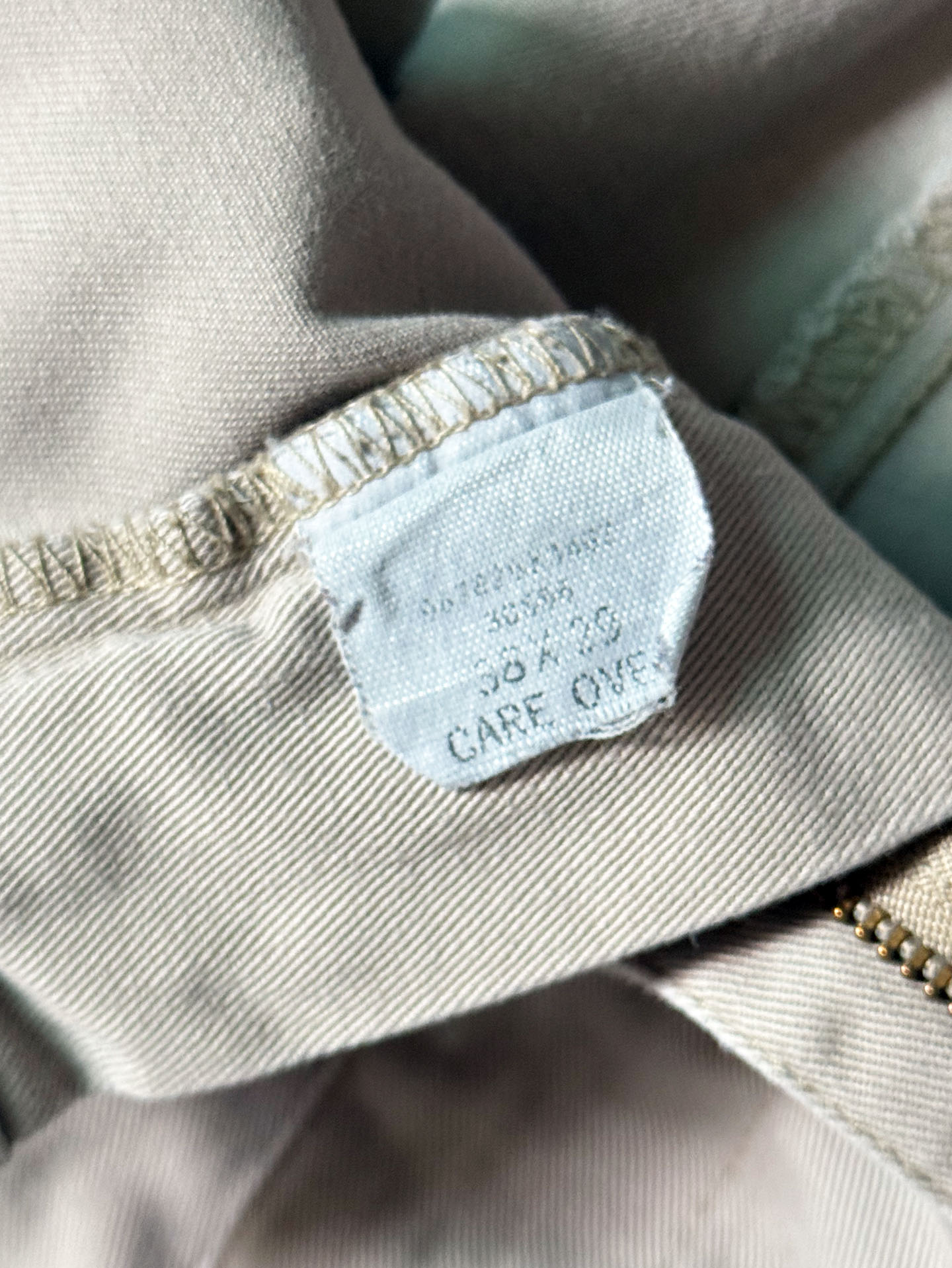 고밀도의 100% 코튼 트윌 원단으로 제작되어, 내구성이 뛰어나며 부드럽게 흐르는 실루엣을 보여줍니다. 허리 안쪽에는 네이비 컬러의 Polo by Ralph Lauren 라벨이 부착되어 있고, 뒷면에는 “Polo Chino Ralph Lauren” 직조 탭이 더해져 브랜드의 정통 빈티지 감성을 담고 있습니다. 전체적으로 형태 유지가 잘 되어 있으며, 뒷면 하단부의 미세한 오염 외에는 양호한 컨디션입니다. 밝은 베이지톤의 클래식 치노로, 셔츠나 니트와 함께 매치하기 좋은 베이직 아이템입니다. 실측 38정도  되는 사이즈입니다.