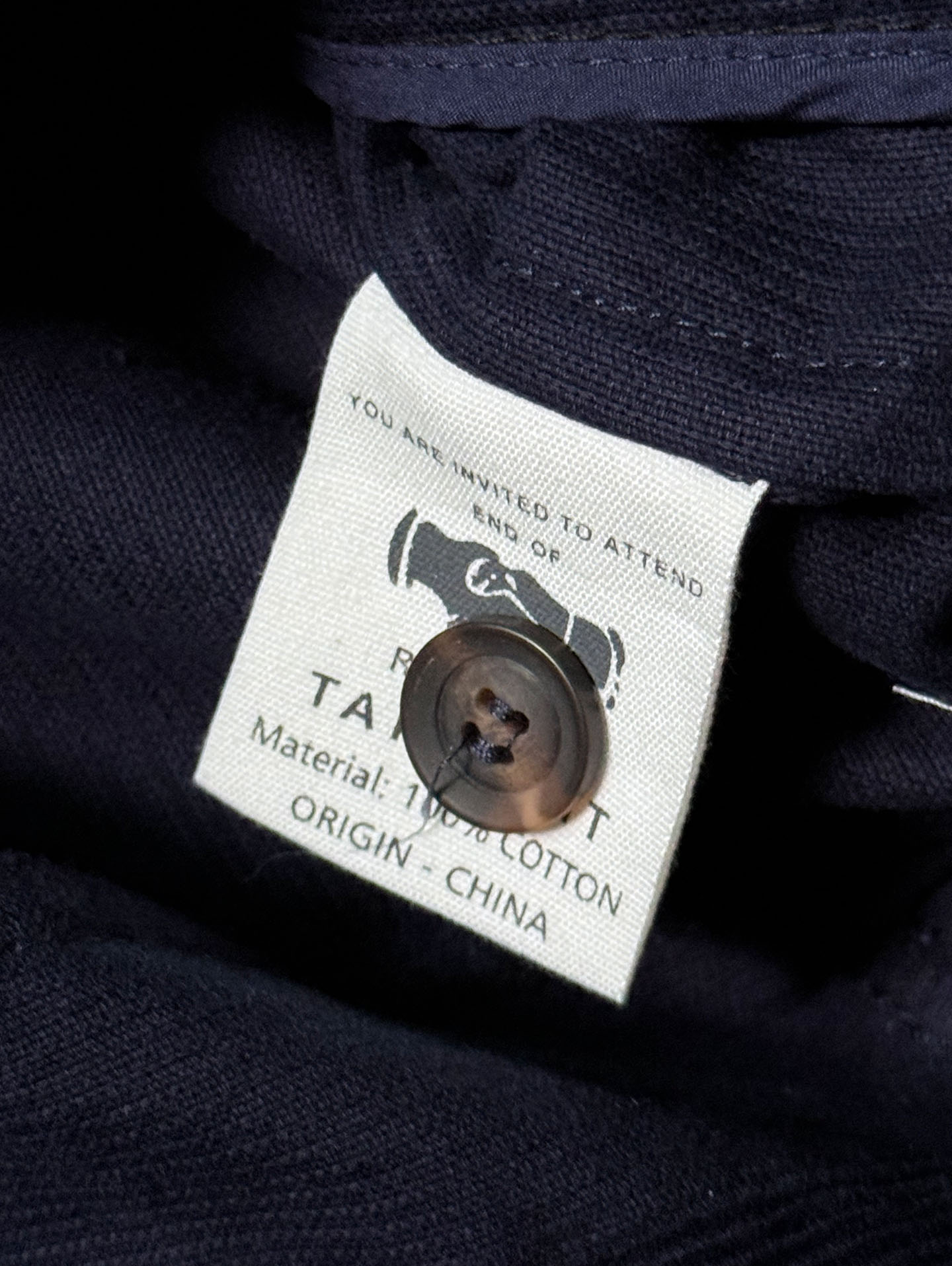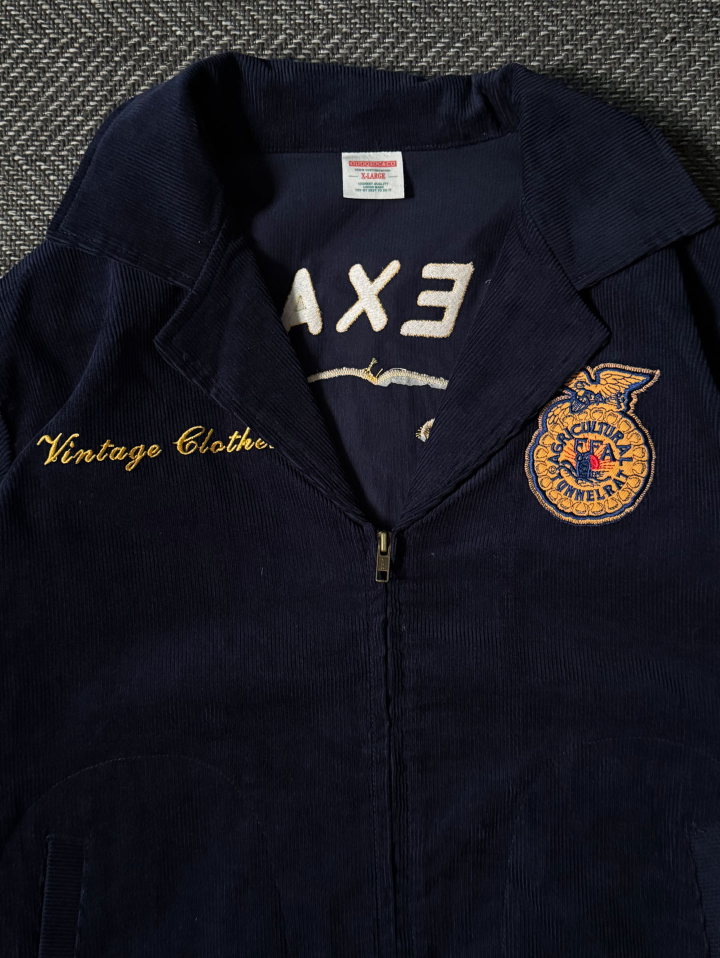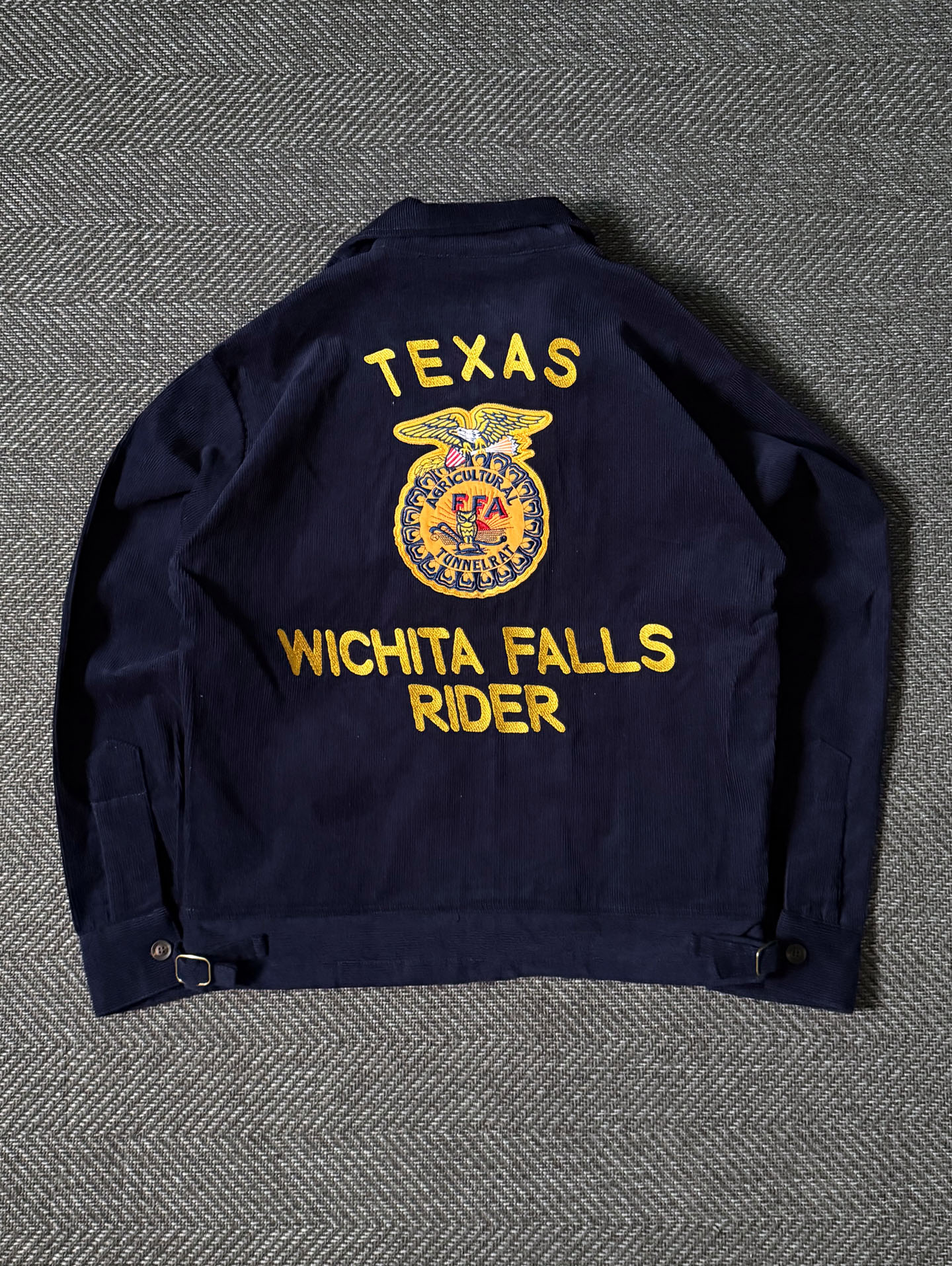 FFA 자켓은 1930년대부터 미국 농업학교 학생들의 공식 유니폼으로 사용된 상징적인 아이템으로, 짙은 네이비 코듀로이 원단과 금색 체인 자수, 브라스 지퍼 디테일이 특징입니다. 이 재킷은 그러한 오리지널 디자인을 충실히 재현하며, 앞면에는 FFA 로고 자수와 이름 자수가, 뒷면에는 “TEXAS / WICHITA FALLS RIDER” 체인 자수가 더해져 있습니다.