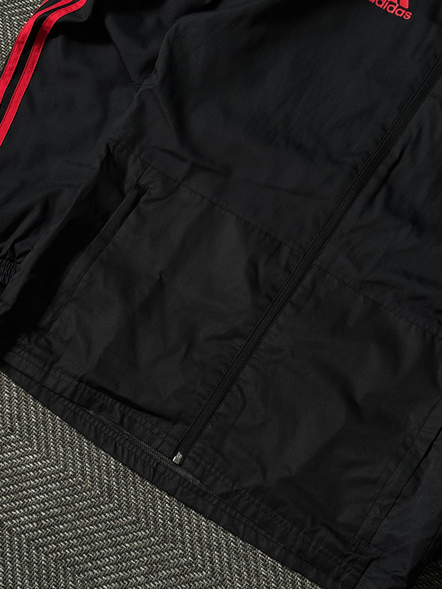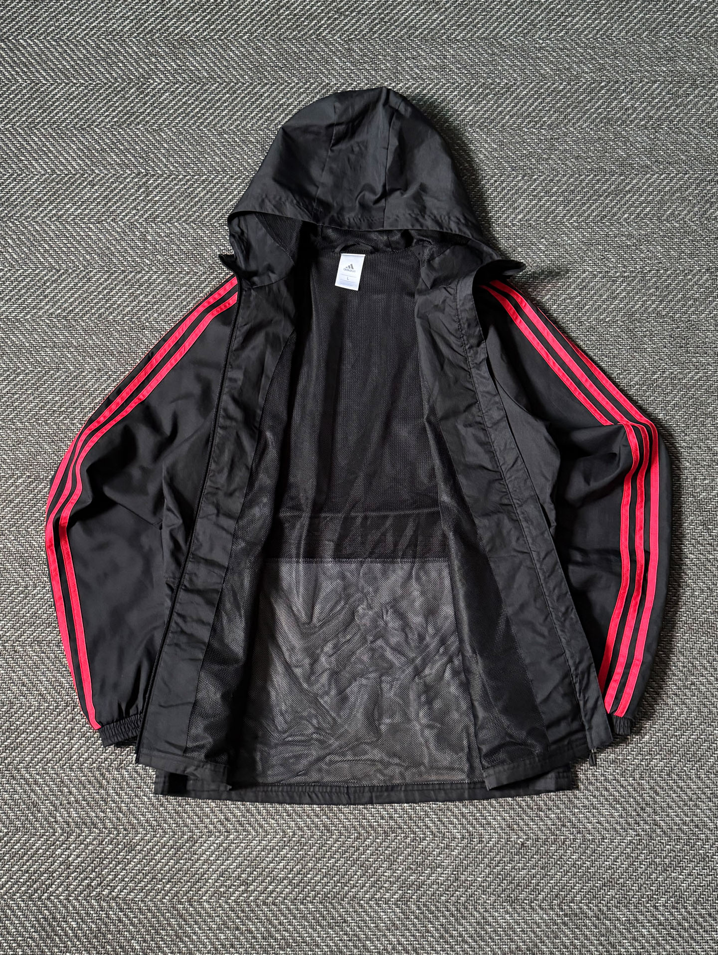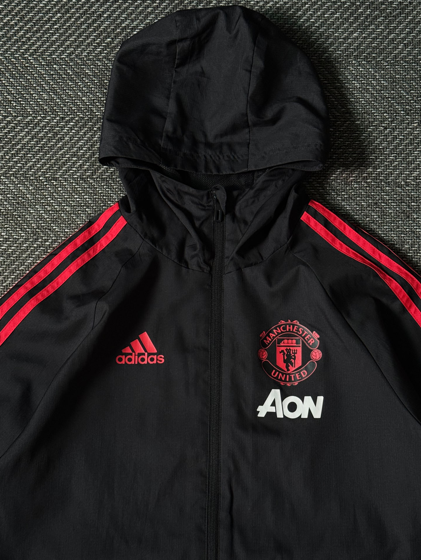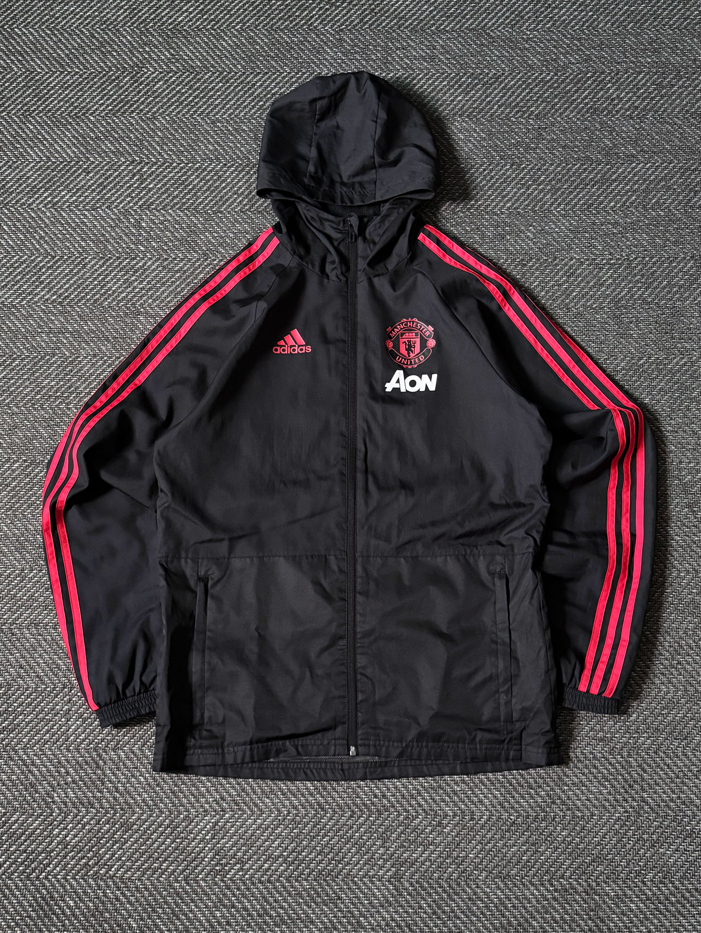 어깨선을 따라 이어지는 아디다스 삼선 스트라이프 라인과 전면에 자수 처리된 맨체스터 유나이티드 엠블럼, 아디다스 로고, AON 스폰서 로고가 포인트를 줍니다. 내부는 통기성을 높인 메시 안감으로 구성되어 쾌적한 착용감을 제공합니다. 후드 일체형 디자인으로 실용성이 높으며, 지퍼 포켓과 밑단 밴딩 마감으로 활동성을 강화했습니다. 전체적으로 하자 없는 양호한 컨디션을 유지하고 있으며, 실측 100-105정도 되는 사이즈입니다.