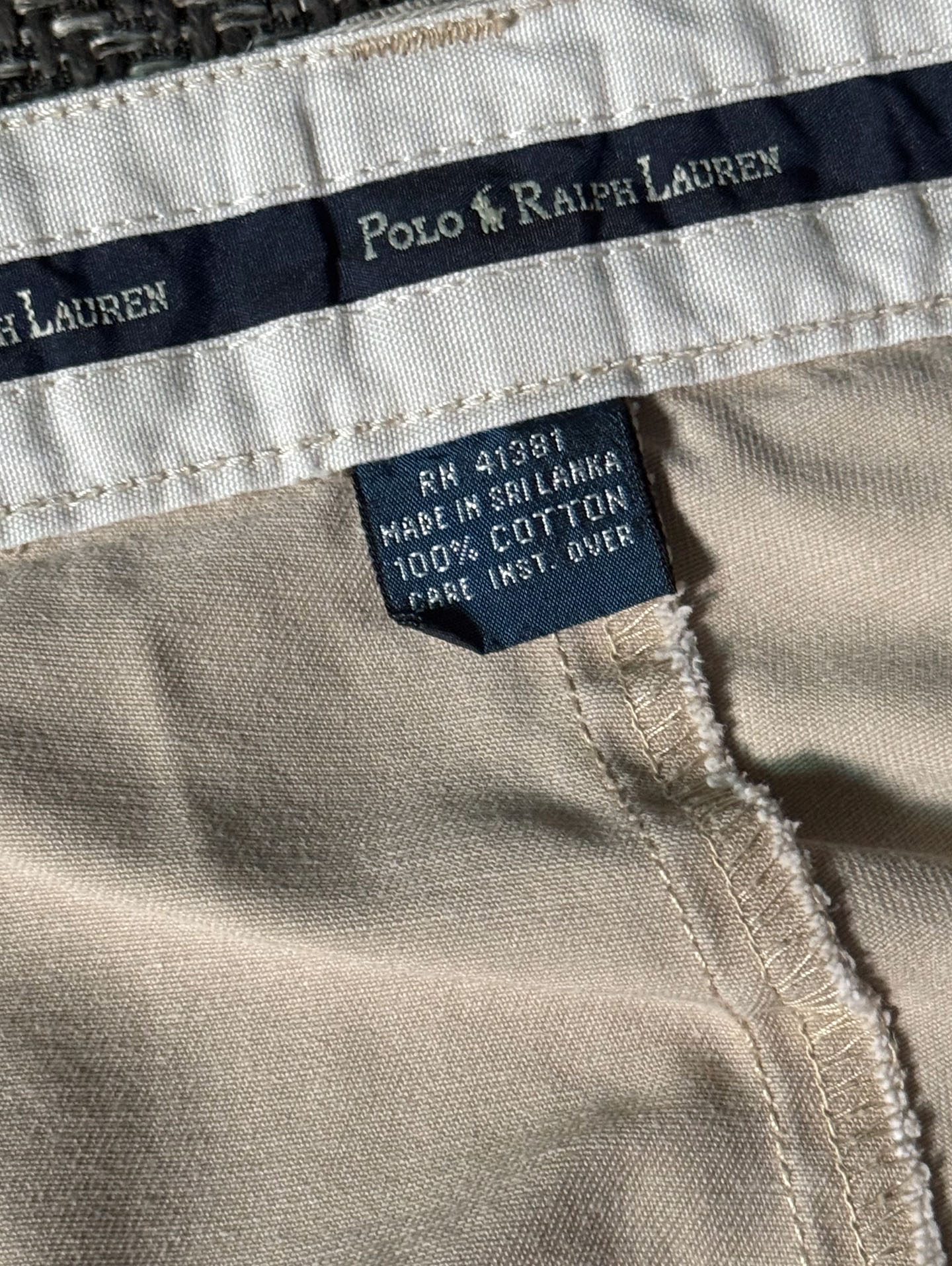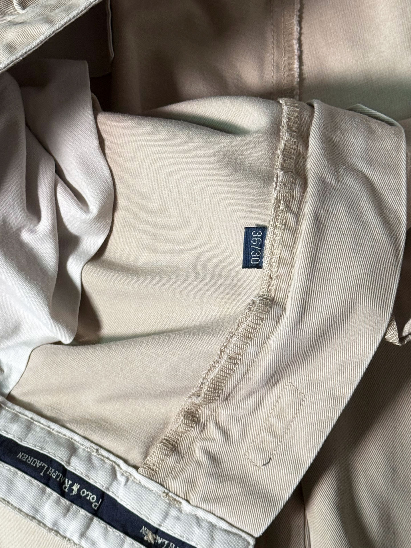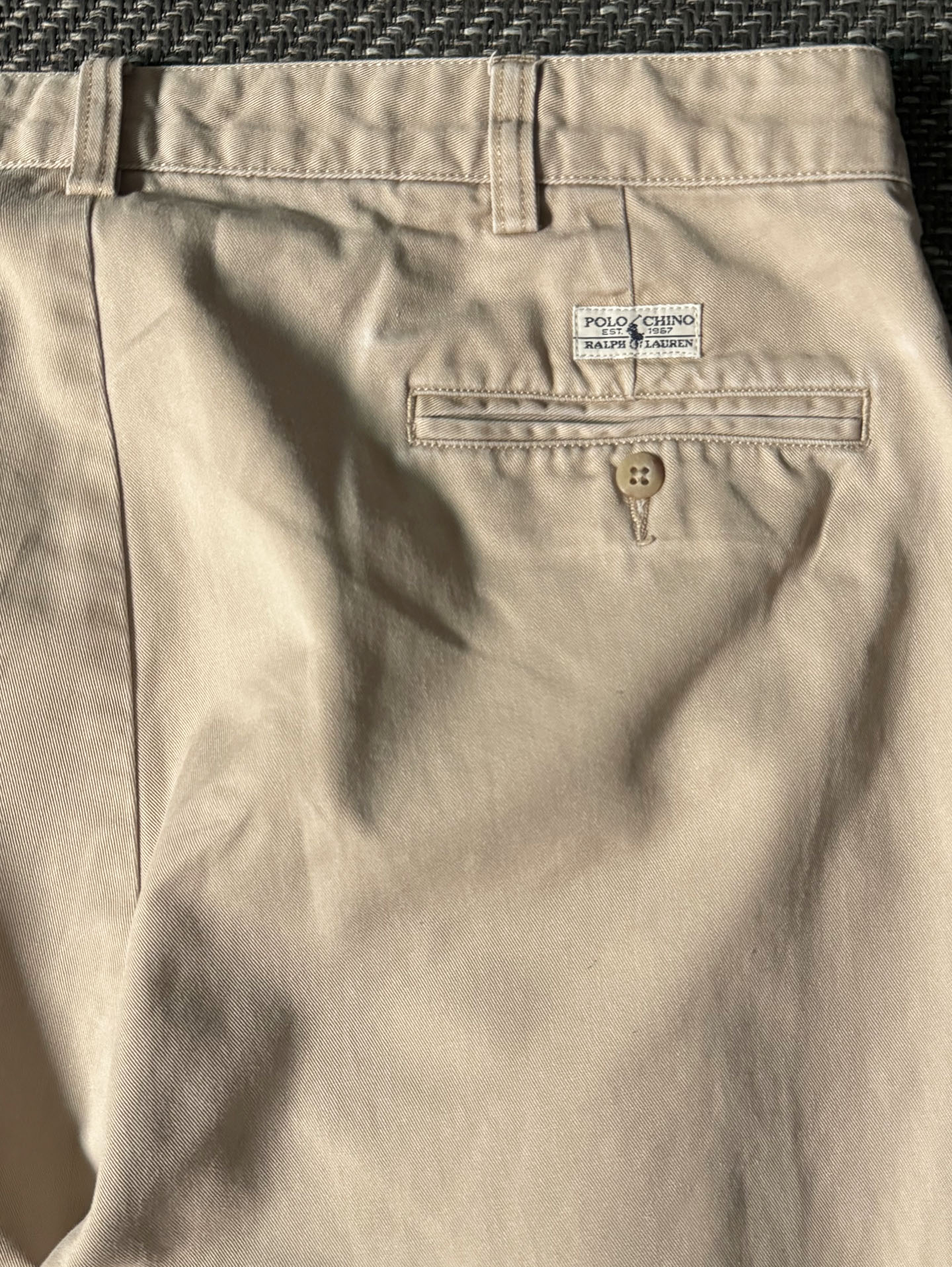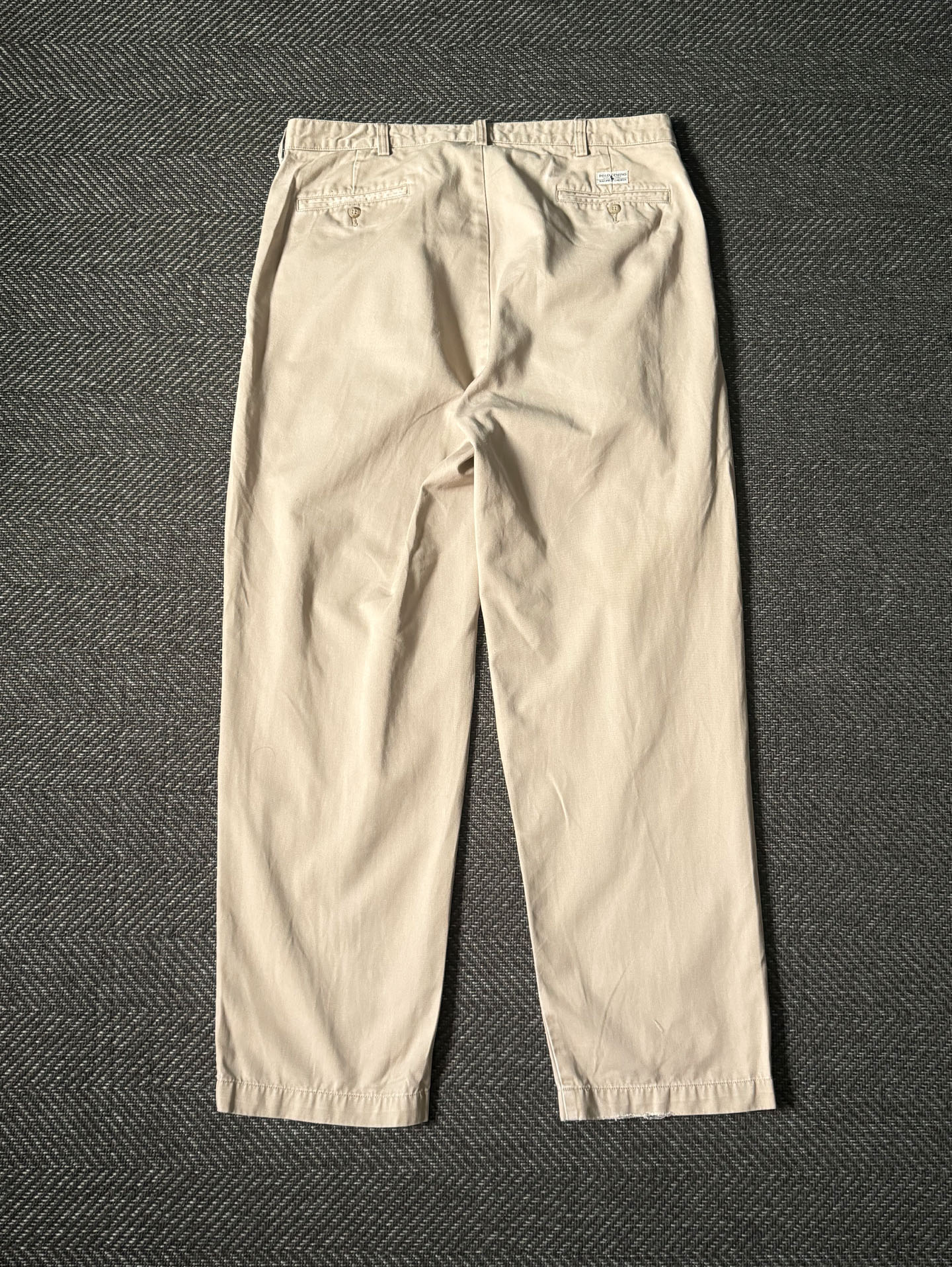 앞면은 투 플리츠 디테일, 후면은 버튼 여밈 포켓으로 마감되었으며, YKK 지퍼와 브랜드 각인 버튼 등 오리지널 디테일이 그대로 유지되어 있습니다. 허리 안쪽에는 “Polo Ralph Lauren” 로고 테이핑이 둘러져 있으며, 뒷면에는 “Polo Chino Est. 1967” 패치 라벨이 부착되어 있습니다. 사진상 보이는 눈에 잘 띄지 않는 미세한 오염 외에는 하자 없는 양호한 컨디션이며, 실측 36정도 되는 사이즈입니다.