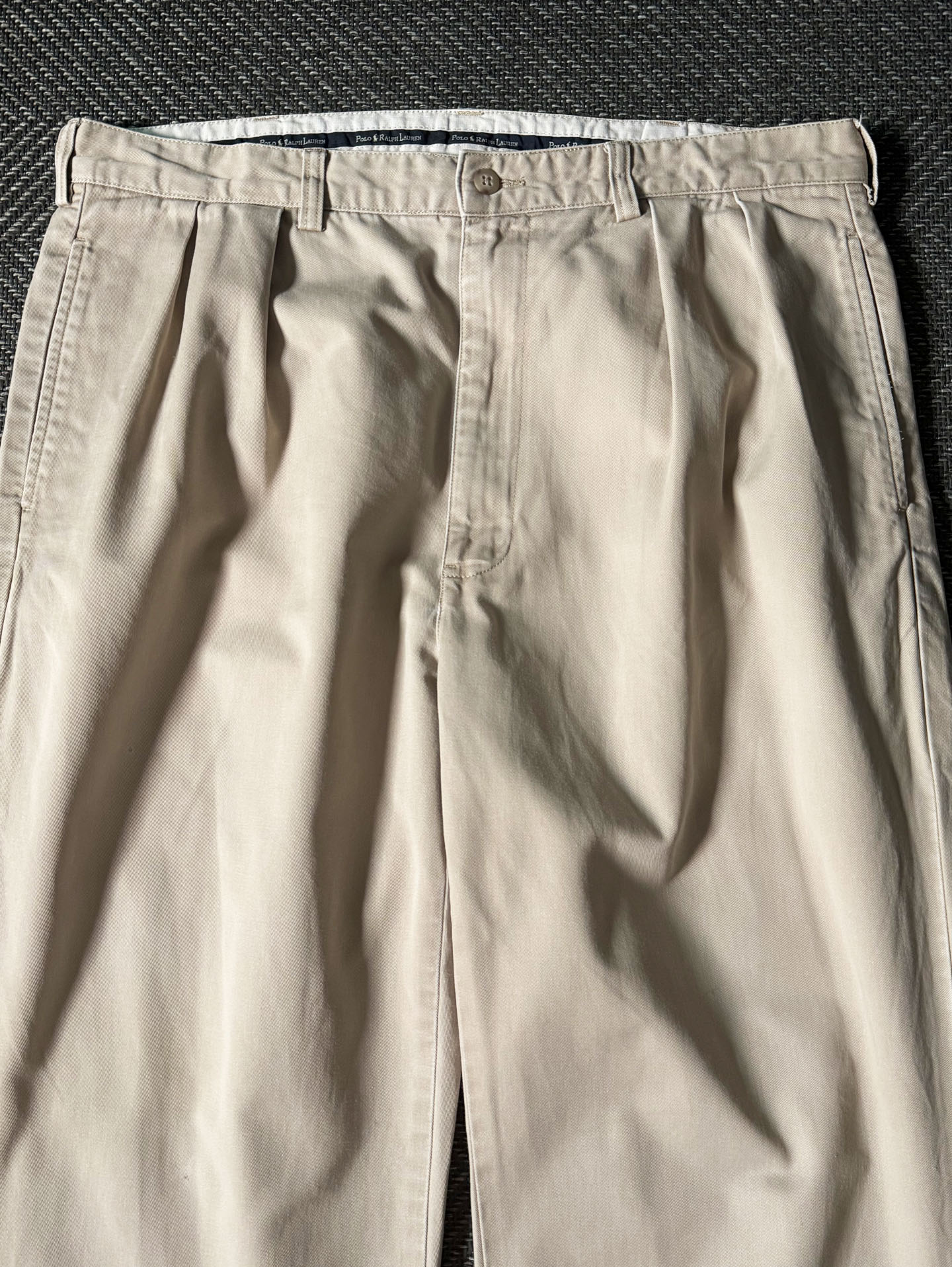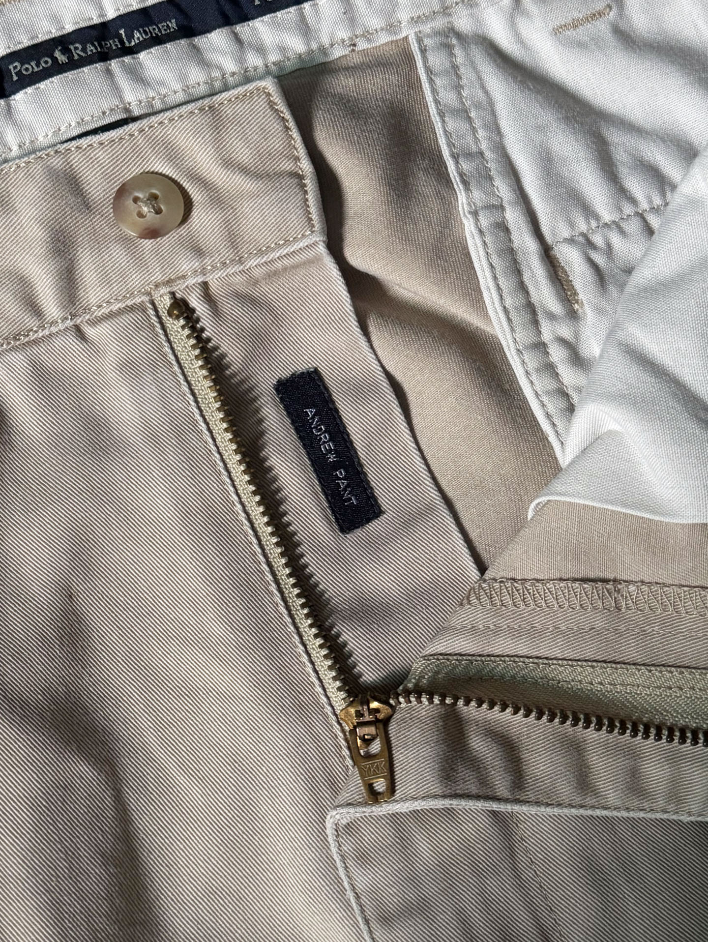 90년대 생산된 Polo Ralph Lauren의 클래식 치노라인, Andrew Pants 모델입니다. 허리 부분의 더블 플리츠 디자인과 여유로운 실루엣이 특징으로, 고급스러운 코튼 트윌 원단이 사용되어 자연스러운 광택과 탄탄한 터치감을 느낄 수 있습니다.