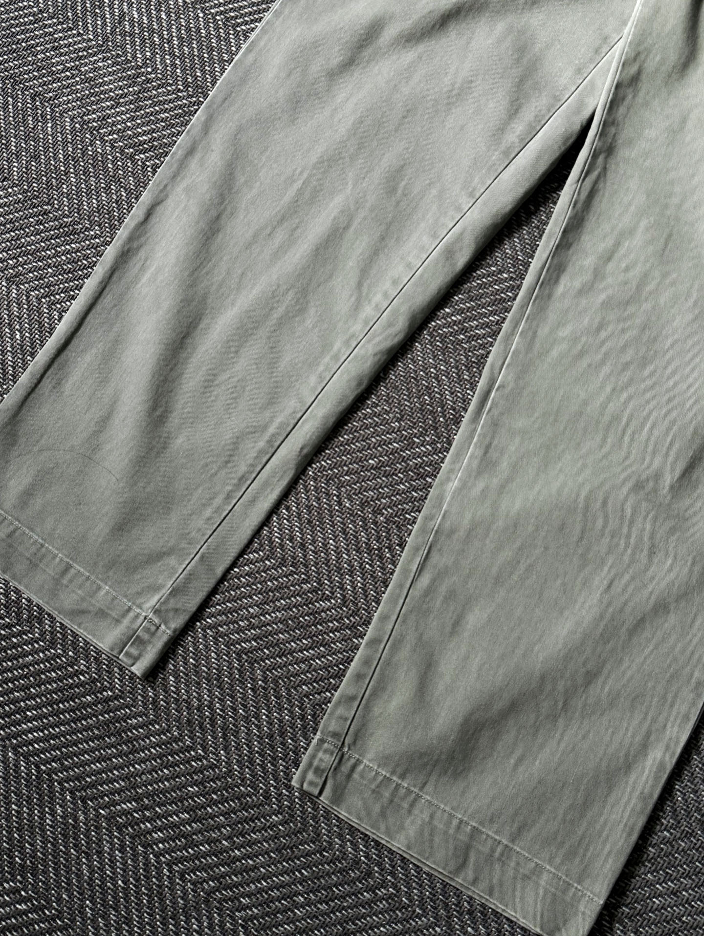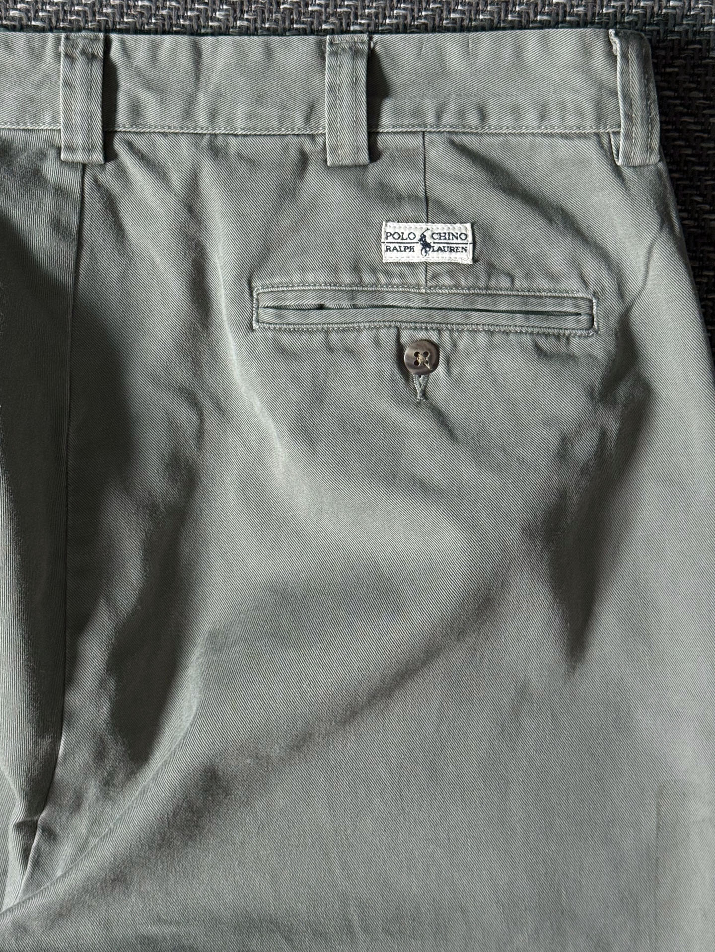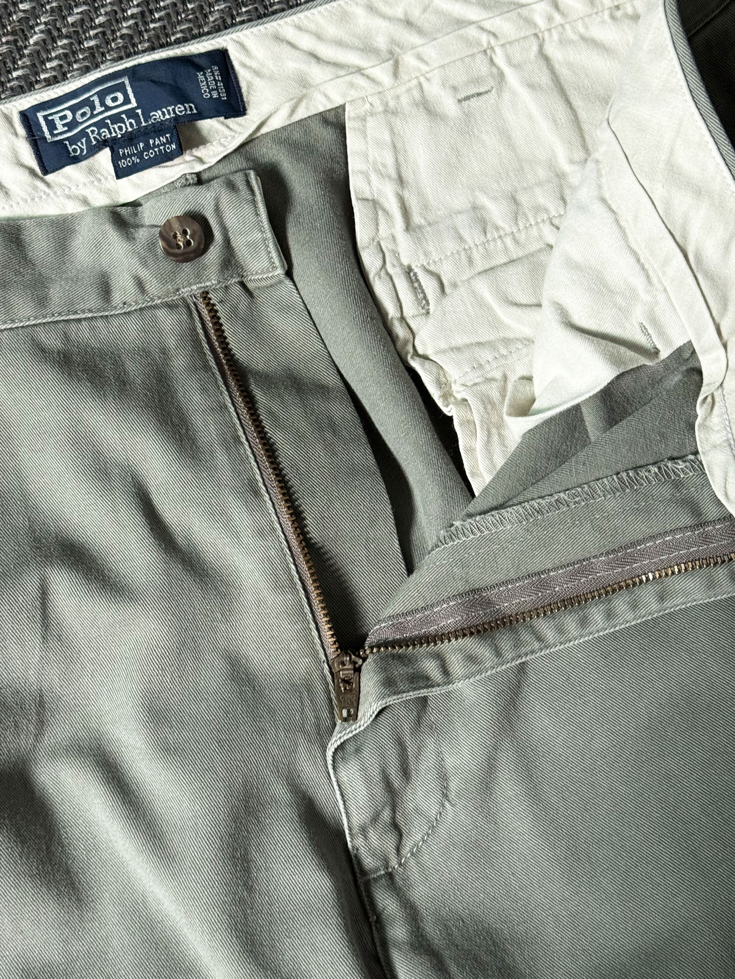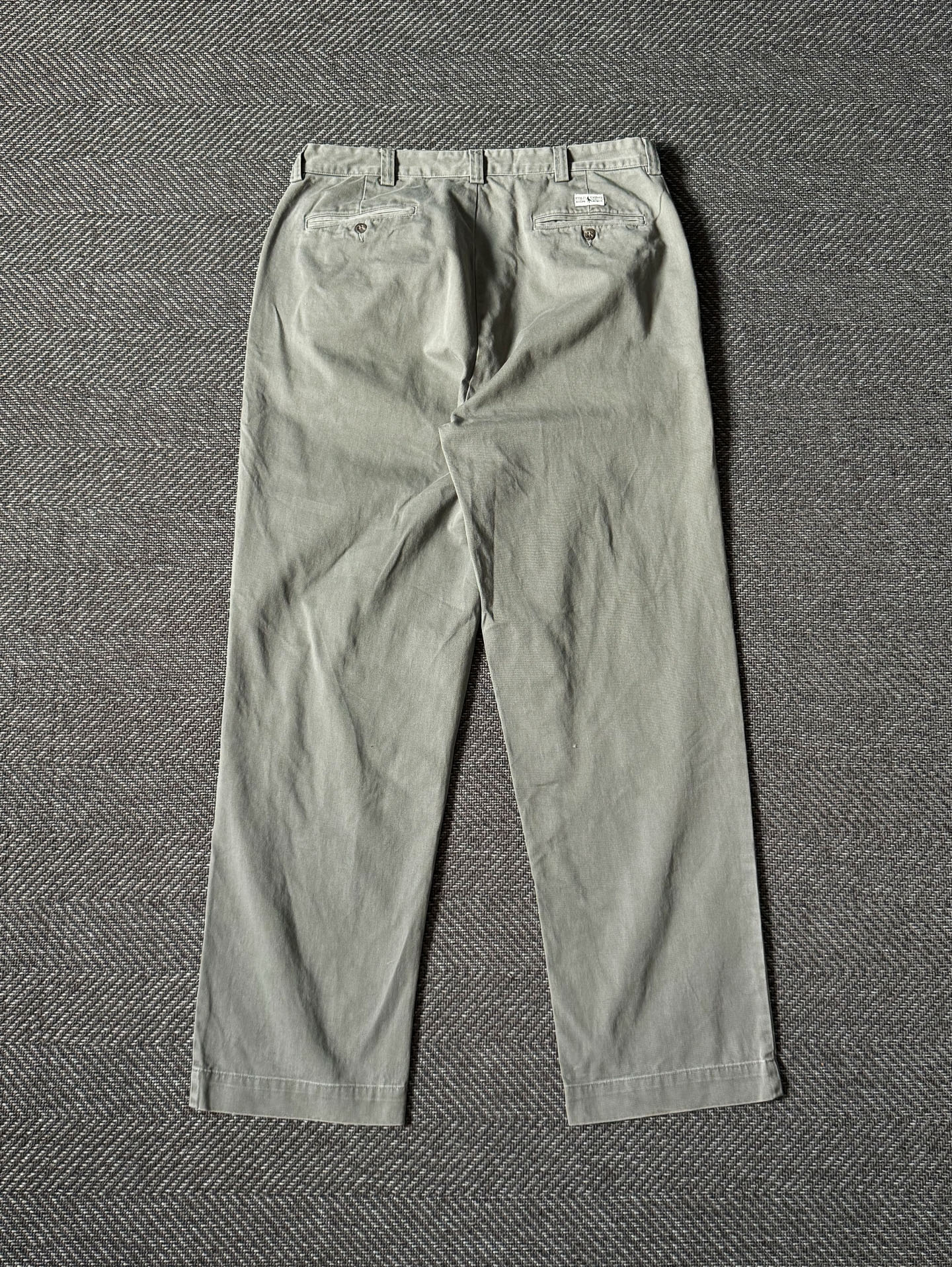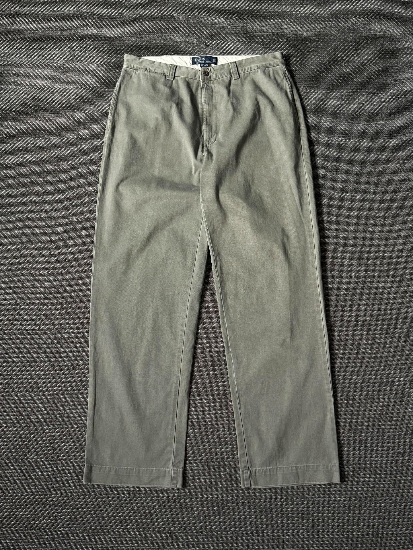 고밀도 100% 코튼 트윌 원단을 사용해 부드럽고 탄탄한 질감을 갖췄으며, YKK 지퍼 플라이, 내추럴 브라운 버튼, 그리고 Polo Chino Ralph Lauren 백라벨 등 당시 폴로 치노 라인의 정통 디테일이 잘 보존되어 있습니다. 은은한 세이지 그린 컬러로 어떤 코디에도 부드럽게 어울리며, 전체적으로 하자 없는 양호한 빈티지 컨디션을 유지하고 있습니다. 실측 34정도 되는 사이즈입니다.