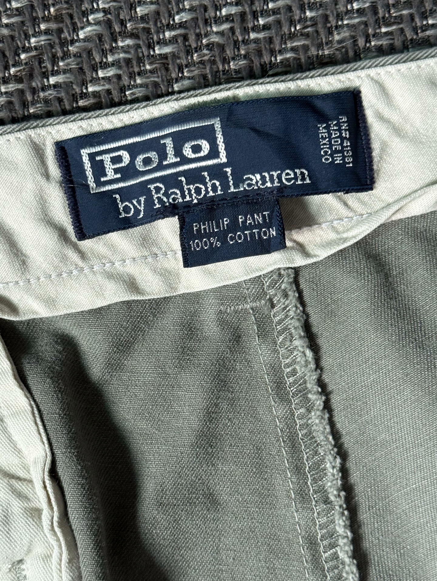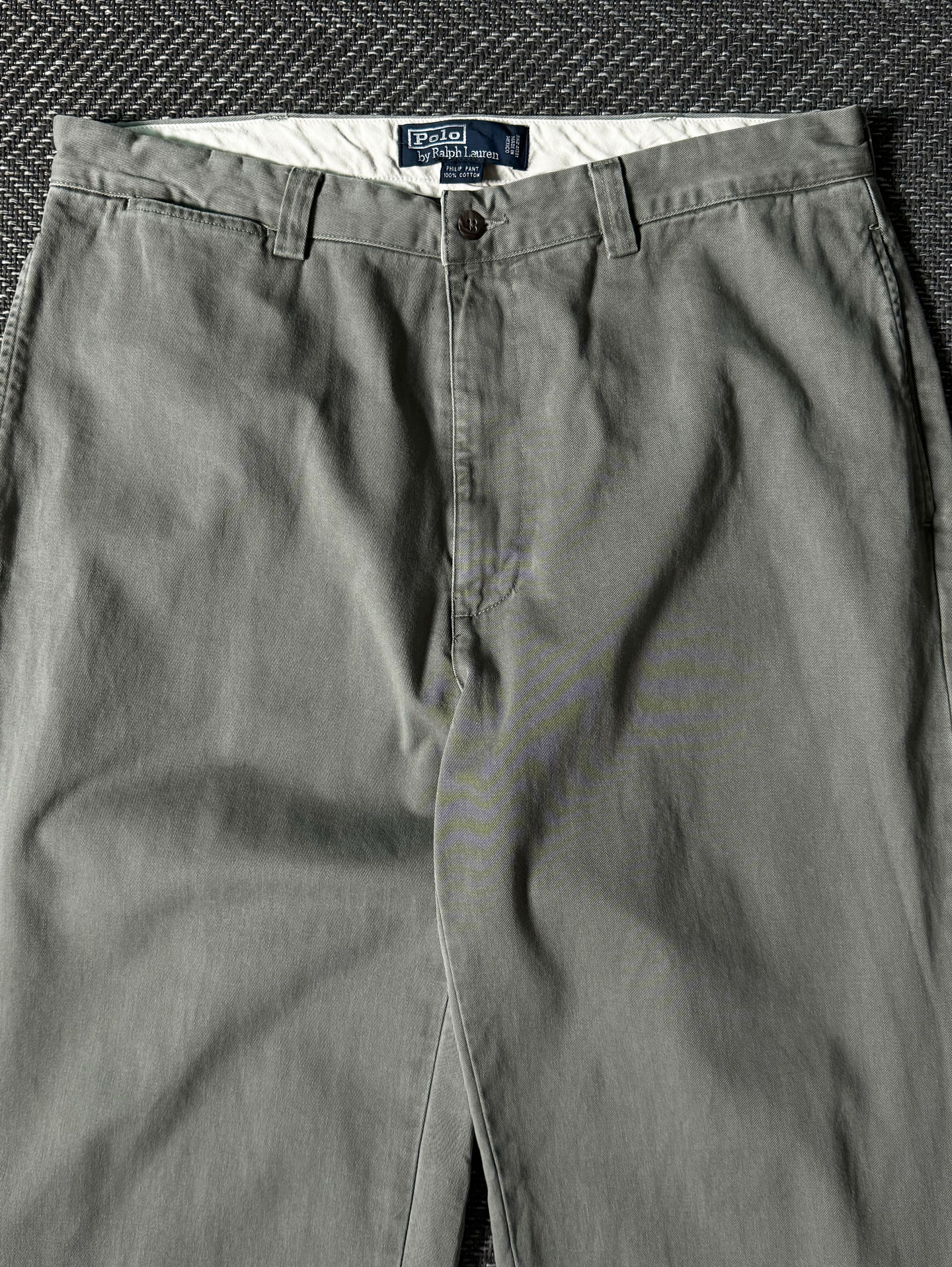 90년대 후반~2000년대 초반 생산된 Polo Ralph Lauren의 클래식 치노 팬츠, Philip Pant 모델입니다. 플리츠가 없는 플랫프런트 디자인으로 보다 간결하고 현대적인 실루엣을 보여주며, 허리부터 밑단까지 자연스럽게 떨어지는 스트레이트핏으로 구성되어 있습니다.