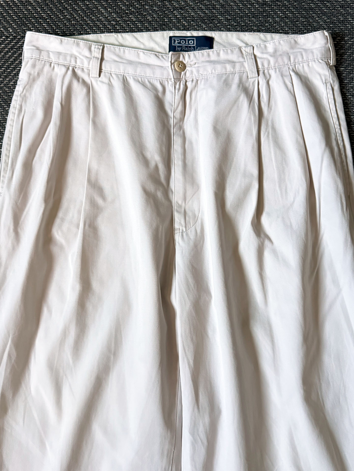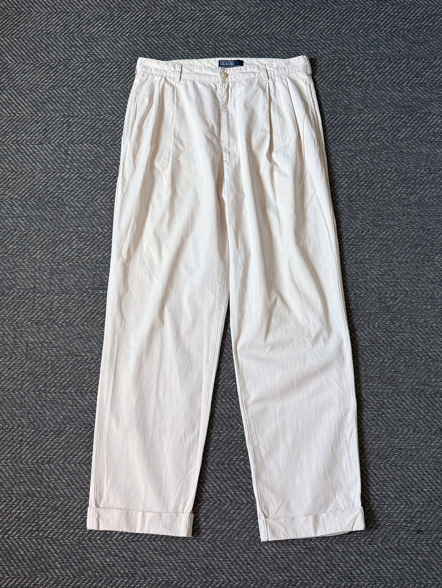 90년대 생산된 Polo Ralph Lauren의 클래식 치노 팬츠입니다. 허리선 아래로 자연스럽게 떨어지는 더블 플리츠 전면과 여유로운 스트레이트 실루엣이 특징으로, 고밀도 100% 코튼 트윌 원단으로 제작되어 가볍지만 탄탄한 질감을 지니며, 밑단은 오리지널 턴업(카프드 헴) 으로 마무리되어 있습니다.