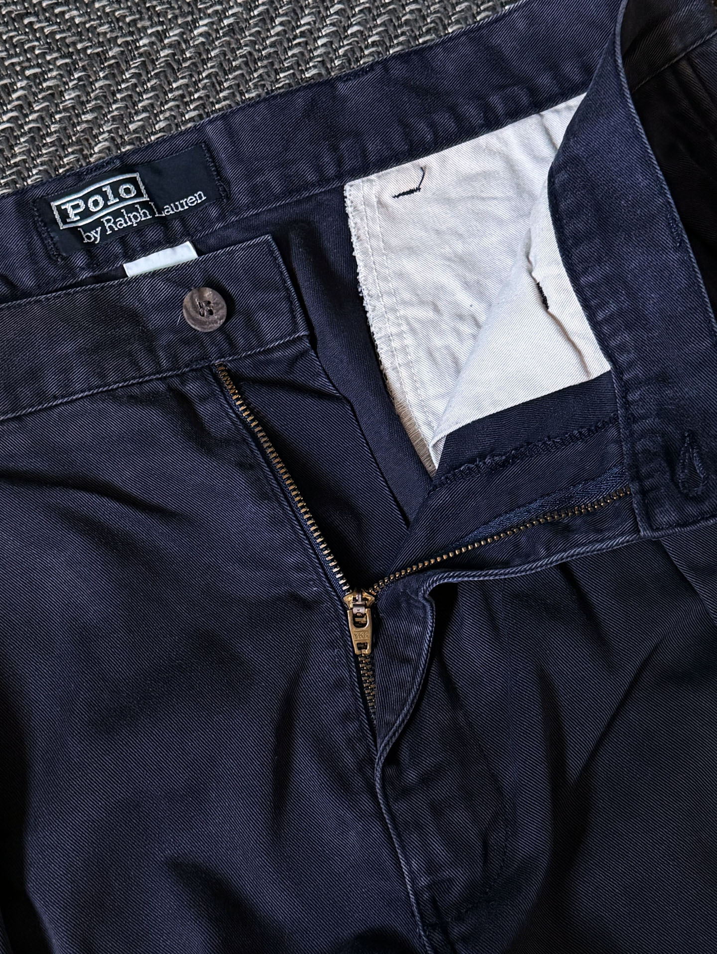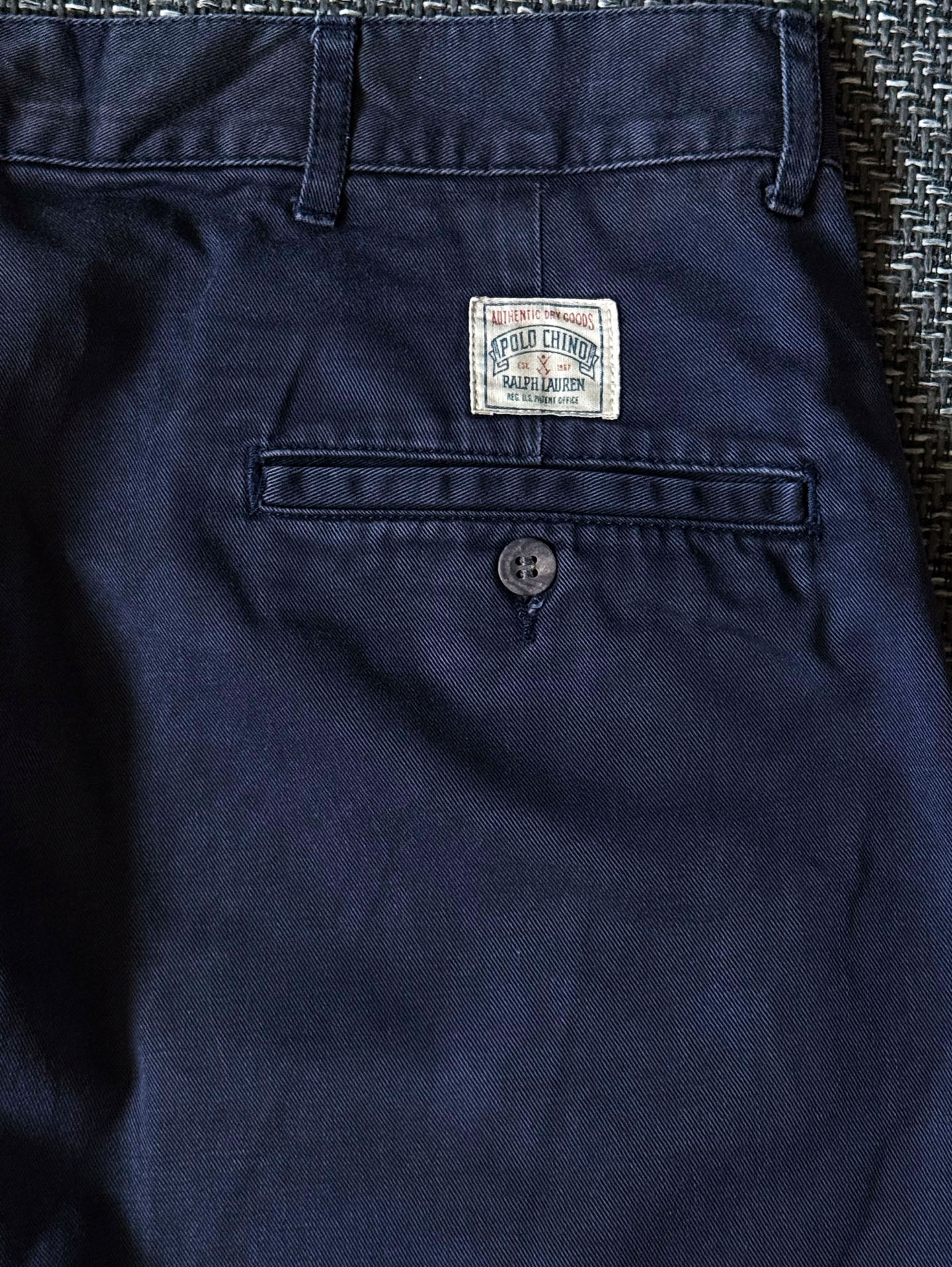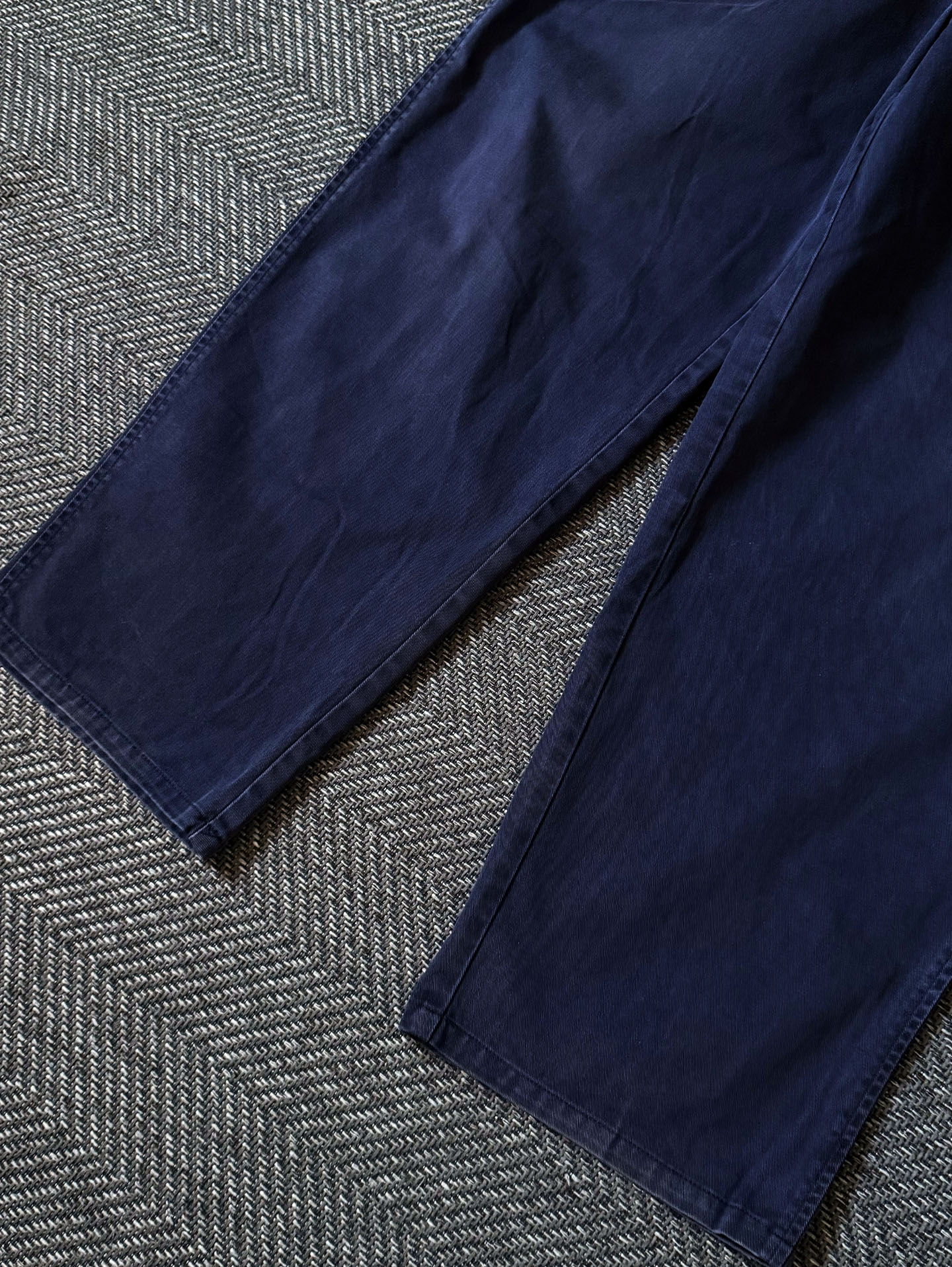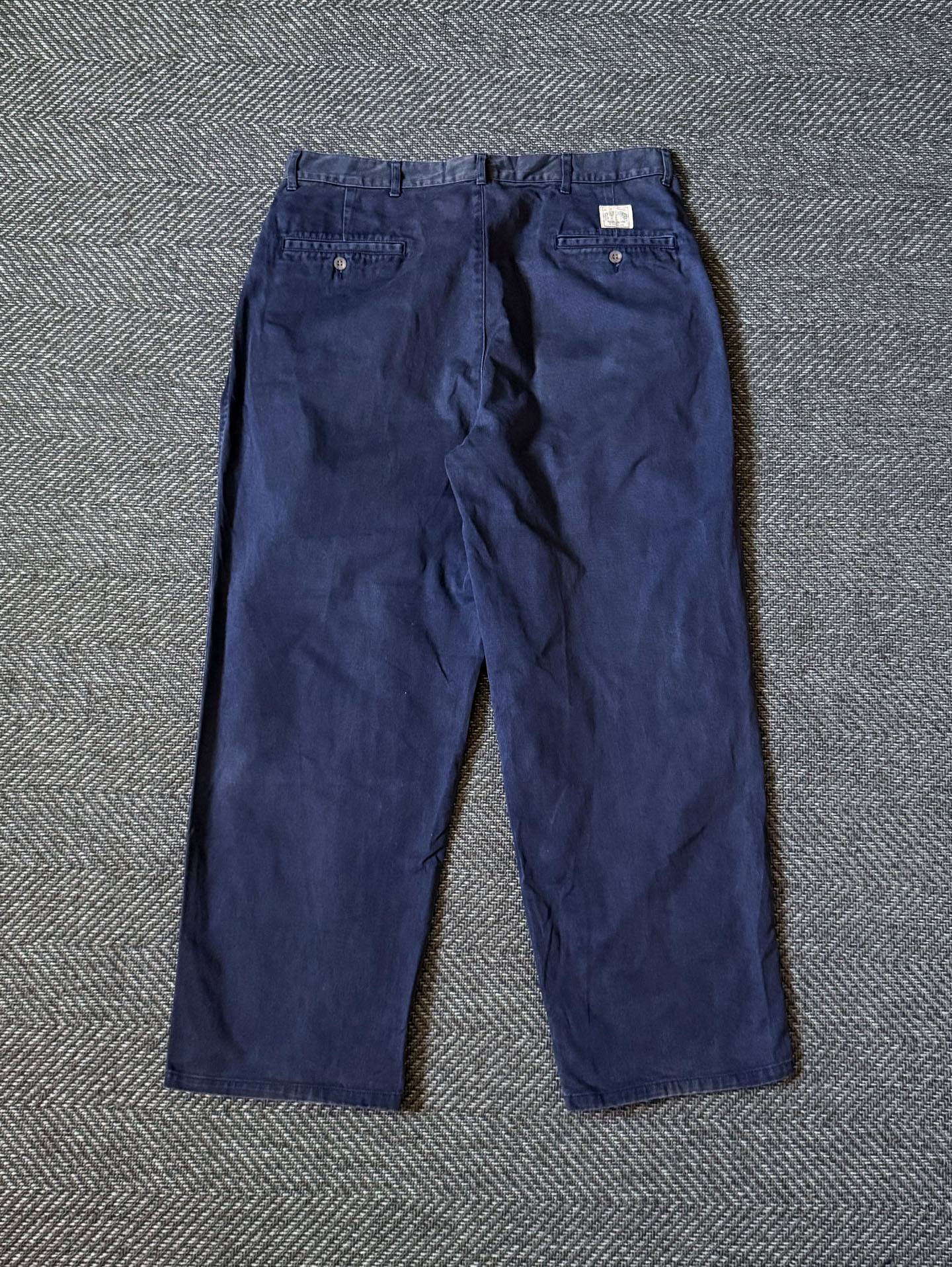 고밀도 100% 코튼 트윌 원단으로 제작되어 탄탄하면서도 부드러운 질감을 지녔으며, 지퍼 플라이에는 YKK 메탈 지퍼, 후면에는 Polo Chino Authentic Dry Goods 올드 라벨이 부착되어 있습니다. 딥 네이비 컬러 특유의 자연스러운 워싱감이 멋스럽고, 전체적으로 하자 없는 양호한 컨디션을 유지하고 있습니다. 실측 34정도 되는 사이즈입니다.