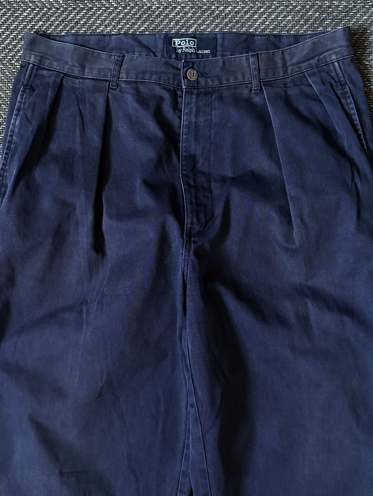 90년대 초반 생산된 Polo Ralph Lauren의 대표 치노 시리즈, “Polo Chino” 라인의 클래식 플리츠 팬츠입니다. 허리 아래로 자연스럽게 떨어지는 더블 플리츠 전면 디자인과 적당히 여유로운 스트레이트 실루엣으로 완성된 클래식한 핏이 특징입니다.