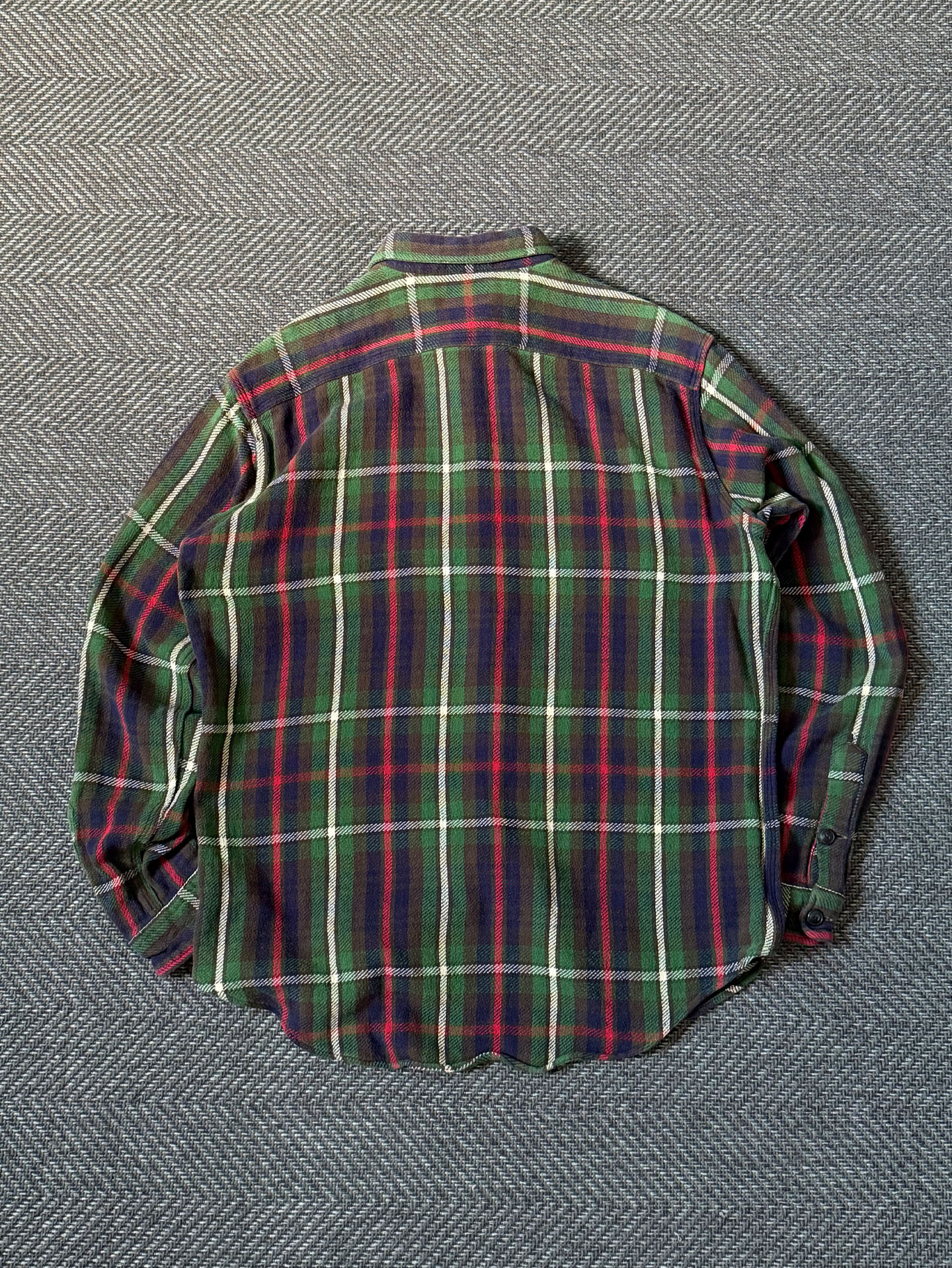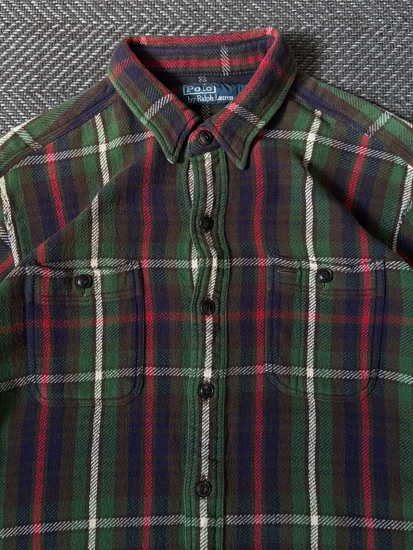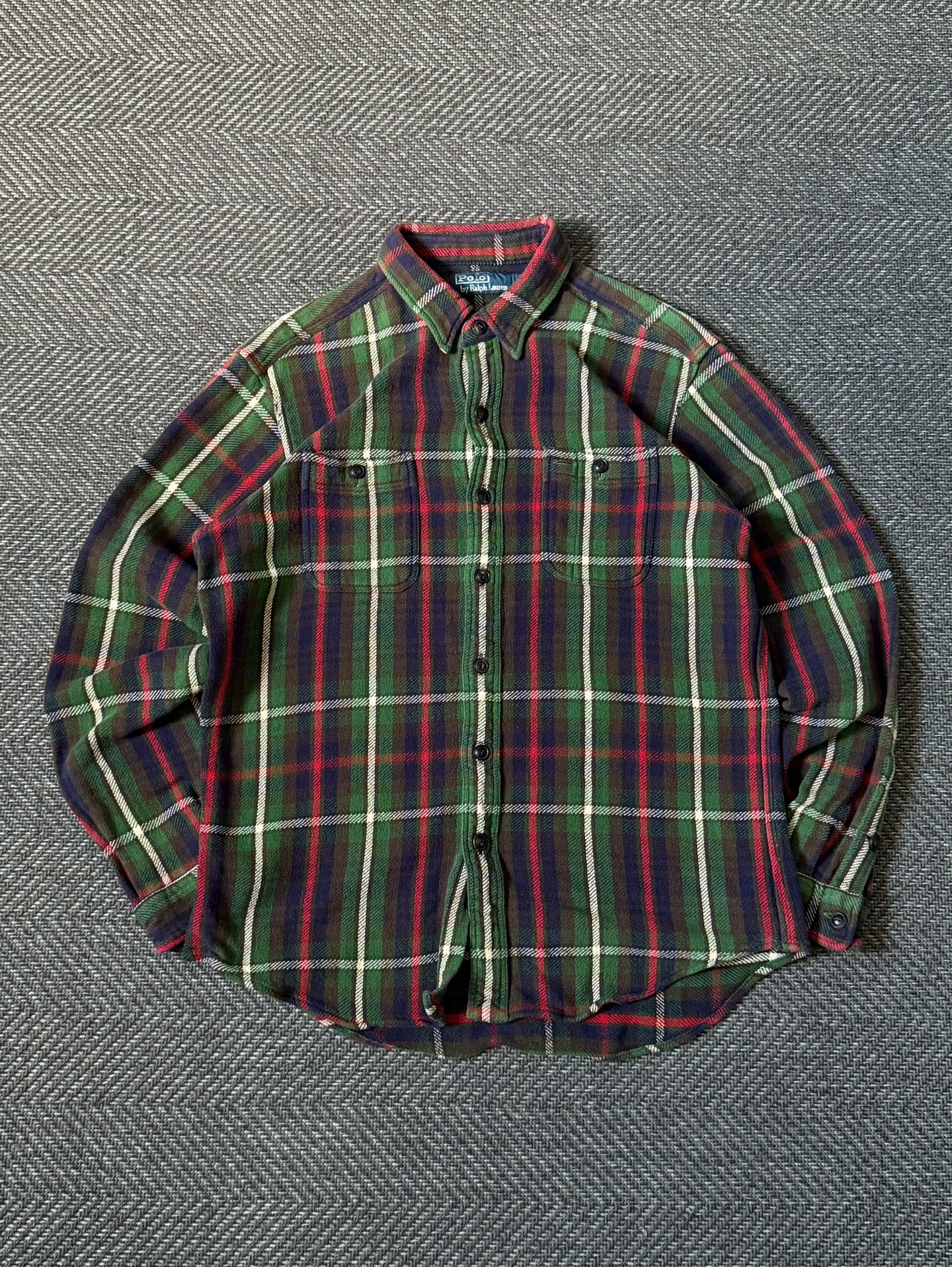 90년대 폴로 랄프로렌 특유의 클래식 타탄 패턴이 돋보이는 헤비 플란넬 셔츠입니다. 두께감 있는 울·코튼 혼방 플란넬 원단으로 제작되어 겨울 시즌 단품·이너 모두 활용도가 높습니다. 양쪽 가슴 포켓, 버튼다운 칼라, 90s 폴로 특유의 클래식 핏 실루엣이 특징이며, 깊이감 있는 네이비–그린–레드 조합의 체크 패턴이 빈티지 매력을 더합니다. 사진에서 보이는 소매 부분의 아주 미세한 원단 헤짐 외에는 전반적으로 양호한 컨디션을 유지하고 있습니다.