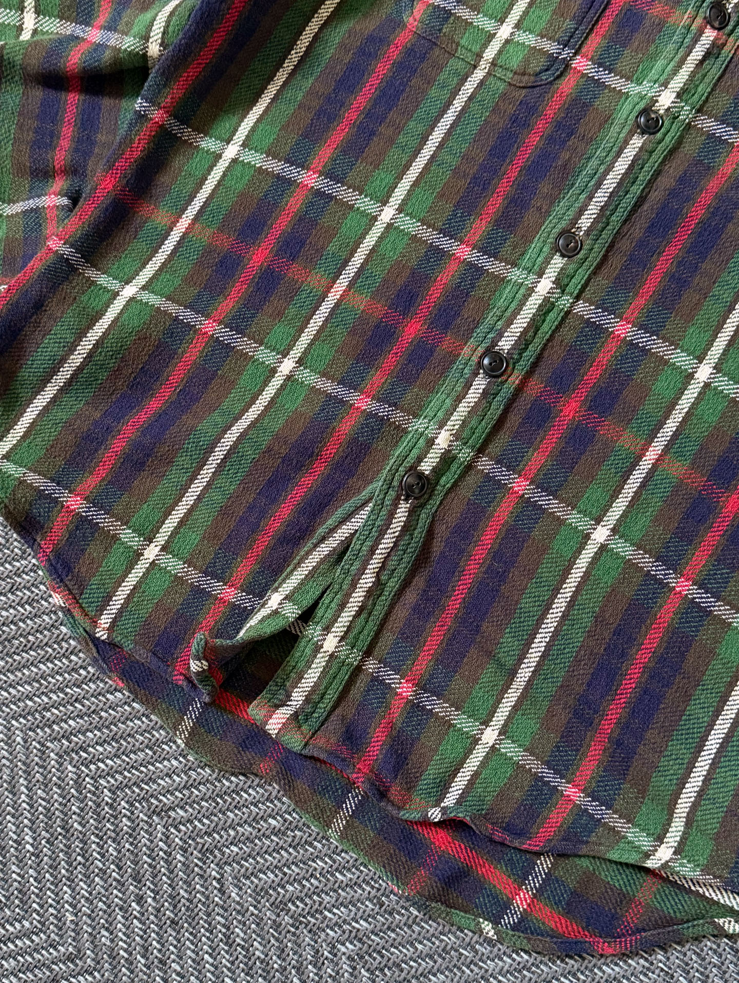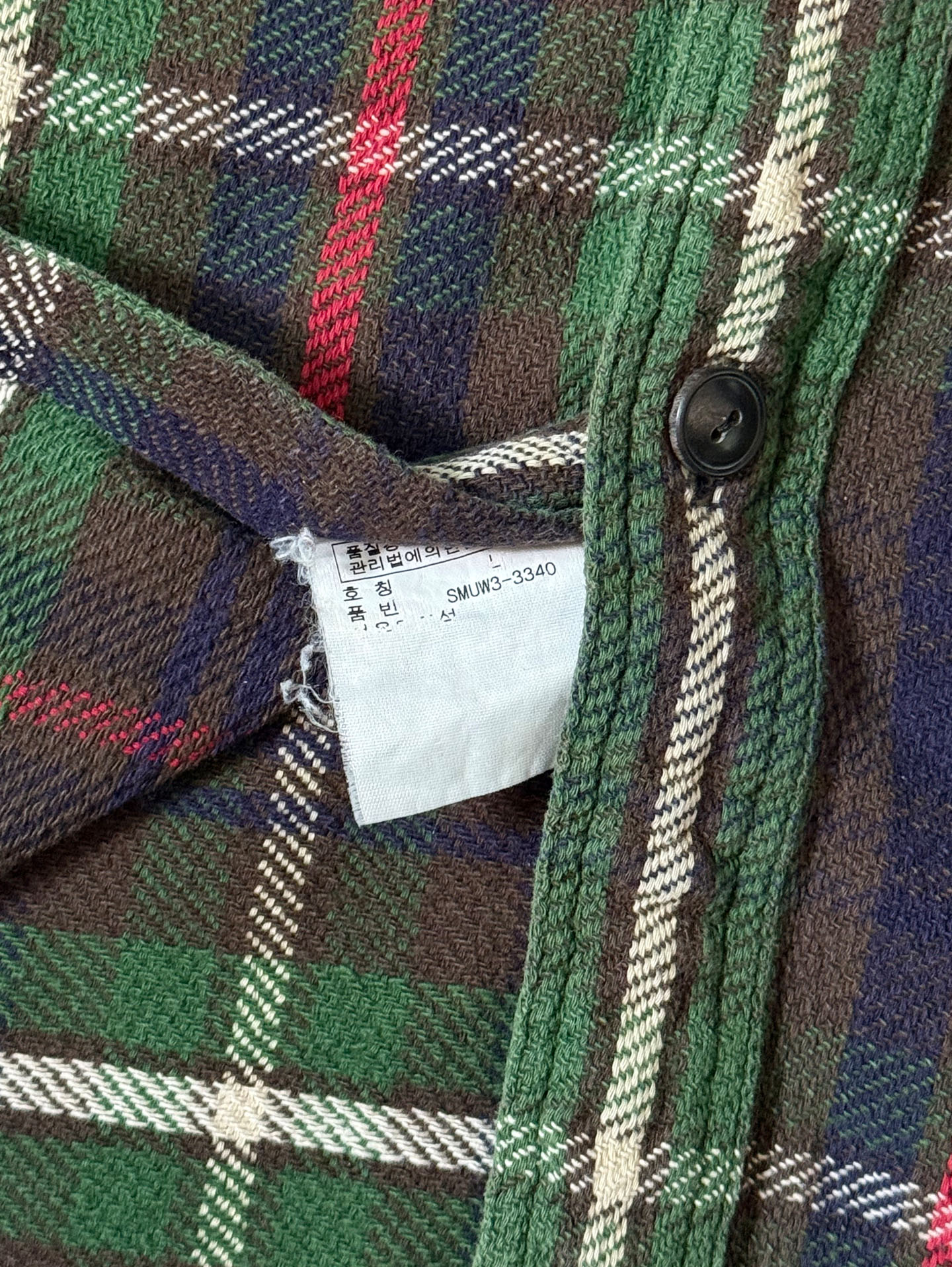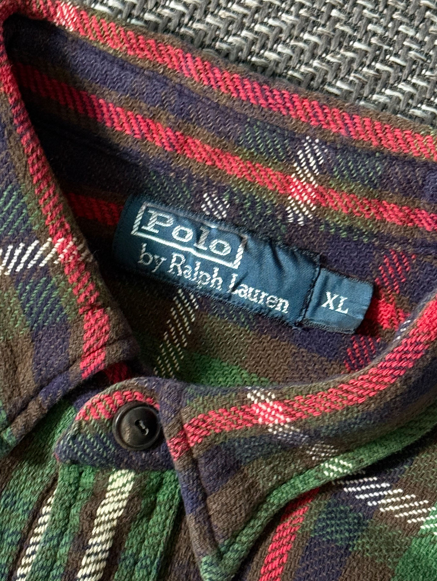 90년대 폴로 랄프로렌 특유의 클래식 타탄 패턴이 돋보이는 헤비 플란넬 셔츠입니다. 두께감 있는 울·코튼 혼방 플란넬 원단으로 제작되어 겨울 시즌 단품·이너 모두 활용도가 높습니다. 양쪽 가슴 포켓, 버튼다운 칼라, 90s 폴로 특유의 클래식 핏 실루엣이 특징이며, 깊이감 있는 네이비–그린–레드 조합의 체크 패턴이 빈티지 매력을 더합니다. 사진에서 보이는 소매 부분의 아주 미세한 원단 헤짐 외에는 전반적으로 양호한 컨디션을 유지하고 있습니다.