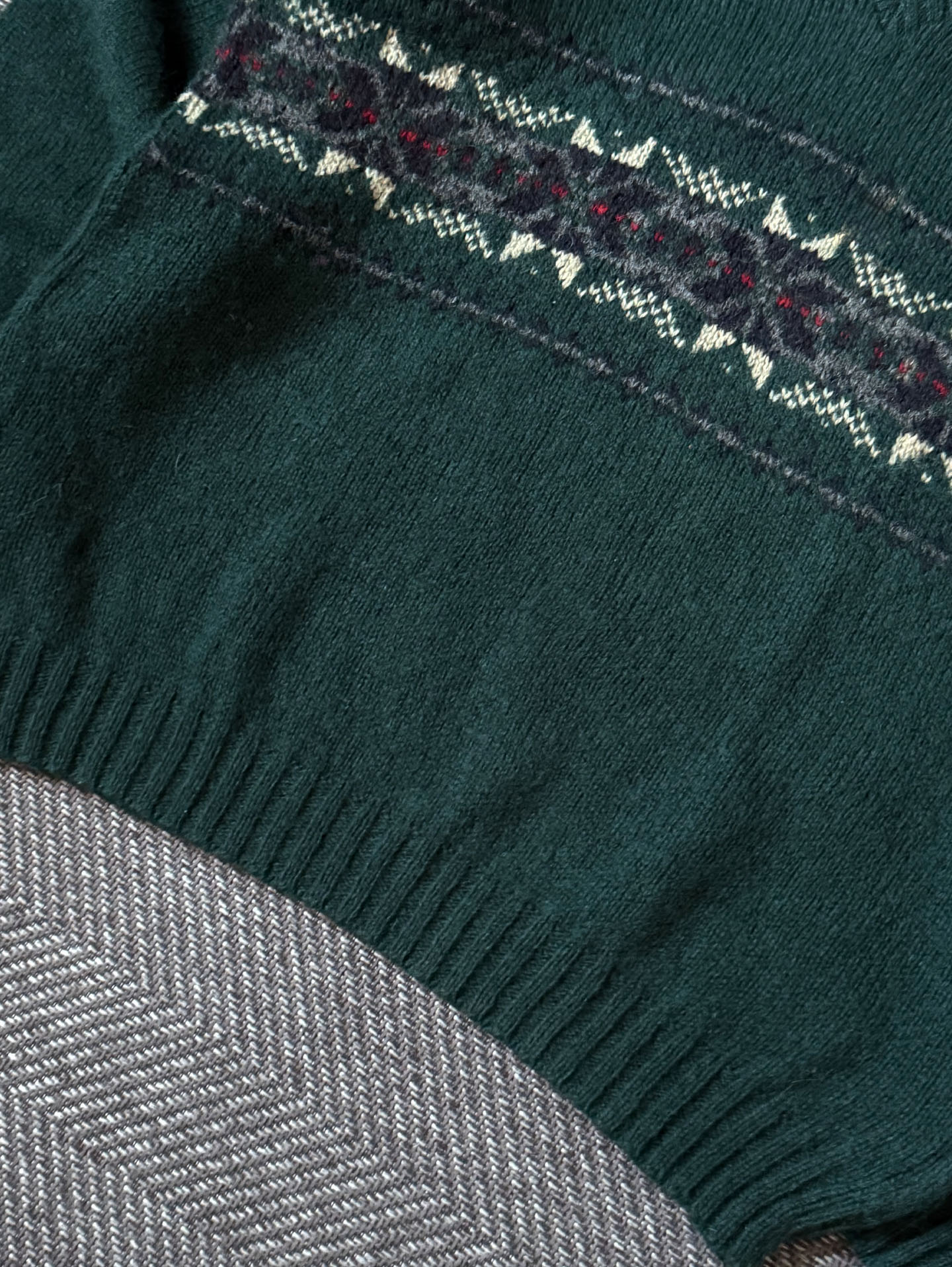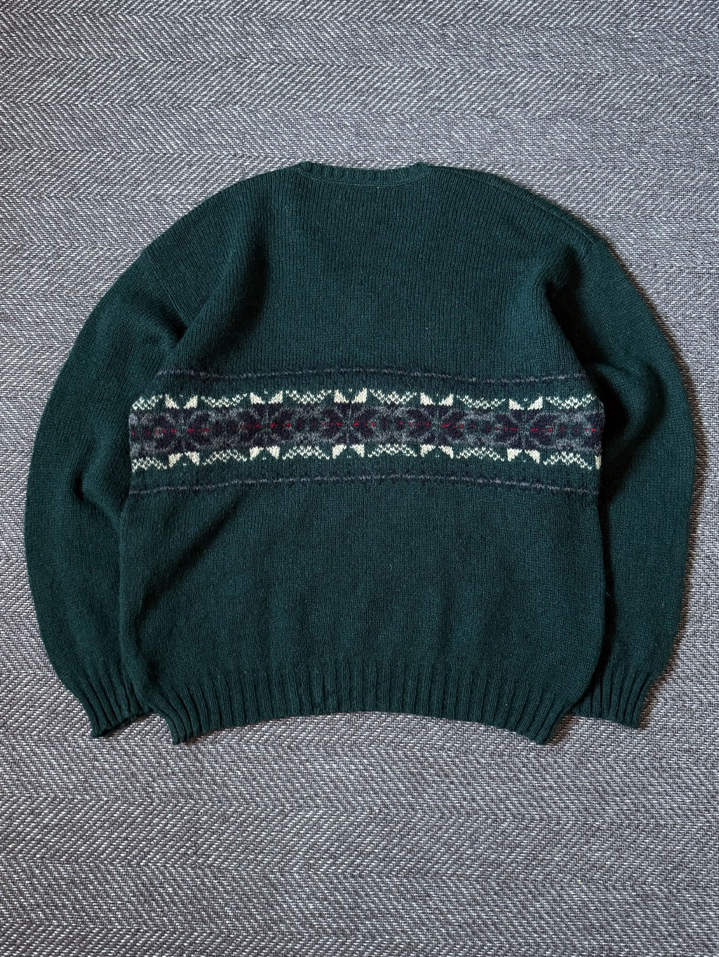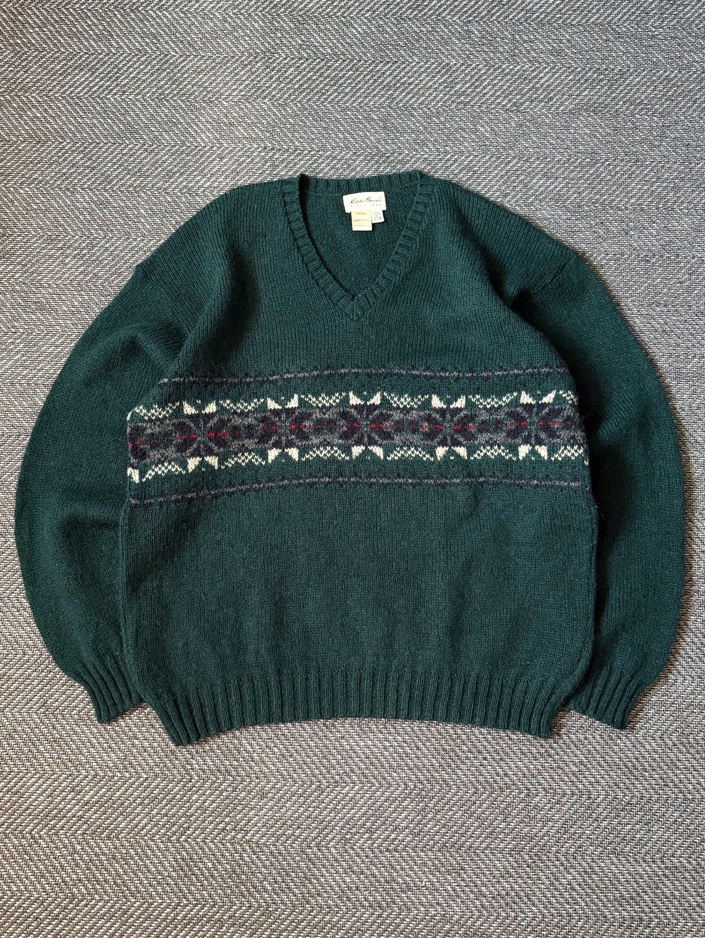 90년대 생산된 Eddie Bauer 울 블렌드 V넥 스웨터로, 클래식한 페어아일(Fair Isle) 패턴이 가슴 전체를 감싸는 디자인이 특징입니다. 짙은 그린 톤의 울 텍스처와 네이비·아이보리·레드가 조화된 패턴이 빈티지 특유의 무드를 잘 보여주며, 80% 울 + 20% 나일론 혼방으로 따뜻하면서도 형태가 안정적으로 유지되는 제품입니다.