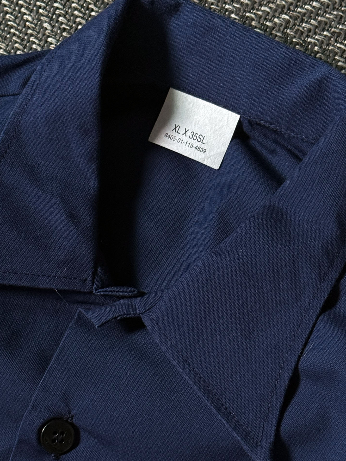 미국 해군에서 실제로 지급되었던 US Navy Utility Shirt 모델로, 군납 NSN 넘버 8405-01-113-4639가 확인되는 정식 지급품입니다. 부드러우면서도 탄탄한 다크 네이비 코튼 원단으로 제작되어 데일리 워크웨어·밀리터리 스타일과 자연스럽게 어울립니다.