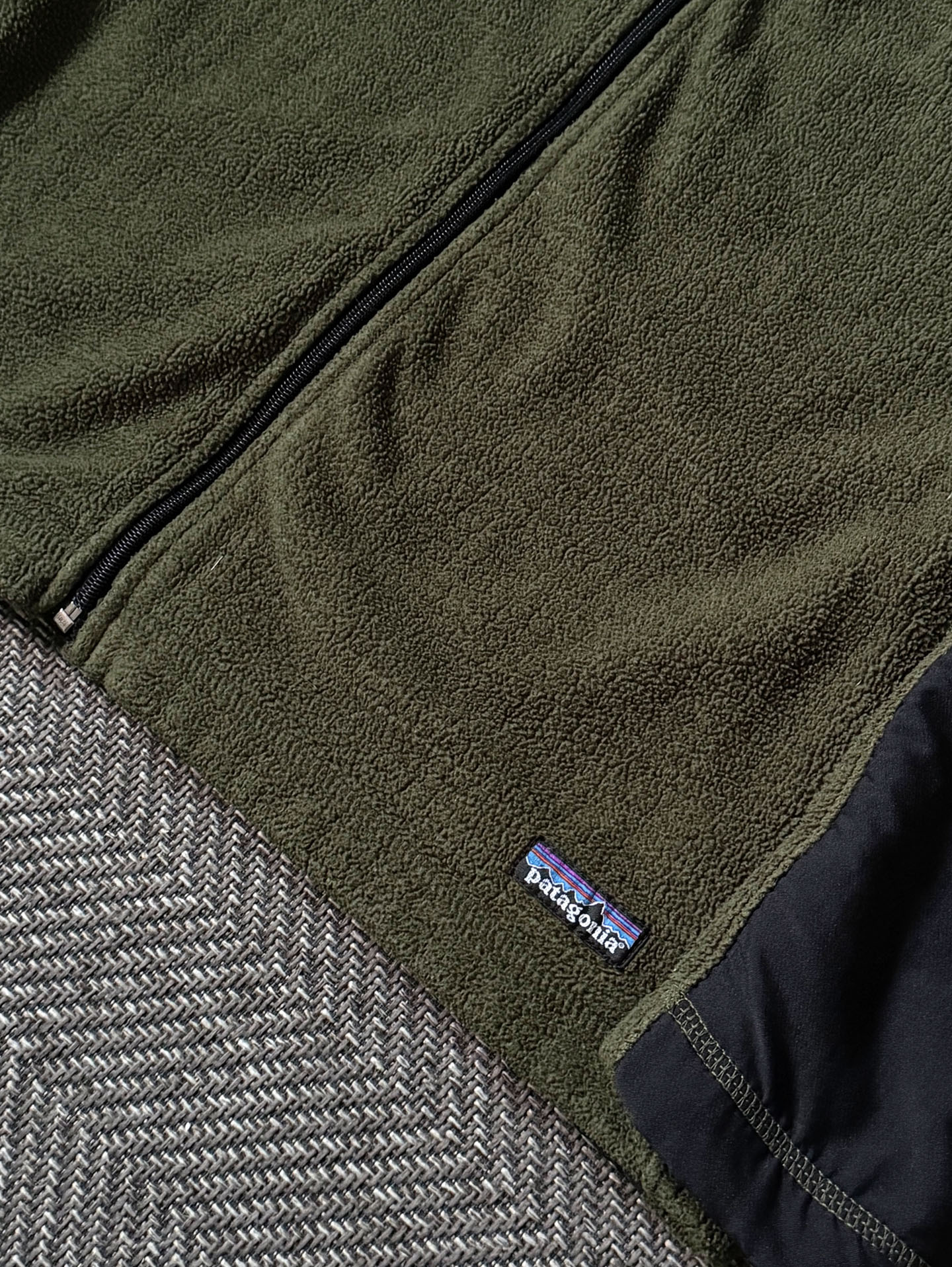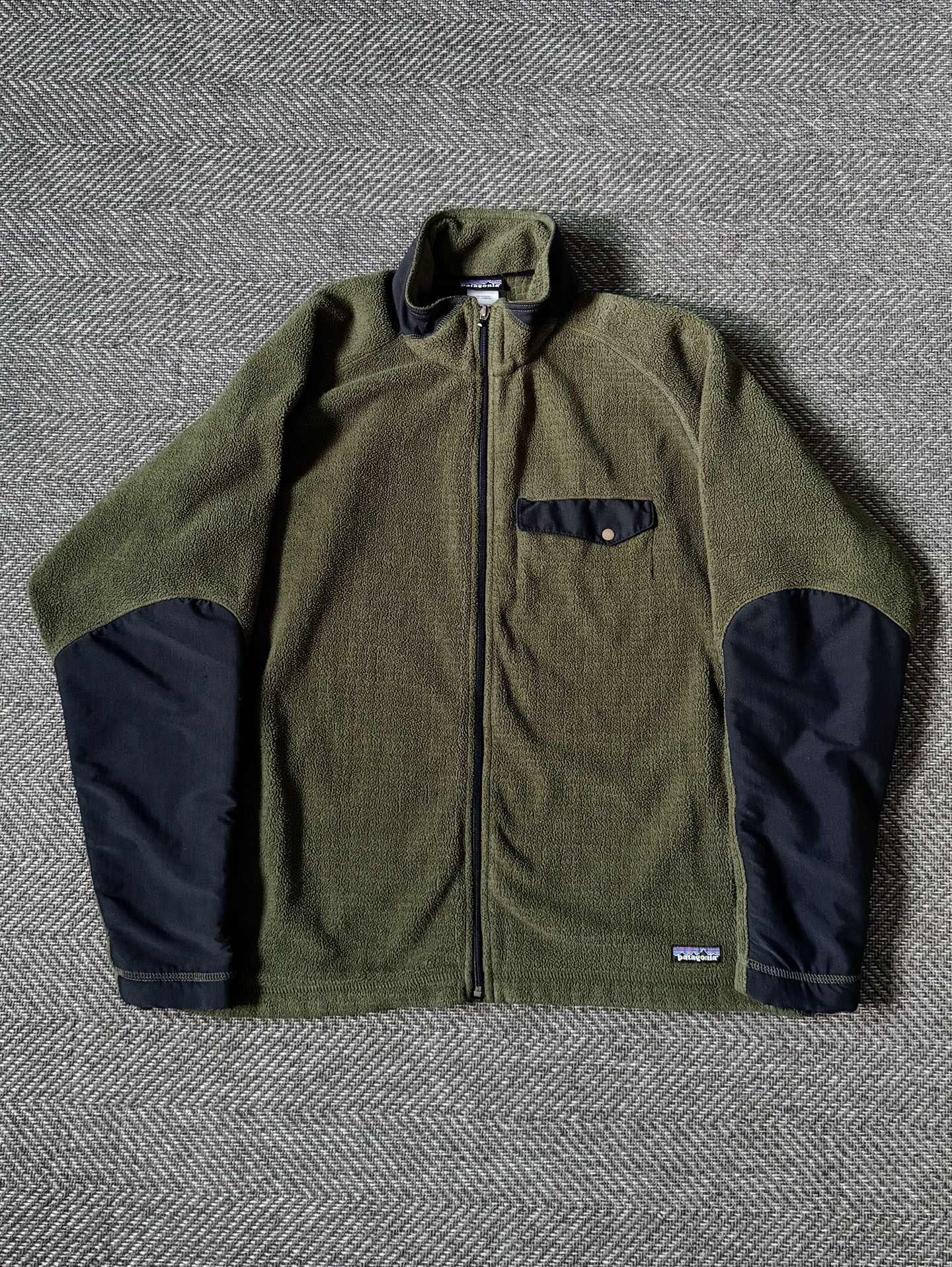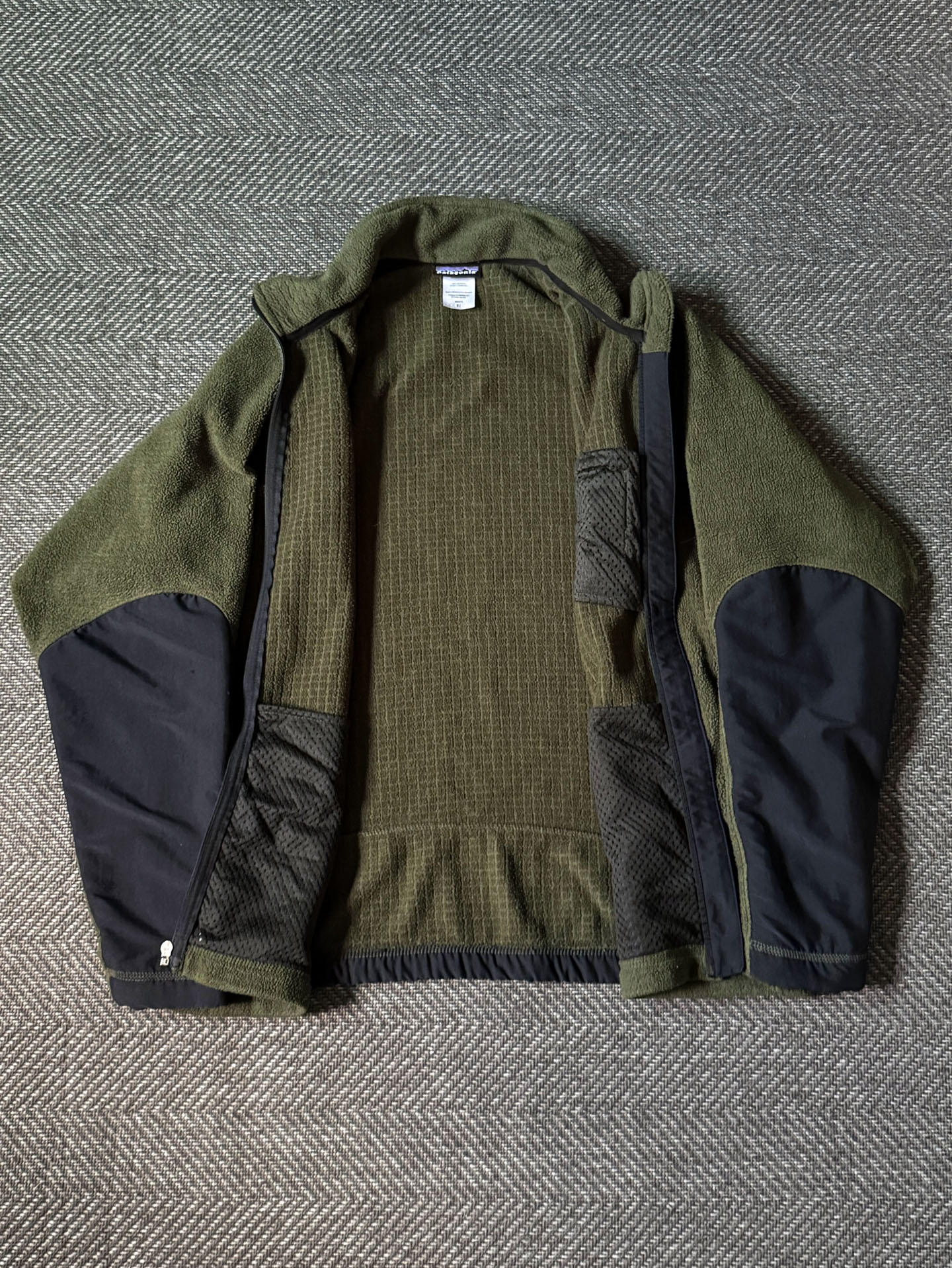 파타고니아의 R2 Techface 계열로 추정되는 풀집 플리스 재킷으로, 올리브 바디와 블랙 보강 패널의 대비가 돋보이는 제품입니다. 당시 파타고니아가 R 시리즈에 적용하던 그리드 구조의 내부 플리스(Polartec Thermal Pro 계열)와 외부의 클래식한 퍼텍스 스타일 나일론 패널이 조합된 형태로, 중·후반 2000년대(약 2005~2008년경) 생산된 아이템으로 추정됩니다.