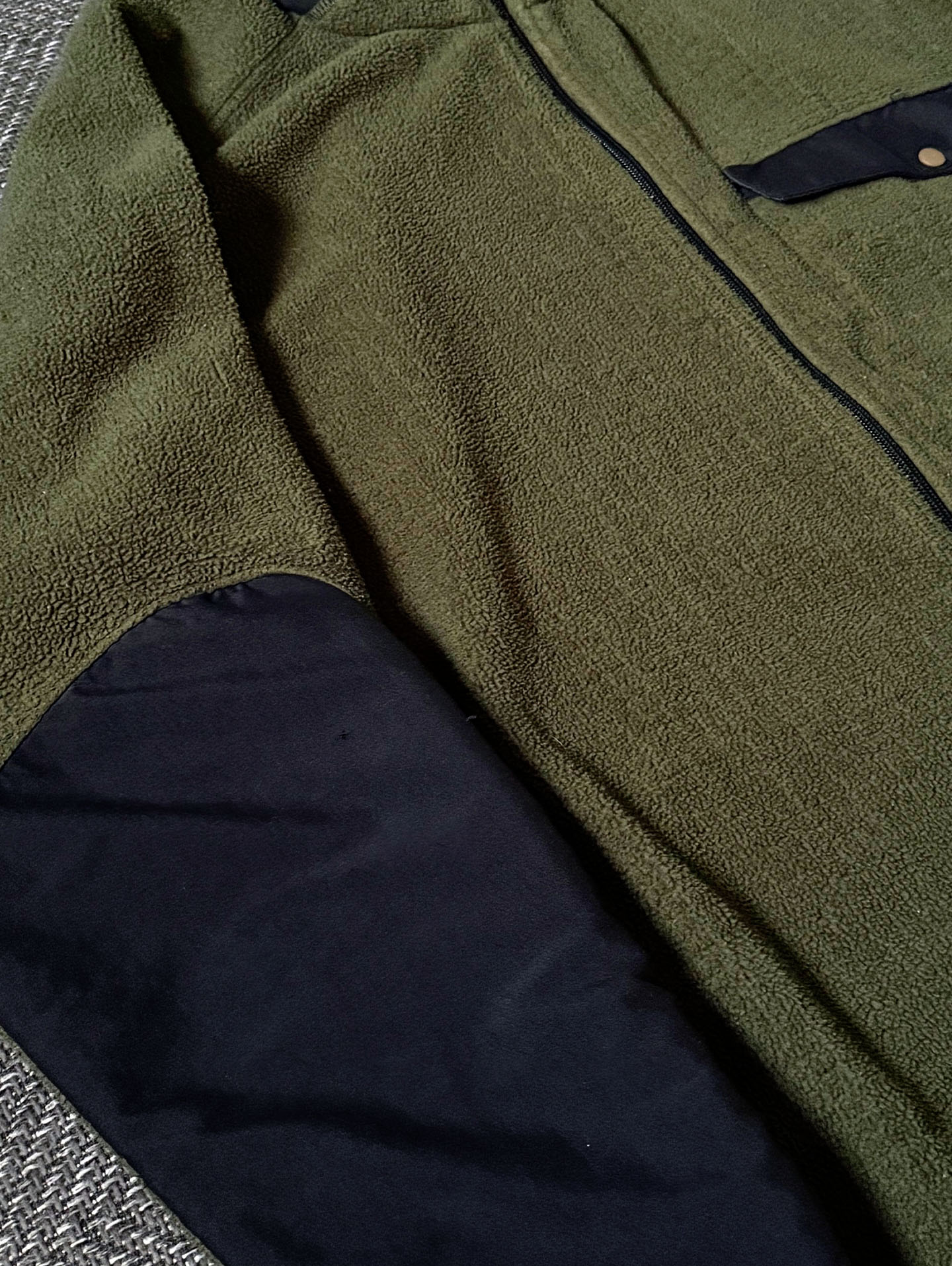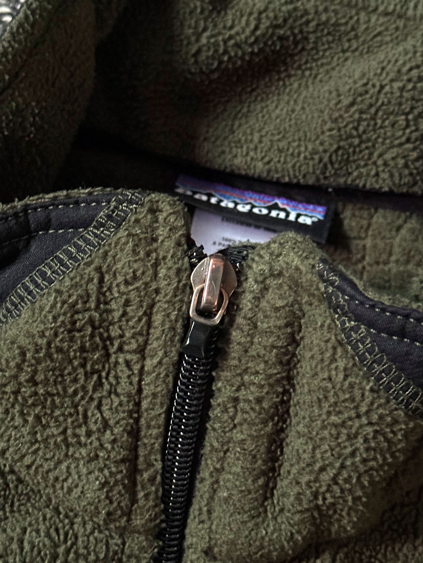 특히 초창기 R 시리즈 특유의 가벼우면서도 보온력 좋은 플리스 소재와, 팔꿈치·옆구리·소매 하단에 적용된 나일론 보강 디자인이 매력적이며, 올드 파타고니아 특유의 실루엣과 색감(올리브+블랙)이 조화를 이루는 수집가 선호도가 높은 모델입니다.