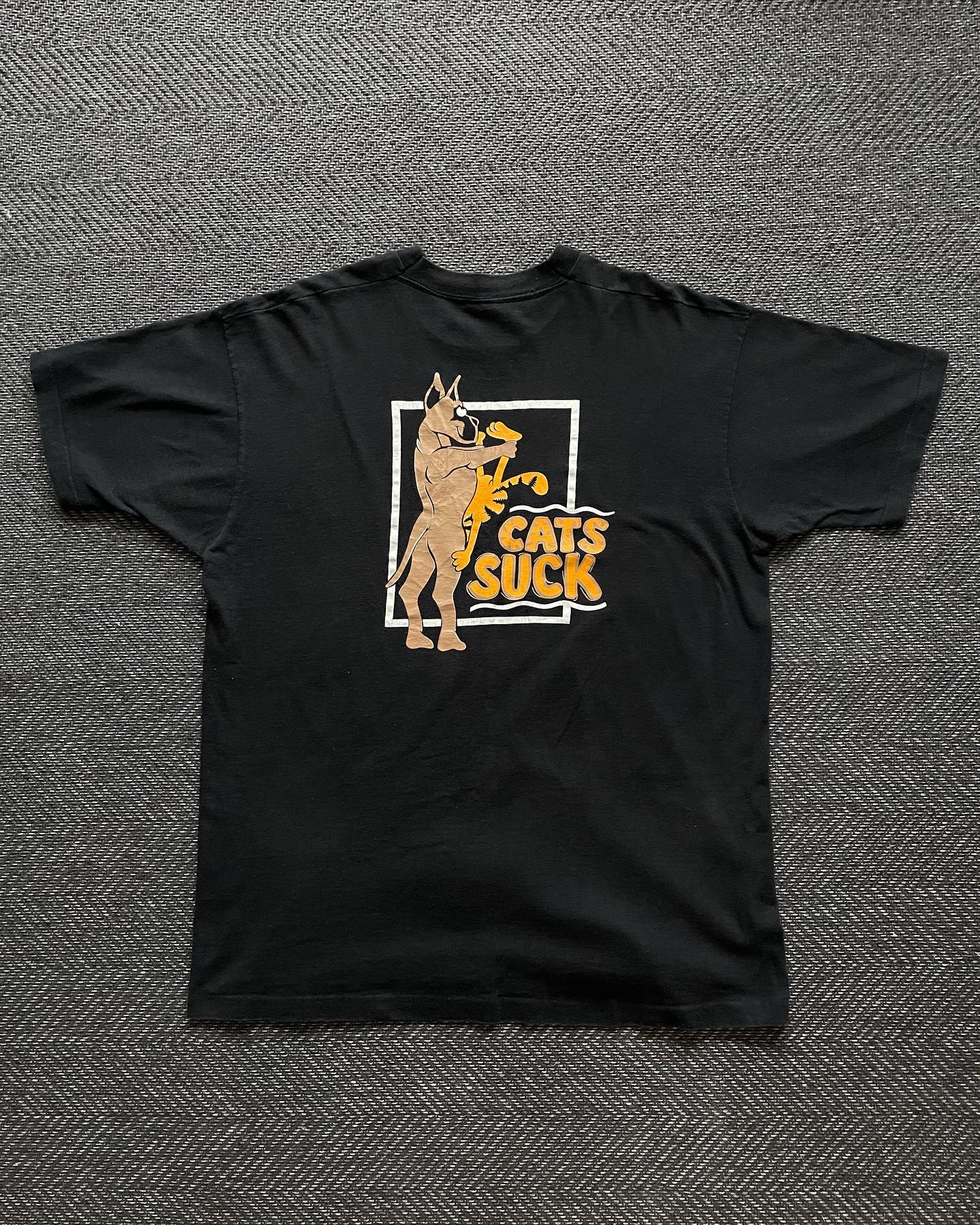 90년대 미국에서 방영된 만화인 배드독 시리즈의 싱글 스티치 반팔티입니다. 미국만의 자유로운 느낌의 카툰 프린팅이 매력적인 제품이며 빈티지한 느낌의 작은 데미지 존재하며 그 외에 준수한 컨디션입니다. 실측 105 정도 되는 사이즈감입니다.