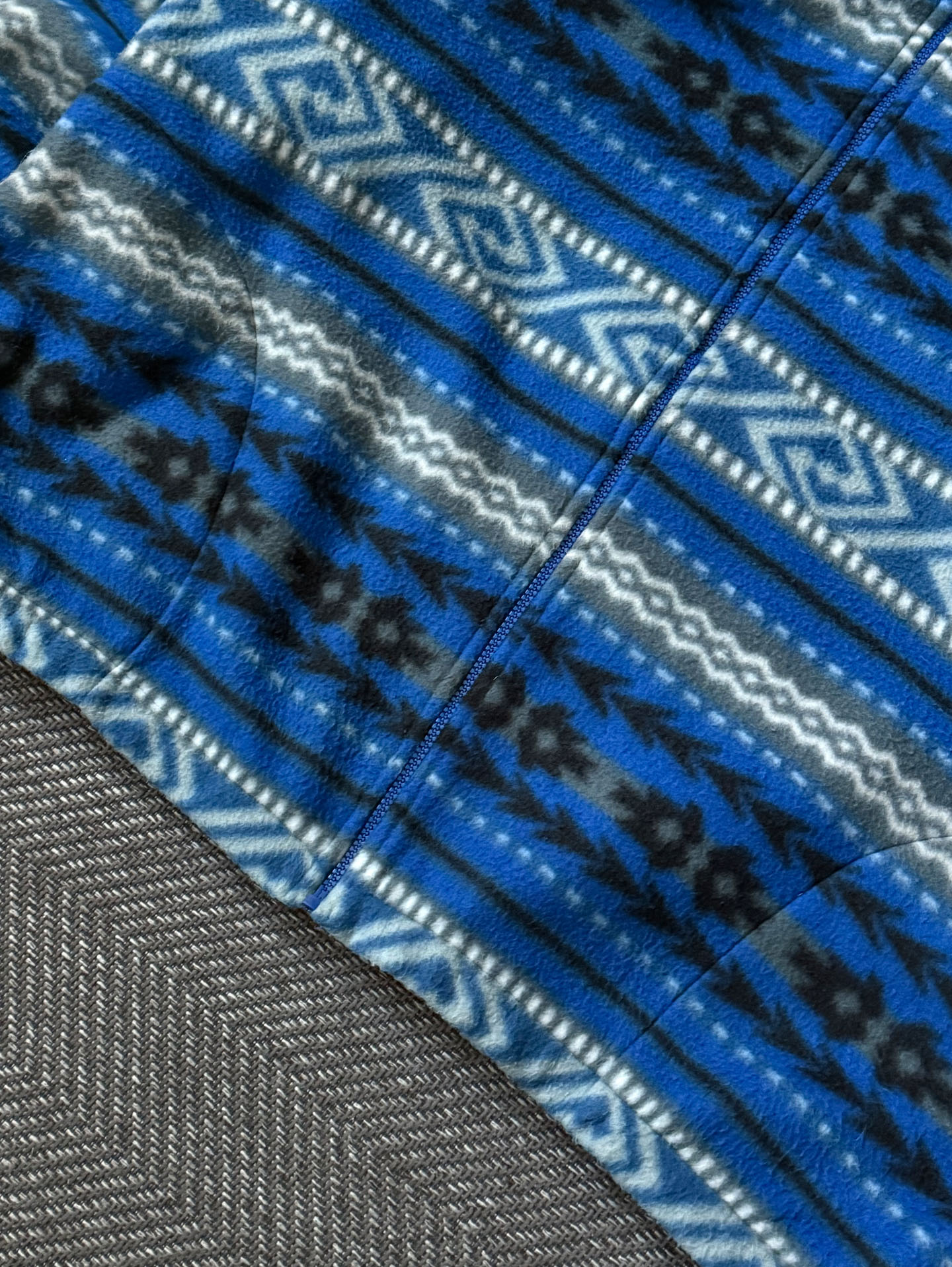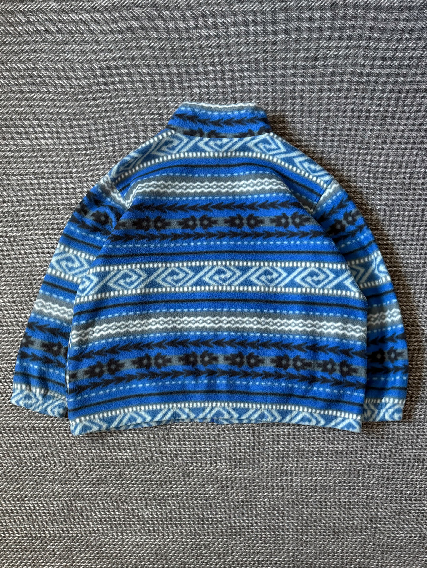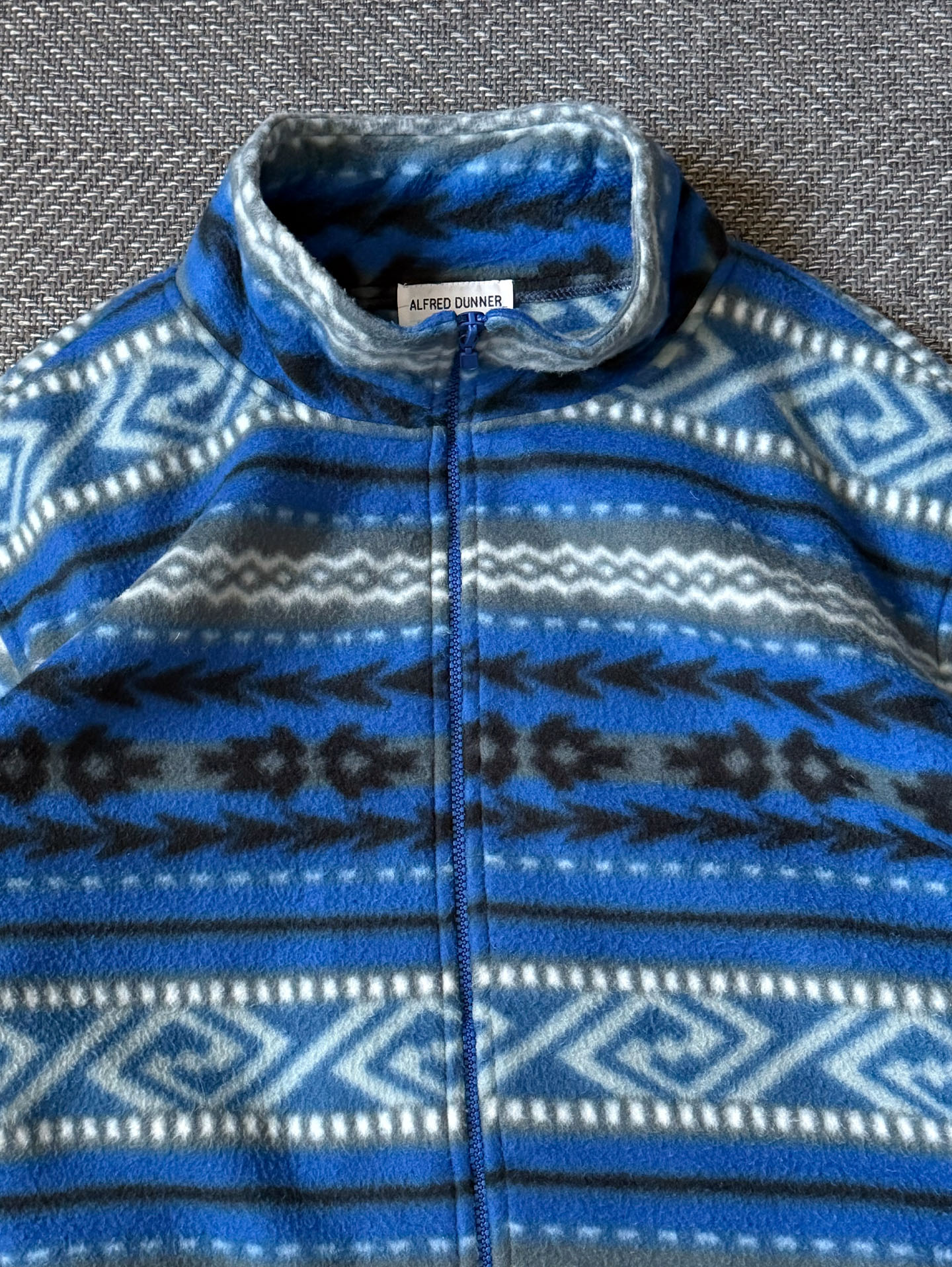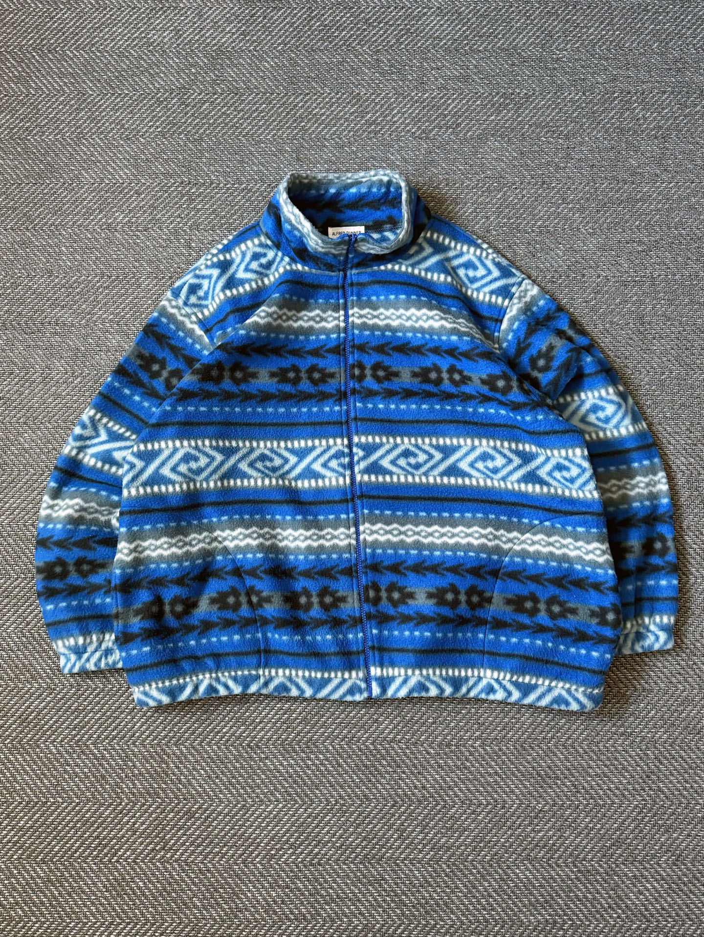 Alfred Dunner의 빈티지 집업 플리스 자켓으로, 블루 톤을 중심으로 한 에스닉한 패턴이 전면에 균형감 있게 배치된 디자인이 인상적인 제품입니다. 부드러운 폴리에스터 플리스 소재로 제작되어 가볍지만 보온성이 뛰어나며, 하이넥 집업 구조로 단독 착용은 물론 이너 레이어로도 활용도가 높은 아이템입니다. 전체적으로 여유 있는 실루엣으로 제작되어 스트릿 캐주얼이나 빈티지 아웃도어 무드의 스타일링에 자연스럽게 어울리며, 패턴과 컬러 조합에서 90년대 후반에서 2000년대 초반 빈티지 특유의 감성이 잘 드러납니다. 사용감이나 오염, 하자 없이 전반적으로 양호한 컨디션을 유지하고 있으며, 현재는 동일한 디자인을 찾기 어려운 빈티지 매물로 소장 및 실착 모두에 매력적인 제품입니다.