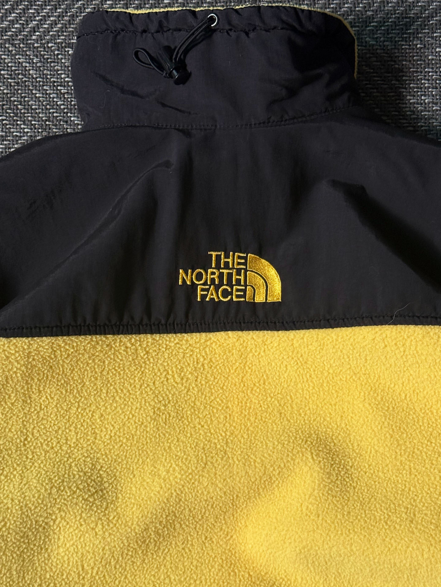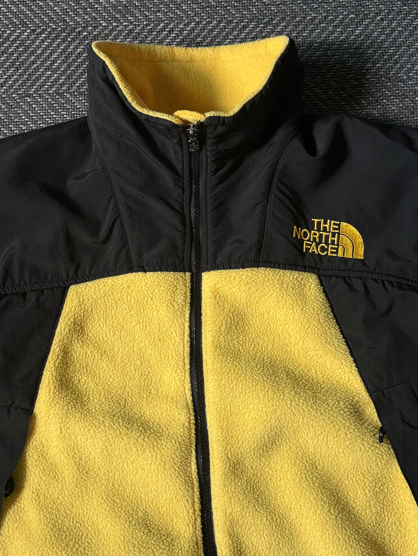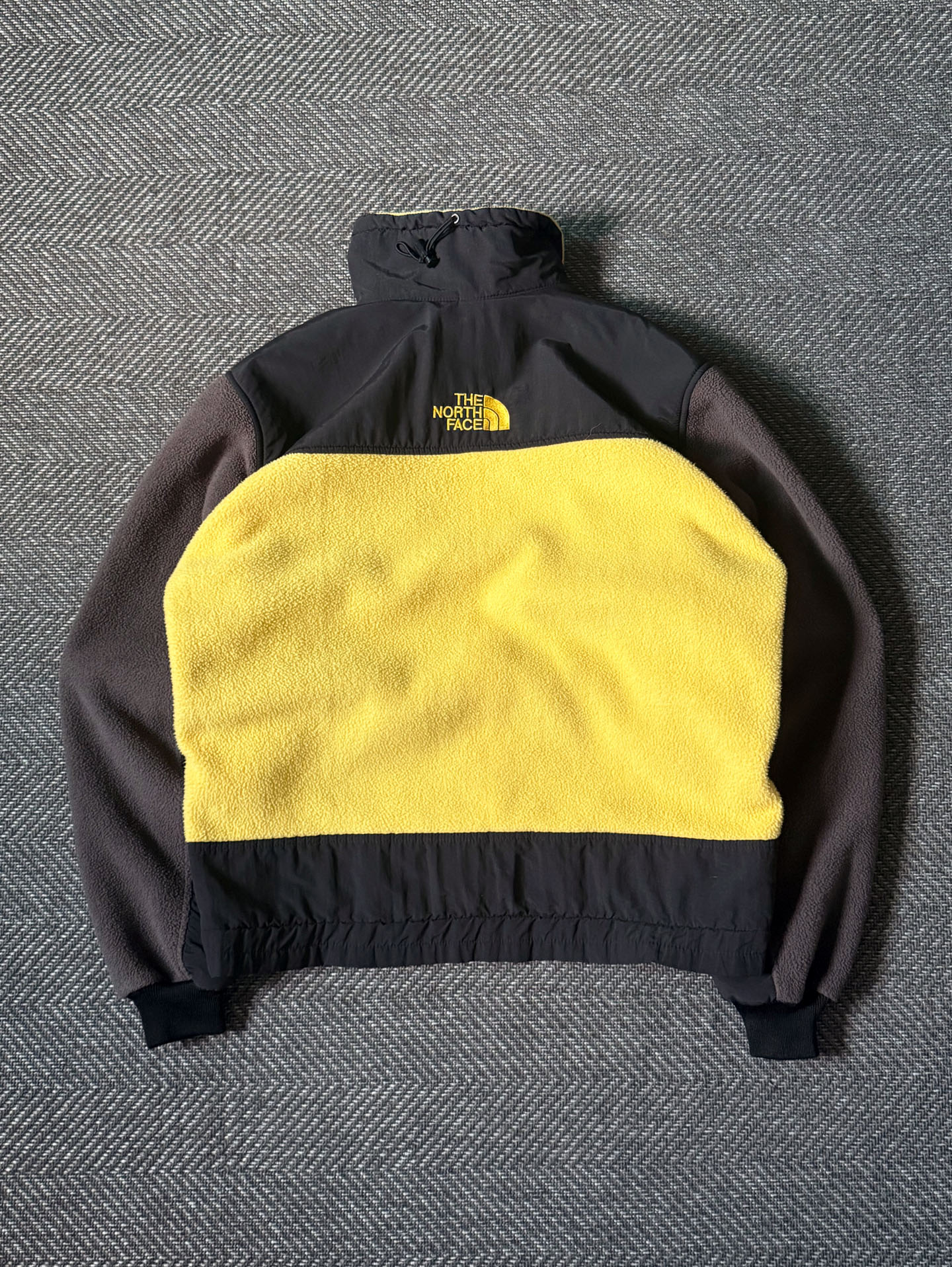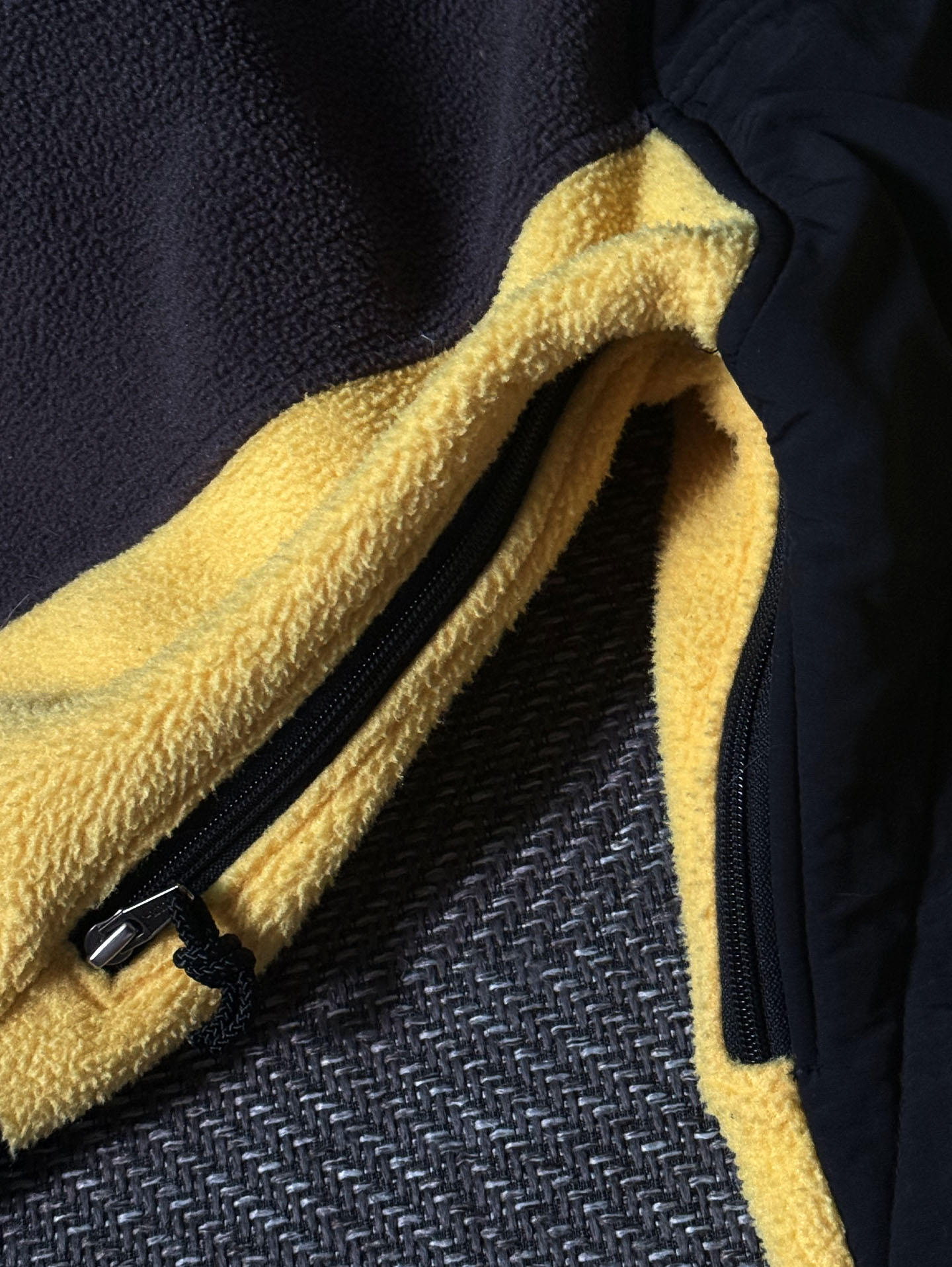 해당 제품은 옐로우 플리스 바디에 블랙 나일론 패널을 더한 하이브리드 구조로, 보온성과 내풍성을 동시에 고려한 설계가 돋보입니다. 전면 풀집업 방식에 하이넥 디자인으로 착용 시 체온 유지에 효과적이며, 양 사이드 지퍼 포켓과 밑단 스트링 디테일이 적용되어 실사용에서도 활용도가 높습니다.소매와 상단 패널의 나일론 원단 배치는 마찰이 잦은 부위를 보호하기 위한 구조로, 당시 아웃도어 웨어의 기능적 접근이 잘 드러나는 디테일입니다.