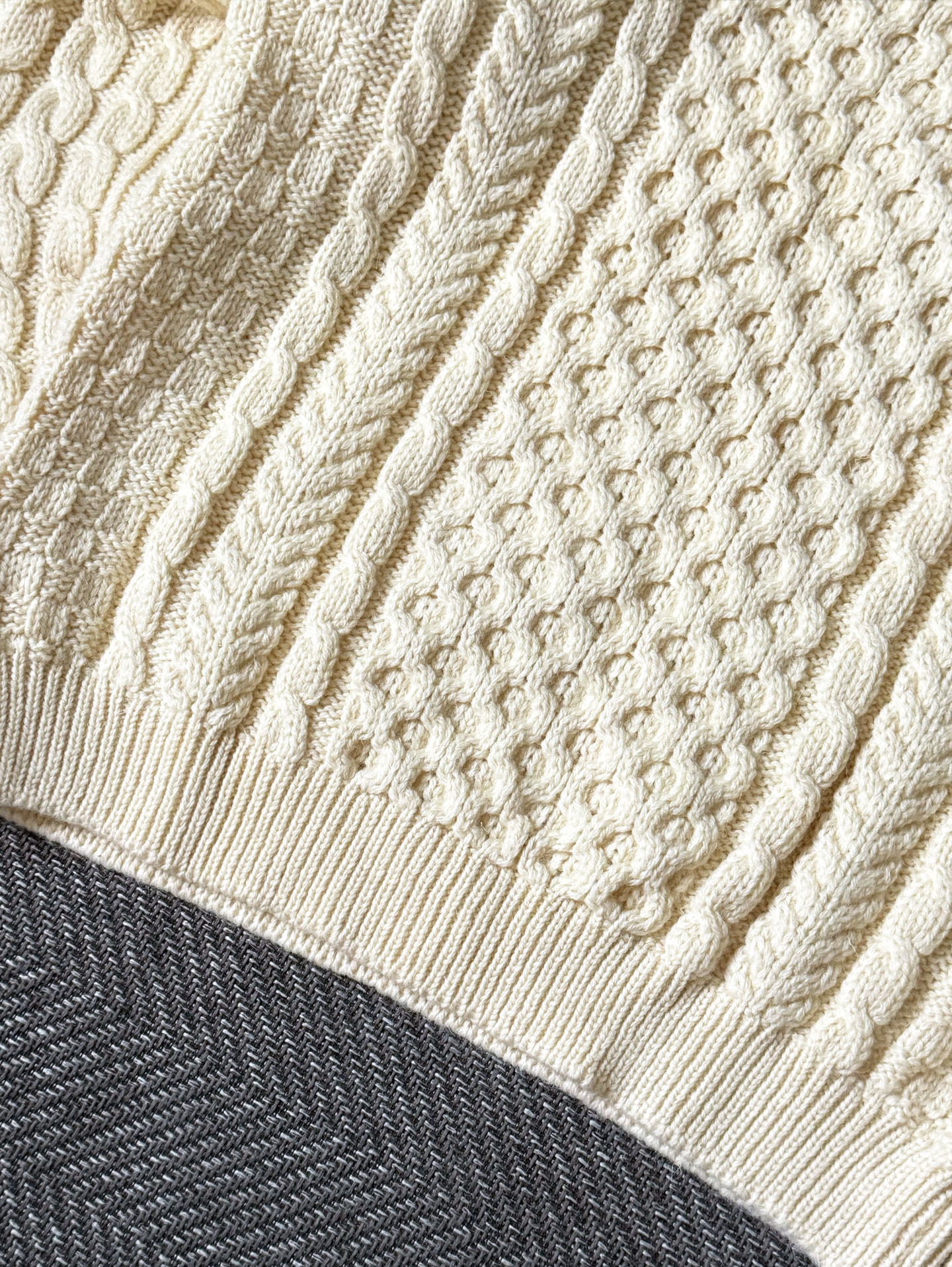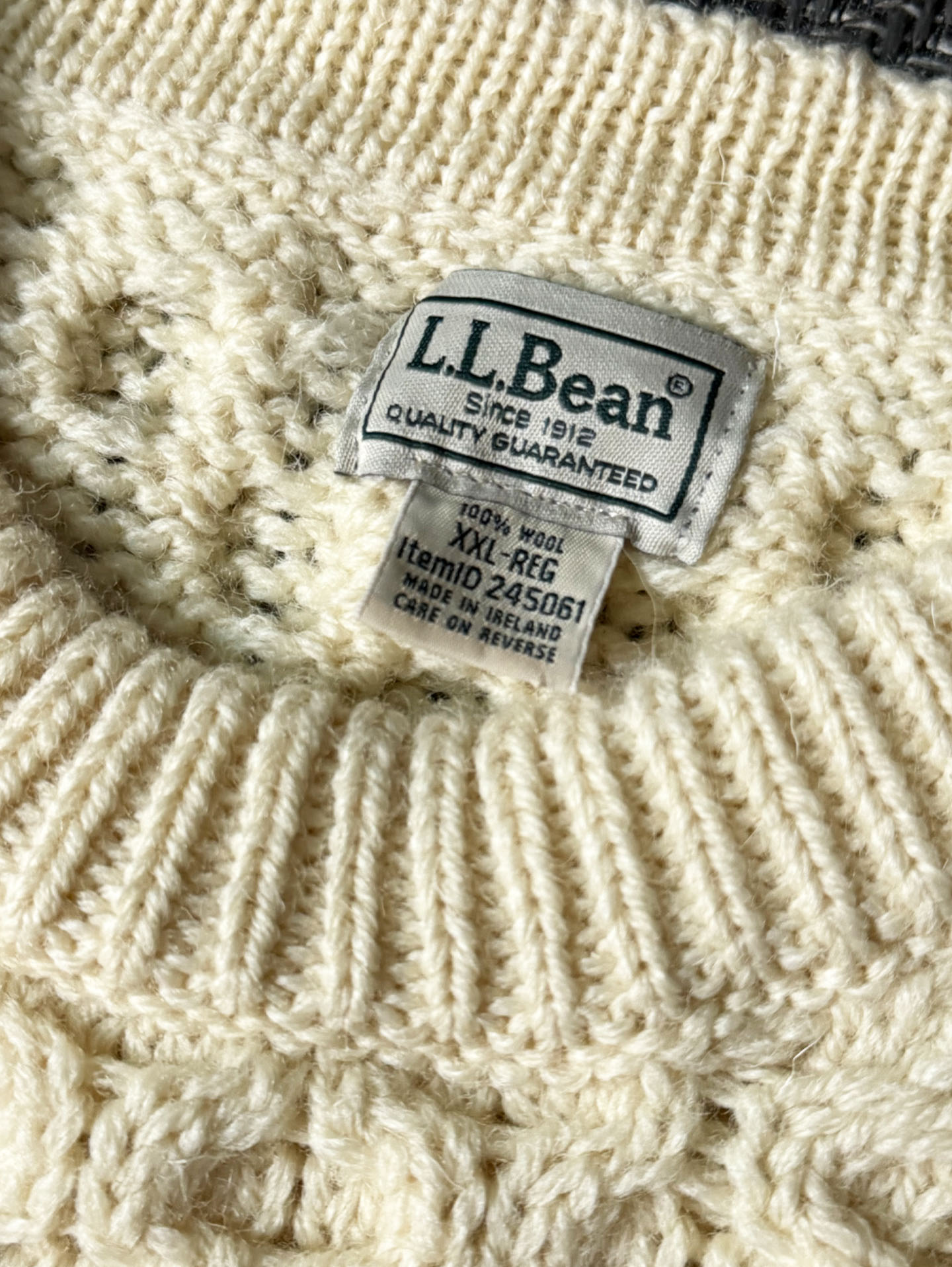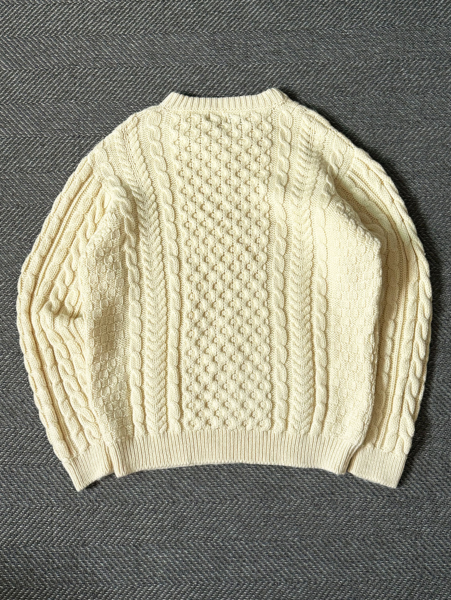 L.L.Bean의 클래식한 아이리시 피셔맨 니트 스웨터입니다. Made in Ireland 제품으로, 전통적인 아란 케이블 패턴이 입체감 있게 짜여진 모델입니다. 100% 울 소재로 제작되어 묵직하고 탄탄한 조직감을 가지고 있으며, 중앙의 허니콤(버블) 패턴과 좌우 케이블 짜임이 조화롭게 구성된 정통 피셔맨 디자인입니다. 크림 컬러 특유의 부드러운 톤은 데님, 슬랙스, 울 팬츠 등과 자연스럽게 매칭됩니다. 90년대 후반에서 00년대 초반 생산으로 추정되며, 당시 L.L.Bean 특유의 견고한 만듦새가 잘 느껴지는 모델입니다. 전체적으로 양호한 컨디션을 유지하고 있습니다. 볼드한 실루엣의 XXL 사이즈로, 여유 있는 핏 연출이나 오버사이즈 스타일링에도 적합합니다. 클래식 아메리칸 아웃도어 감성을 담은 헤비 게이지 울 피셔맨 니트를 찾으시는 분들께 추천드립니다.