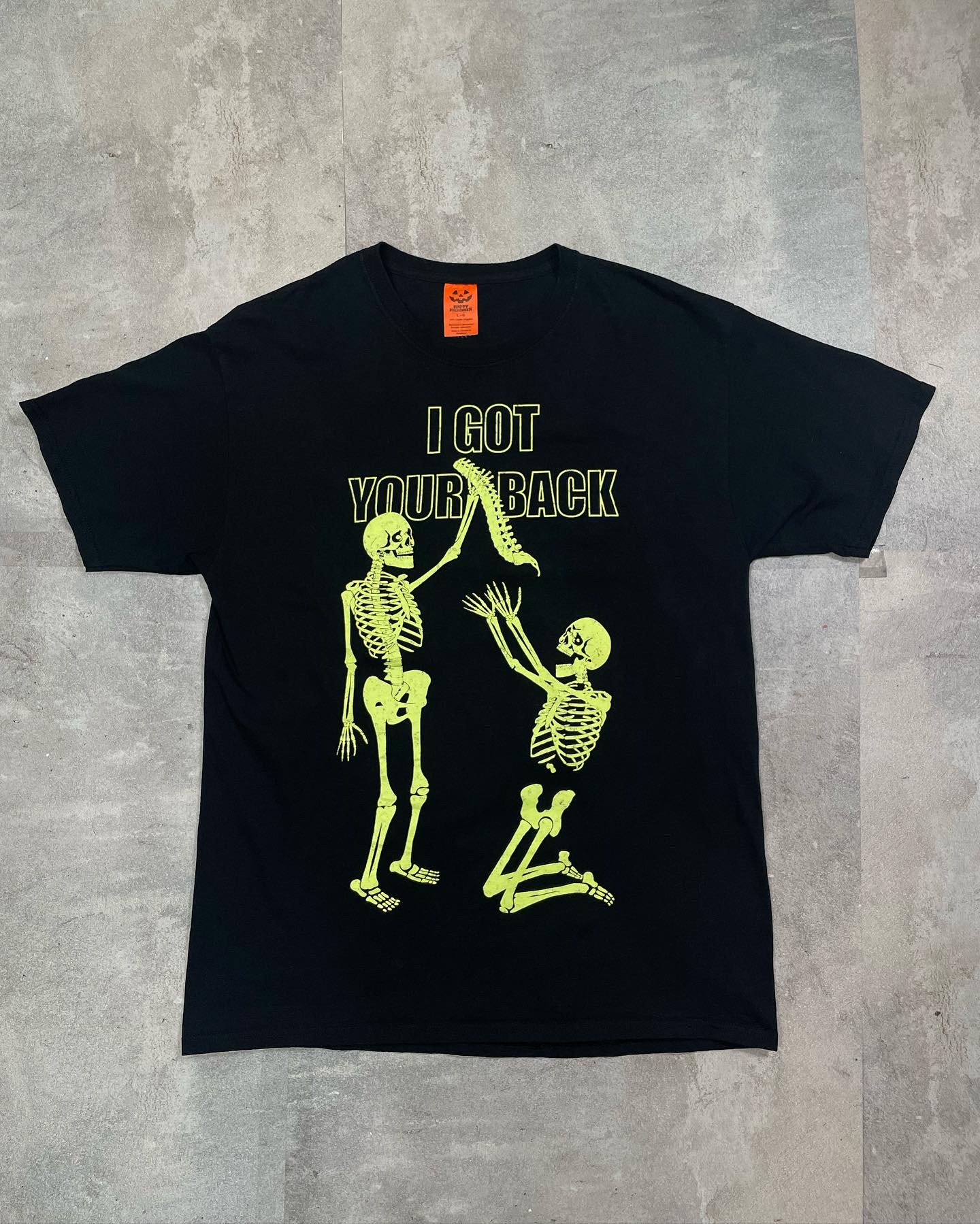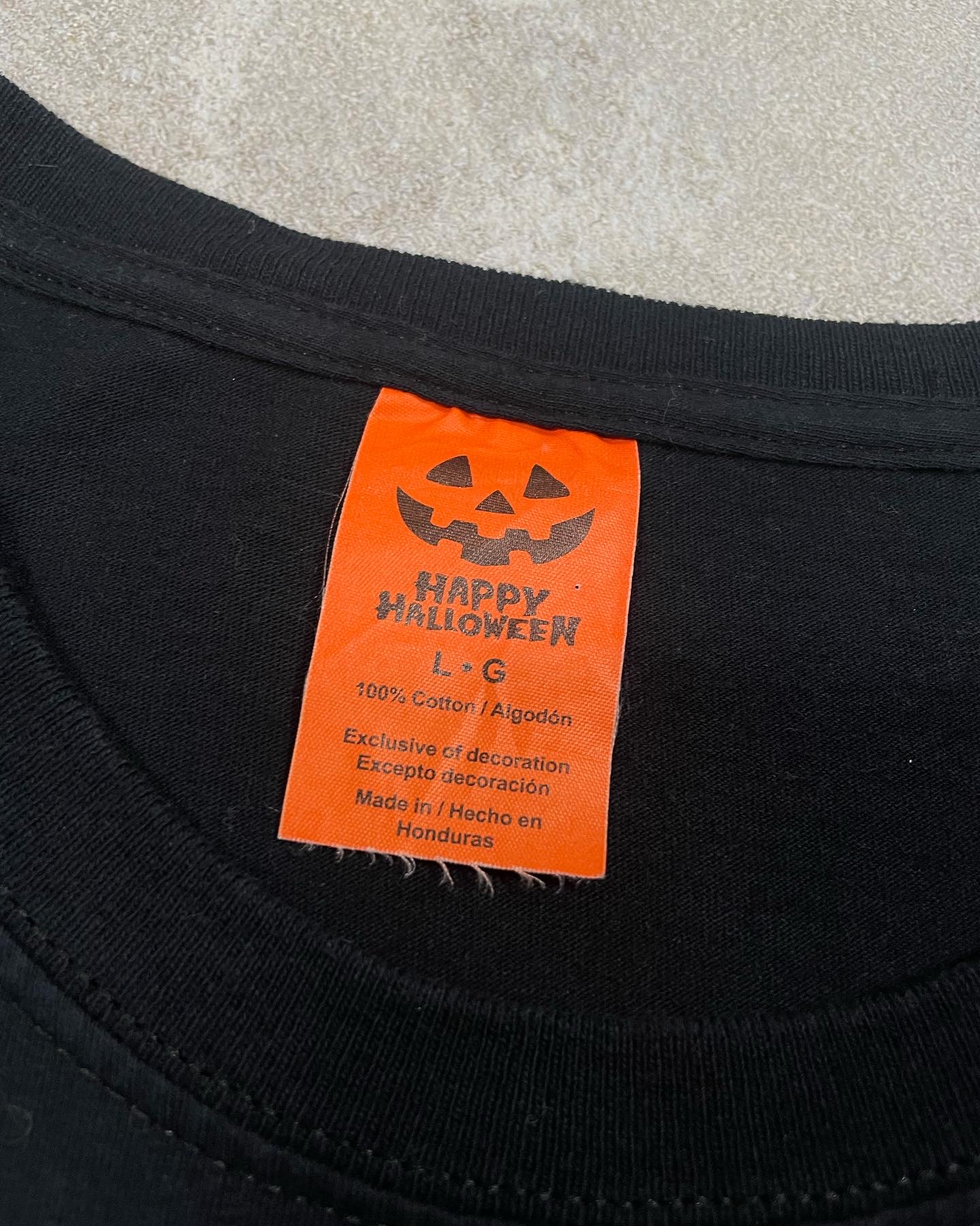 미국 해피할로윈사의 빈티지 티셔츠입니다. 할로윈 바이브에 어울리는 유쾌한 프린팅이 매력적이며 야광으로 되어있어 밤에는 빛나는 나염 프린팅입니다. 하자 및 데미지 없는 훌륭한 컨디션이며 실측 100-105 정도 되는 사이즈감입니다