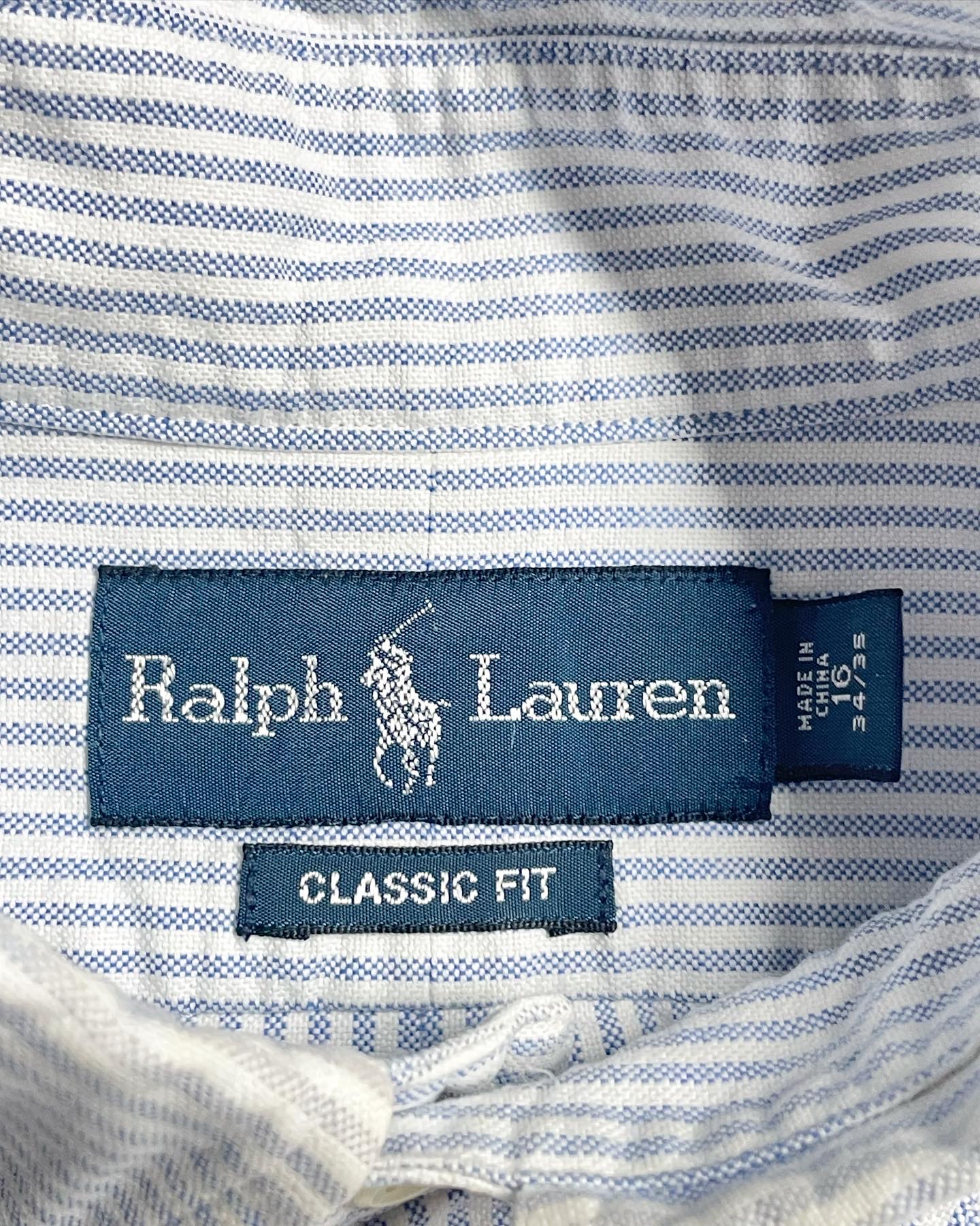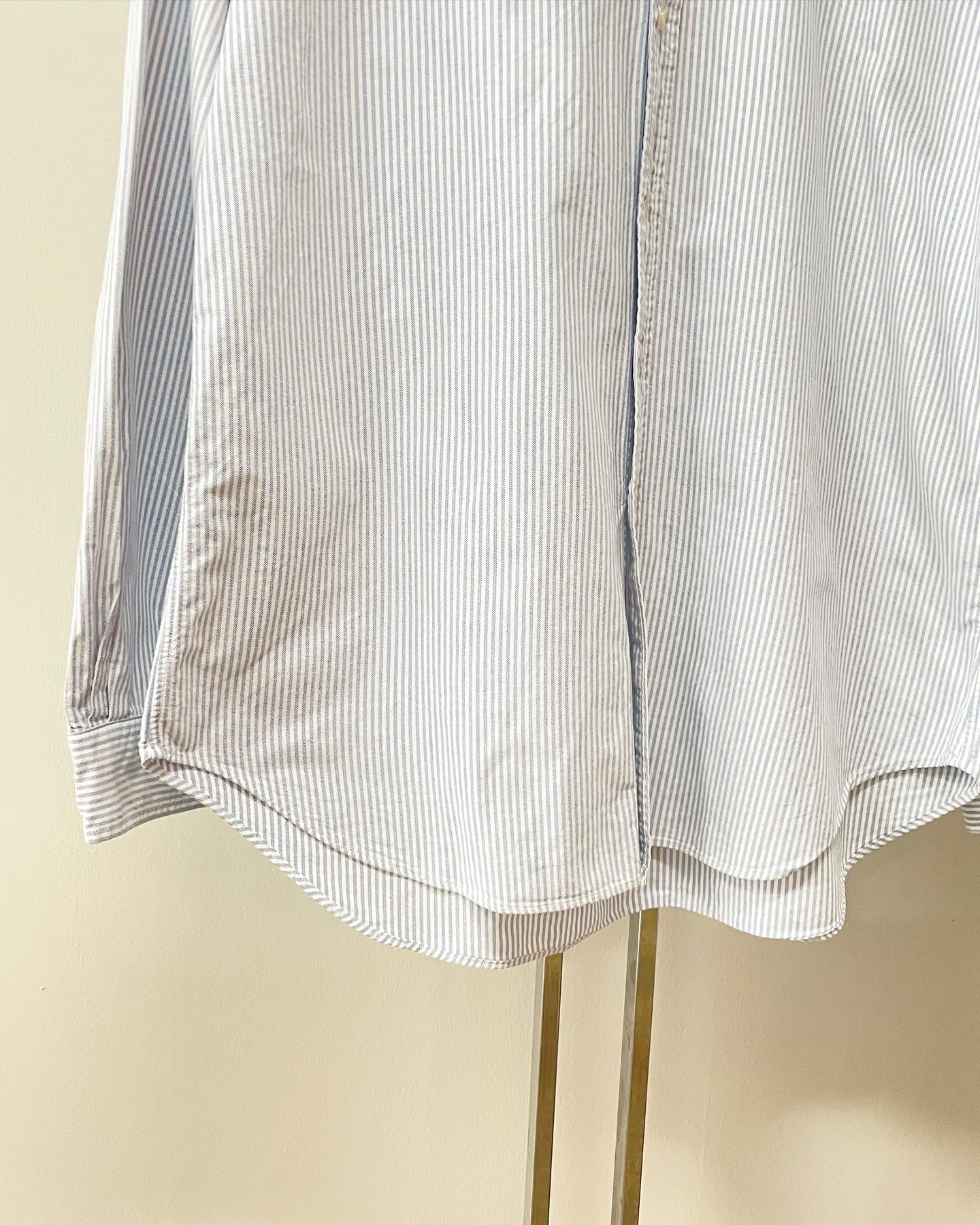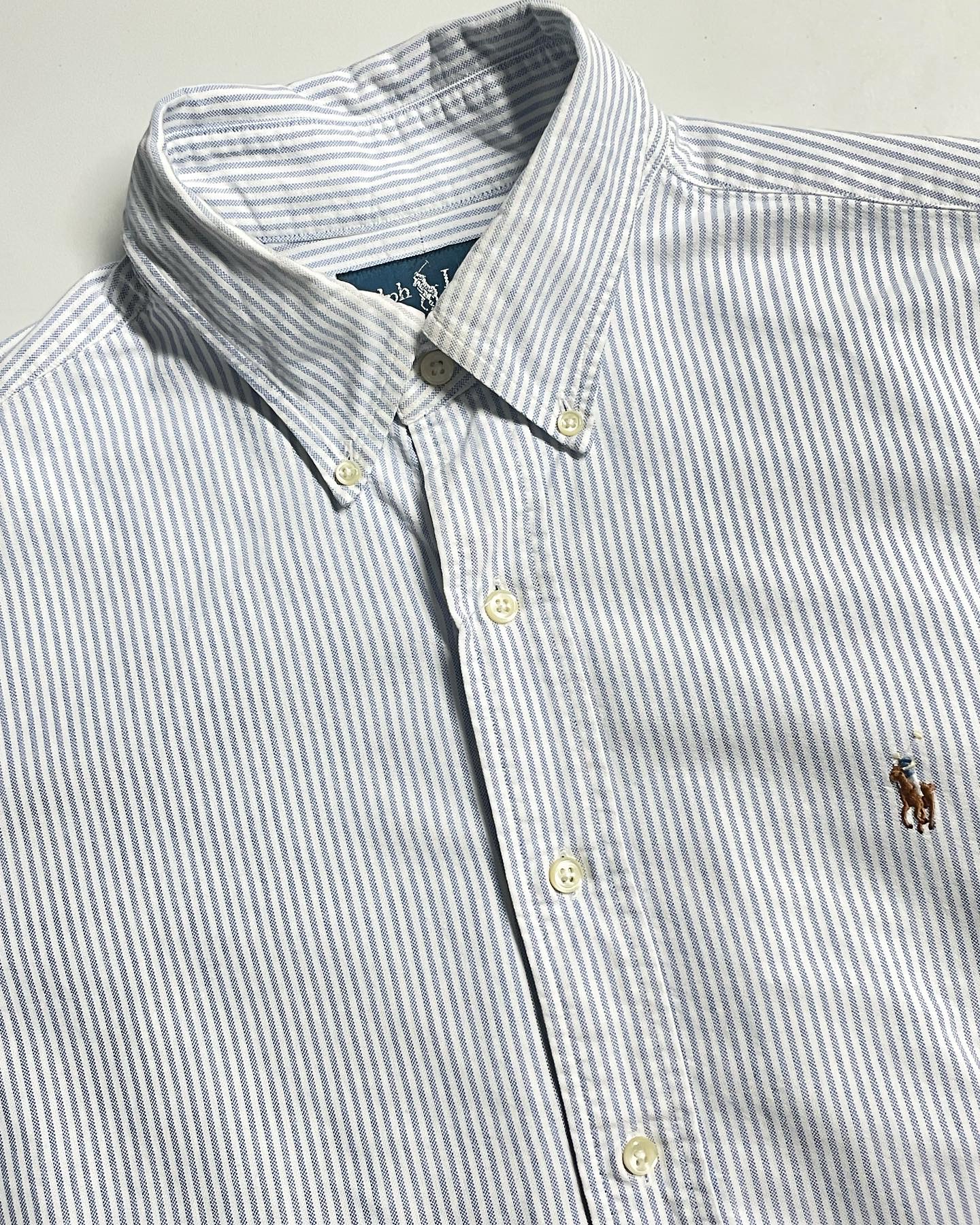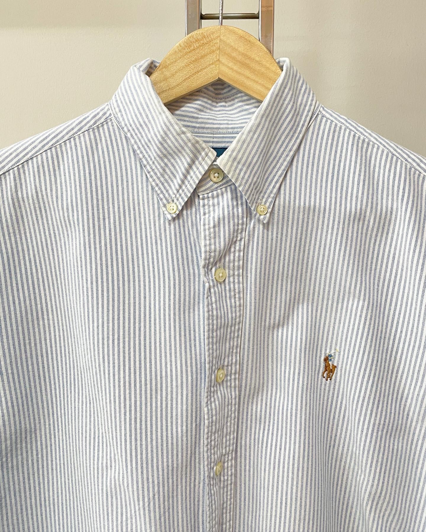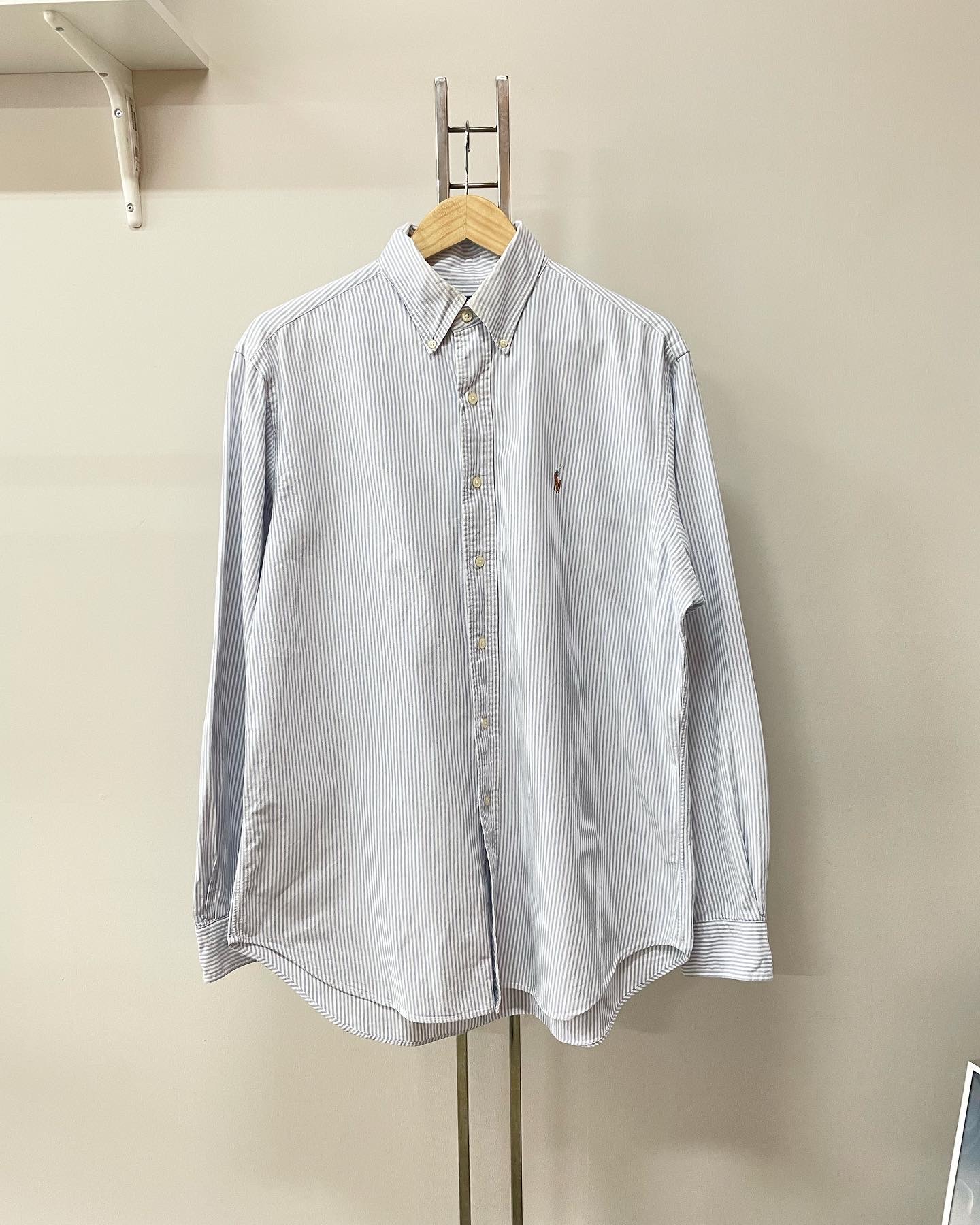 폴로 랄프로렌 클래식핏 셔츠입니다. 하늘색 스트라이프 패턴의 컬러가 매력적이며 카라부분 사용감 외에 준수한 컨디션입니다. 실측 105 정도 되는 사이즈감입니다.