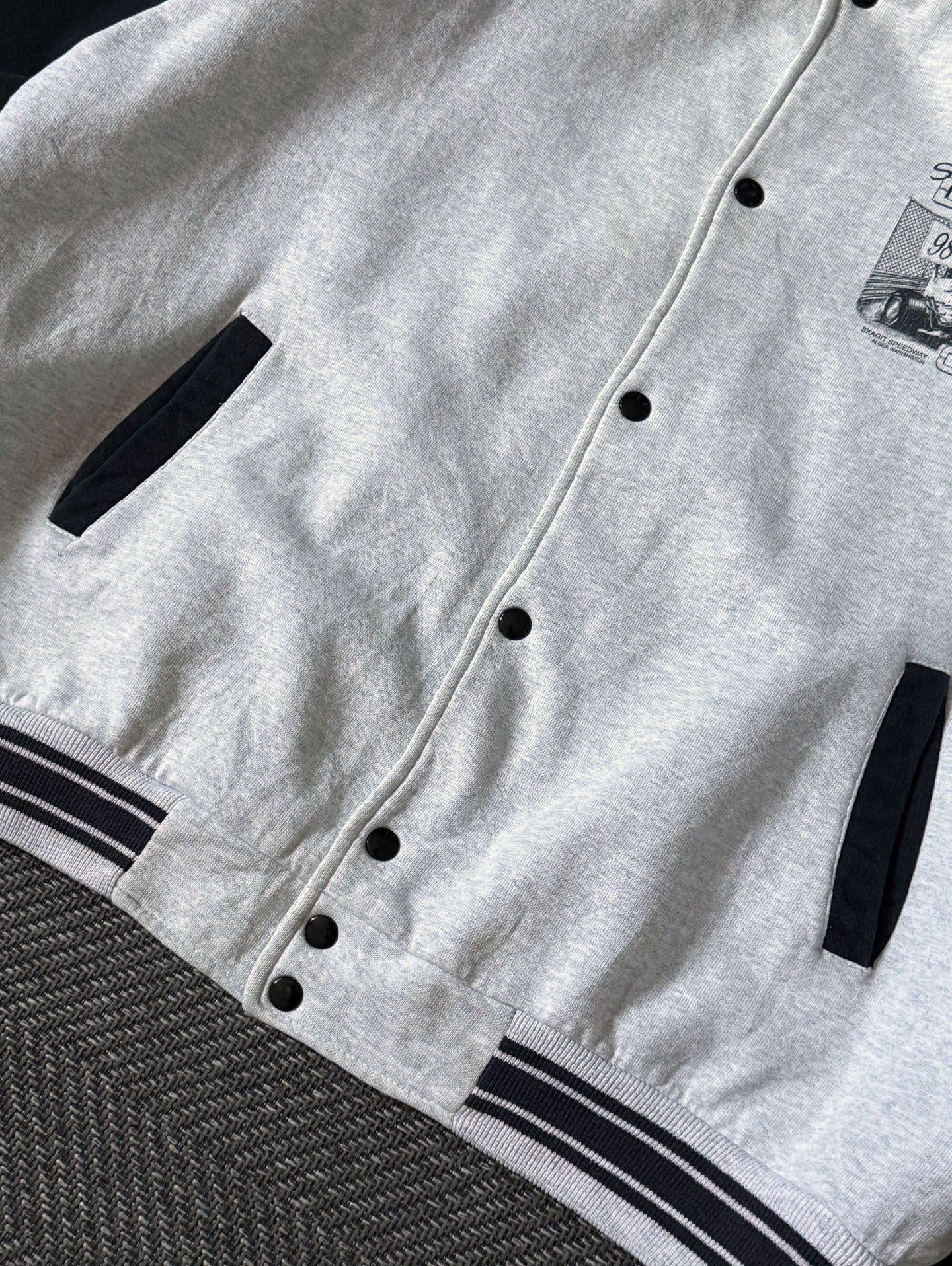미국 베이직웨어 브랜드 Fruit of the Loom의 SUPER COTTON 라인으로 제작된 바시티 자켓으로, 1998년 ‘Dirt Cup’ 레이싱 이벤트를 기념해 제작된 아이템입니다. 전면과 후면에 동일하게 들어간 ‘98 Dirt Cup’ 그래픽 프린팅이 특징이며, 당시 레이싱 문화의 무드를 그대로 담고 있는 빈티지 피스입니다. 그레이 바디에 블랙 슬리브 조합의 클래식한 바시티 컬러 밸런스와, 넥과 밑단의 스트라이프 립 디테일이 안정적인 실루엣을 만들어줍니다. 스냅 버튼 방식으로 간편하게 착용 가능하며, 적당한 두께감으로 봄·가을 시즌 가볍게 걸치기 좋은 제품입니다. 전면 중앙부에 눈에 잘 띄지 않는 미세한 오염이 존재하지만, 그 외에는 전체적으로 양호한 컨디션을 유지하고 있습니다. 90년대 레이싱 그래픽 특유의 분위기와 데일리 착용 모두 가능한 매력적인 빈티지 자켓입니다. 실측 110 정도 되는 사이즈입니다.